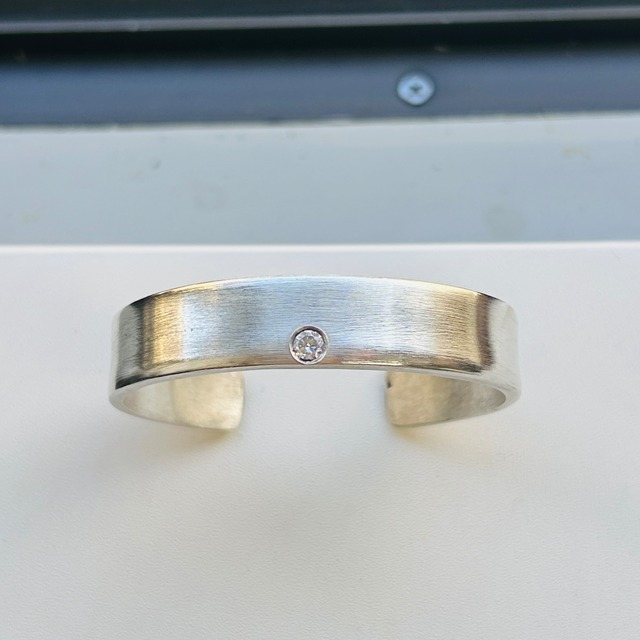 オフセットな位置にクリアストーンが埋め込まれたファッション・バングル。ツヤを抑えたセミマット仕上げ。ステンレスのような質感です。中は空洞で開口部分に穴がが開いており、重さをあまり感じない軽い作りです。着画ではよく似た質感のフランスシルバー、セミマットリングと合わせています。 ●状 態 Good ●サイズ 内径ヨコ5.5cm|内径タテ5cm|幅1.25cm|開口2.4cm|重量17g