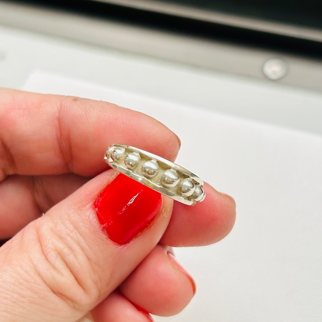 粒々ペブルのバンドリング。ペブルは上半分だけ、トップに向けて少し幅が広がり、厚みも少し増したデザインです。立体感があり手元で映えるデザイン。合わせやすく使い勝手の良いリングです。12号中指、14号人差し指に着用できます。「925」刻印。 ●状 態 Good ●サイズ 14号|重量3.6g ・ヴィンテージ品ですので在庫や再入荷の予定はありません。 ・その他、気になることがあれば気軽にご質問くださいませ。
