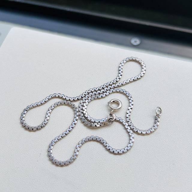 華奢なリンクチェーンネックレス。デザイン性のあるチェーン形状、2重巻きで着けることができる長さ、小さなトグルクラスプが特徴のユニークなチェーンです。グレートーンのセミマットなシルバーです。シックなブラックドレスに1連で着けるとスタイリッシュな雰囲気になりそう。2連ならシャツの間から覗かせるのもオシャレです。チャームを着けて違う楽しみ方もできます。刻印なしシルバー。コマが1つ曲がっています。 ●状 態 Good ●サイズ 長さ86cm|幅2.5mm|重量11.2g ・ヴィンテージ品です。在庫や再入荷の予定はありません。 ・その他、気になることがあれば気軽にご質問くださいませ。