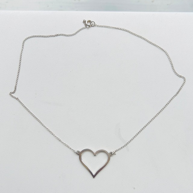 吊り下げタイプのハートネックレス。縦約2cmのアウトラインハートです。華奢なチェーンとペタっとしたハートで軽いネックレスです。ヘビーチェーンと重ねて着けたり、ハートロケットと合わせたり、etc.etc. 短いので他のネックレスと合わせやすいのも嬉しいですね。ハートの裏に「SIL」刻印。 ●状 態 Good ●サイズ 長さ40cm|ハート2.1cm x 2.8cm|厚み1.2mm|重量2.5g ・ヴィンテージ品ですので在庫や再入荷の予定はありません。 ・その他、気になることがあれば気軽にご質問くださいませ。