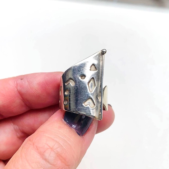 ハートや菱形、丸など落書き調の型押し模様がキュートなリング。ペナント(長細い旗)をクルンと巻いたようなラップデザイン。全体的に薄作りで着け心地の良いリングです。内側に「925」刻印。 ●サイズ 12号 ・ヴィンテージ品ですので在庫や再入荷の予定はありません。 ・その他、気になることがあれば気軽にご質問くださいませ。