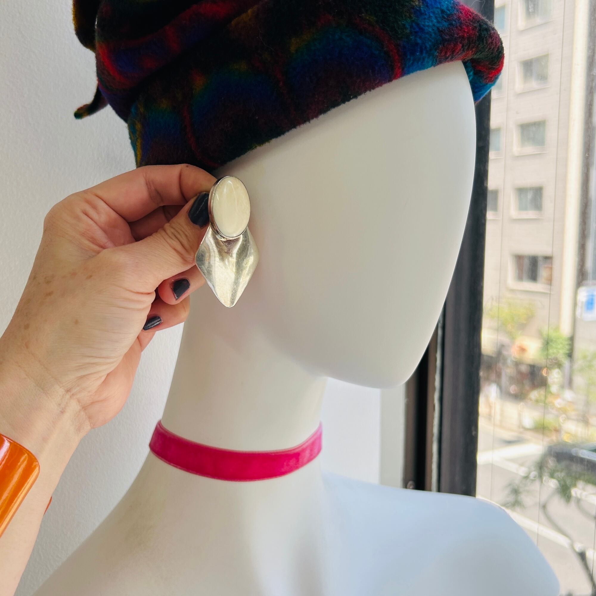 縦5.4cmの大きなピアス。アイボリーとシルバーのホワイトトーンが大人っぽくて素敵です。アイボリーカボションは動物の骨か牙の類いだと思います。ナチュラルな縞模様が見えます。シルバーの表面は全体に薄いスレ。キャッチは市販品です。針の長さ9mm。少し歪みあります。