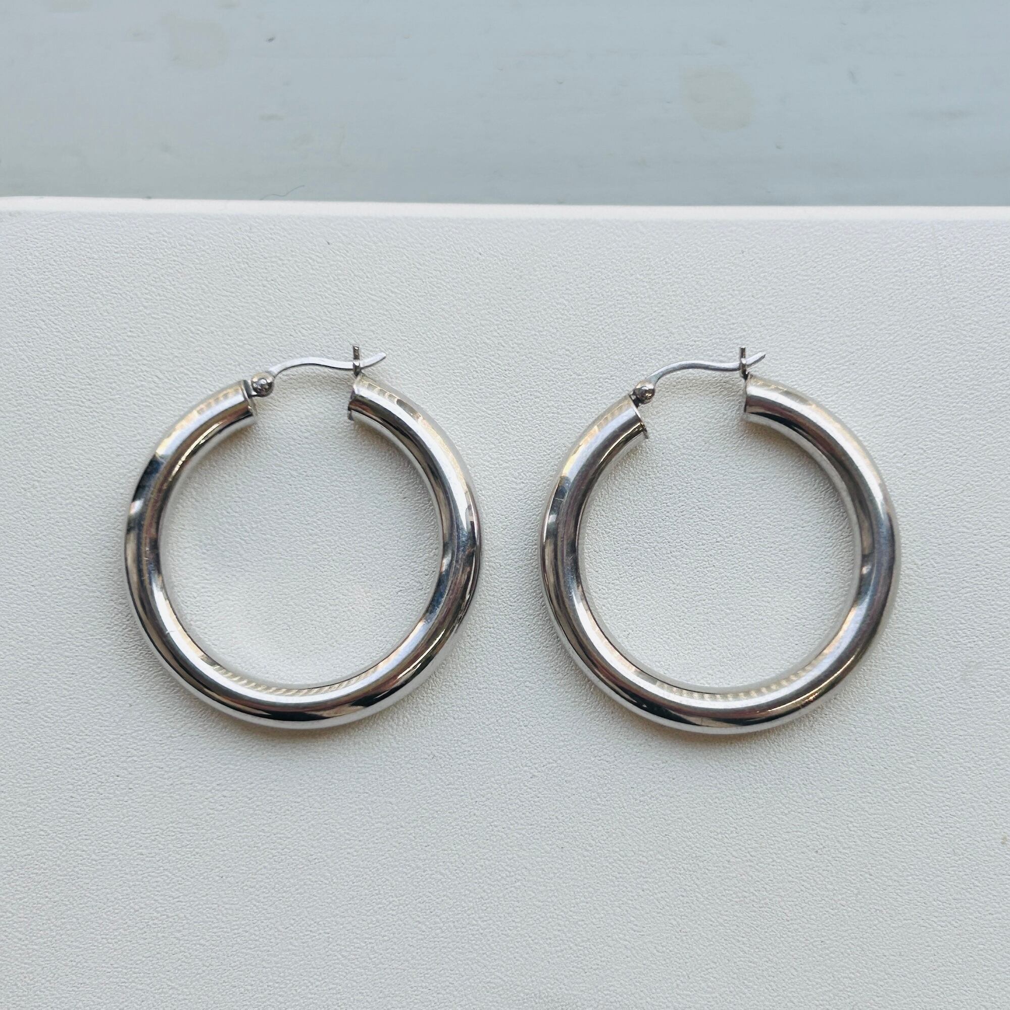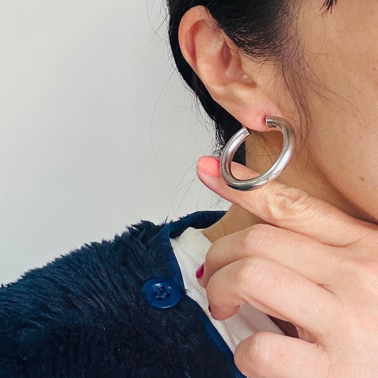 径5mmのチューブフープ。厚みがありツヤツヤ輝くフープはモダンで都会的な印象です。フープピアスは合わせやすくて便利。色々な形・サイズ違いで持ちたいですね。針に「ISRAEL」「925」。