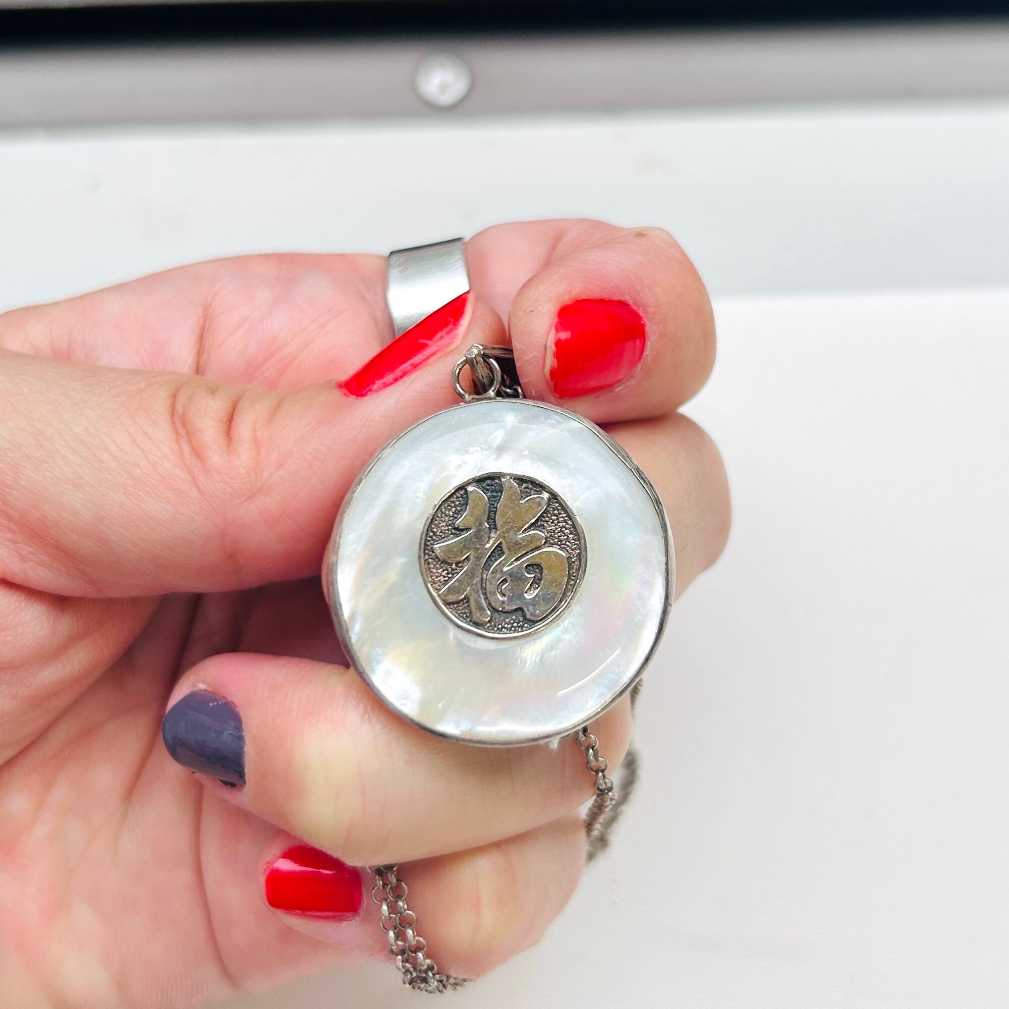 白蝶貝(Mother of Pearl)に「福」のディスクトップネックレス。海外から見るアジアな感じが可愛い漢字シリーズです。チェーンは小さな丸コマのロロチェーン。40cmはちょっと珍しい長さです。お手持ちのチャームとも合わせてみて下さい。チェーンもトップもシルバー部分が少し変色してダークになっています。OLDないい感じなのでそのままにしていますが、お届け前にクリーニングをご希望の場合はお申し付けください。