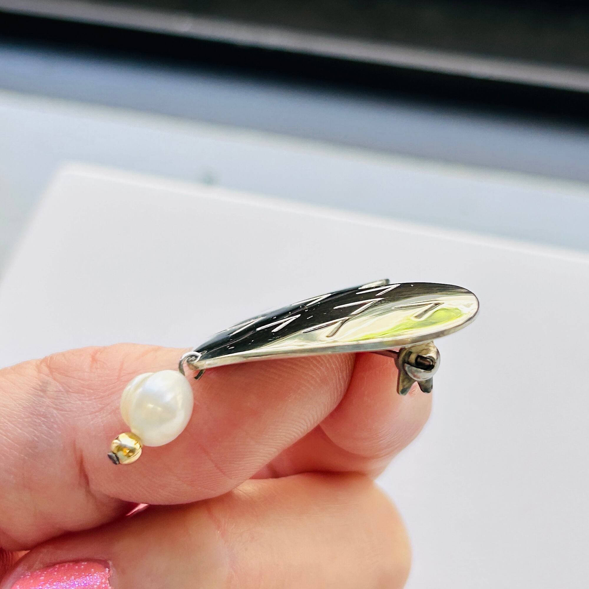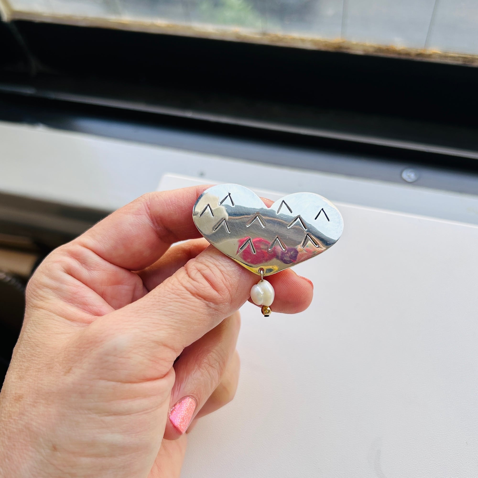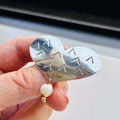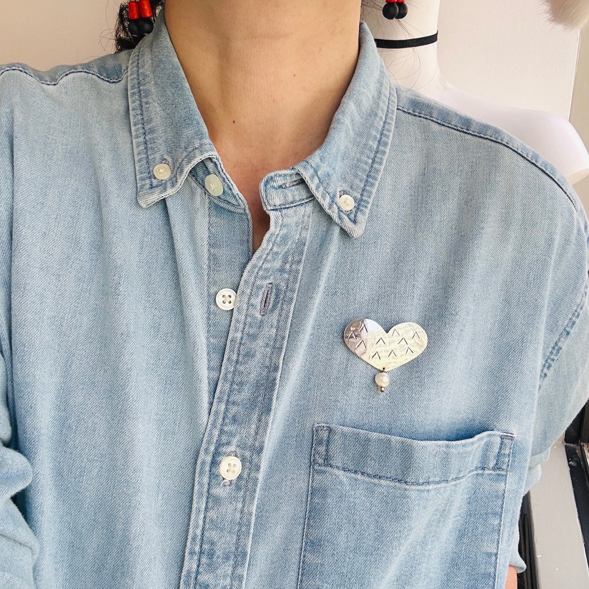 ハートにバロックパールがぶら下がったブローチ。(イミテーションパールではありません。)横長ハートに逆さV模様が入って全体的に可愛らしい雰囲気のブローチです。パールがあるとブラックコーデに映えそう:)キリっとした装いに可愛らしさを加えることが出来るブローチです。着画はイマイチですがシャツの中央に着けるのも可愛いです。シルバハートは中厚でしっかりした作り。ピンの動きに問題ありません。裏に「MEXICO」「925」。