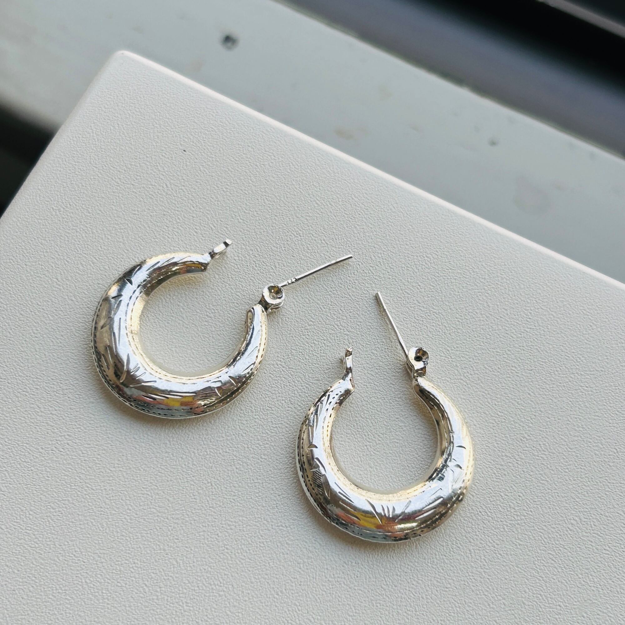 直径2.4cmの彫り模様フープ。下に向けて輪が太くなっている強弱ある丸型。優雅で大人な雰囲気です。中は中空ですので重さは気になりません。光の影響で凹んで見えるかもしれないですがフープに凹みはありません。まっすぐの針で使いやすいかと思います。二股にしっかり留まりますので外すときはフープを抑えて針先を押し上げて下さい。「925」刻印。