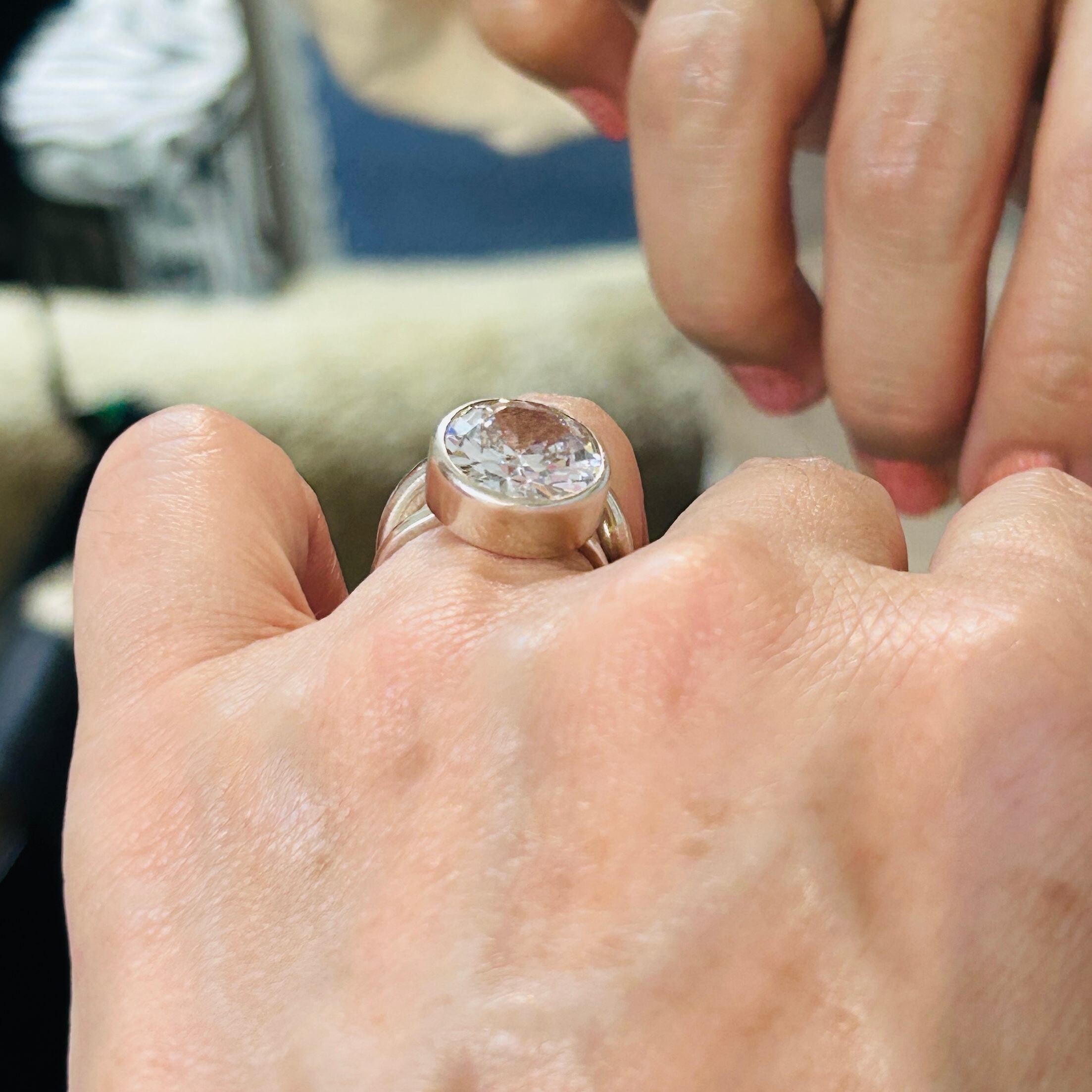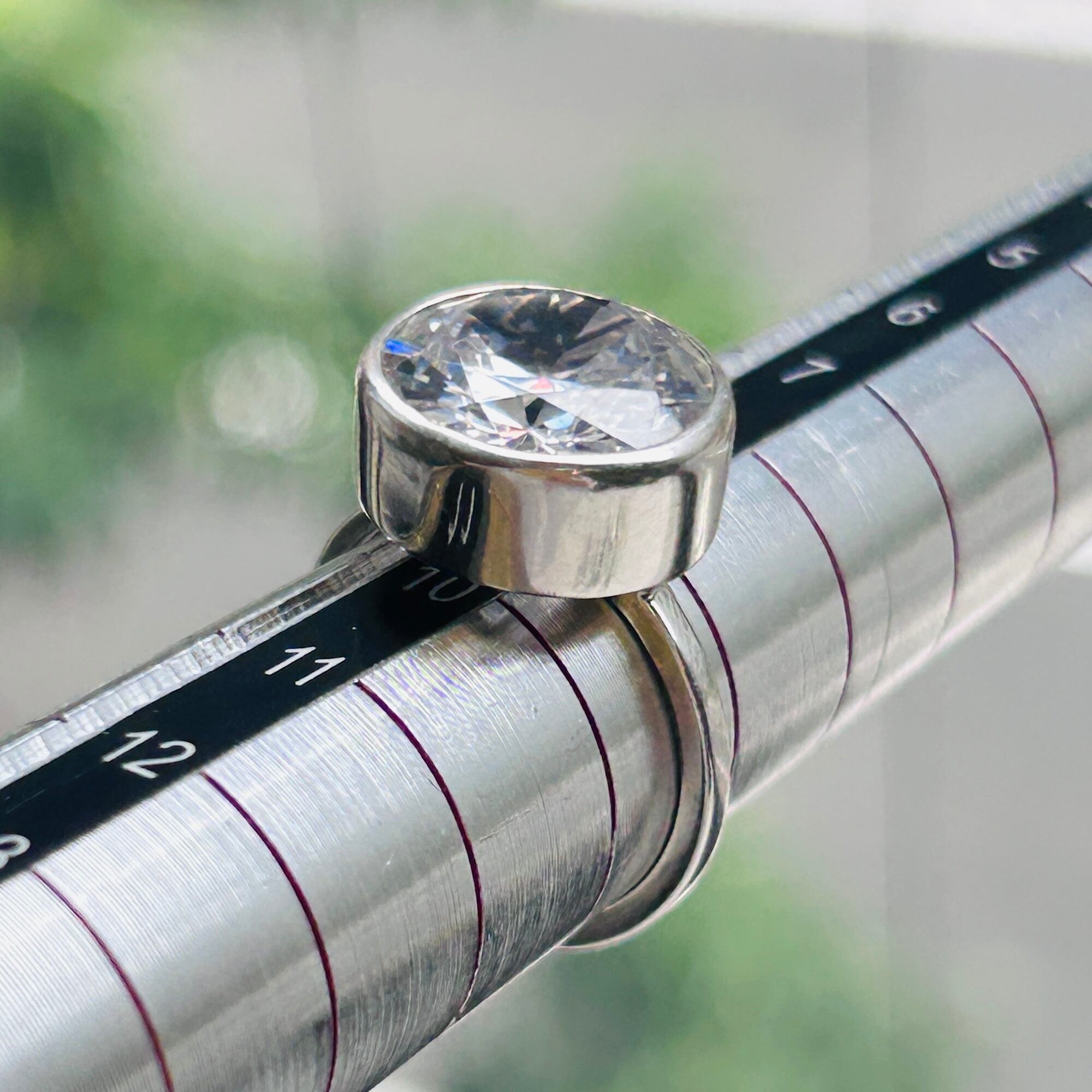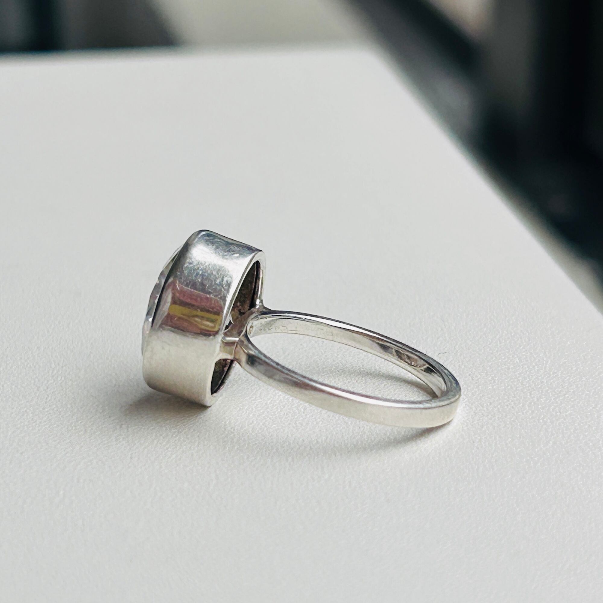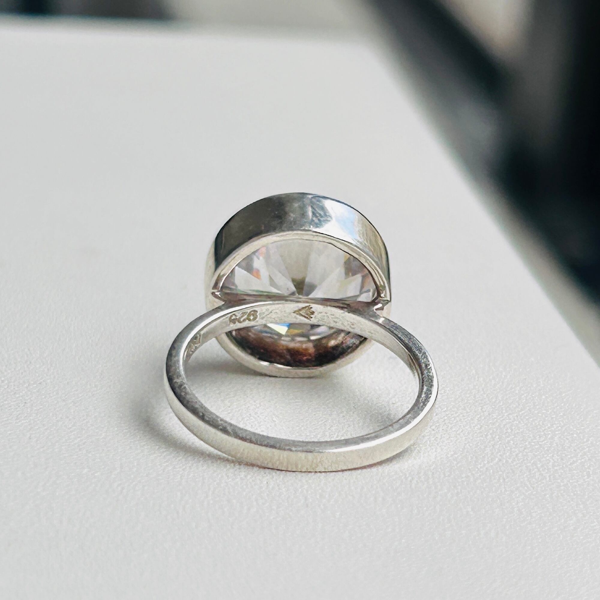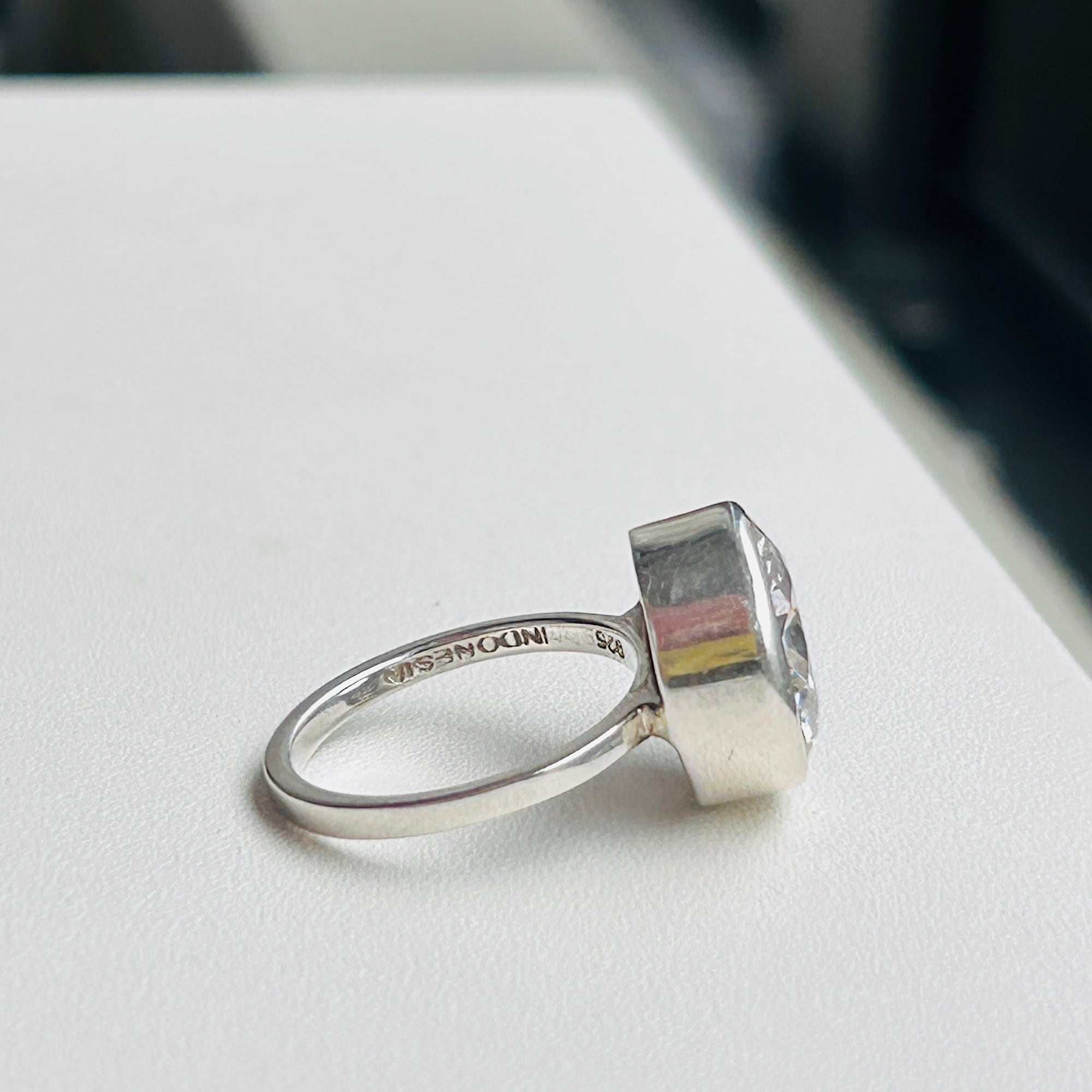 北欧風デザインのキラキラリング。キュービックジルコニアとシルバーで気軽に着けやすいカジュアルなリングです。シルバー部分は薄く、バンドが細いのでサイズ棒で9.5号位ですが私の薬指にやや緩いので着用感は9号以下。あまり緩すぎるとトップの重みで回転します。私は細いバンドリングで抑えるとピタっと指に固定されます。内側にSilpadaメーカーマークと「925」「INDONESIA」(Silpadaは1997年創業、アメリカドメスティックシルバージュエリーメーカーです。