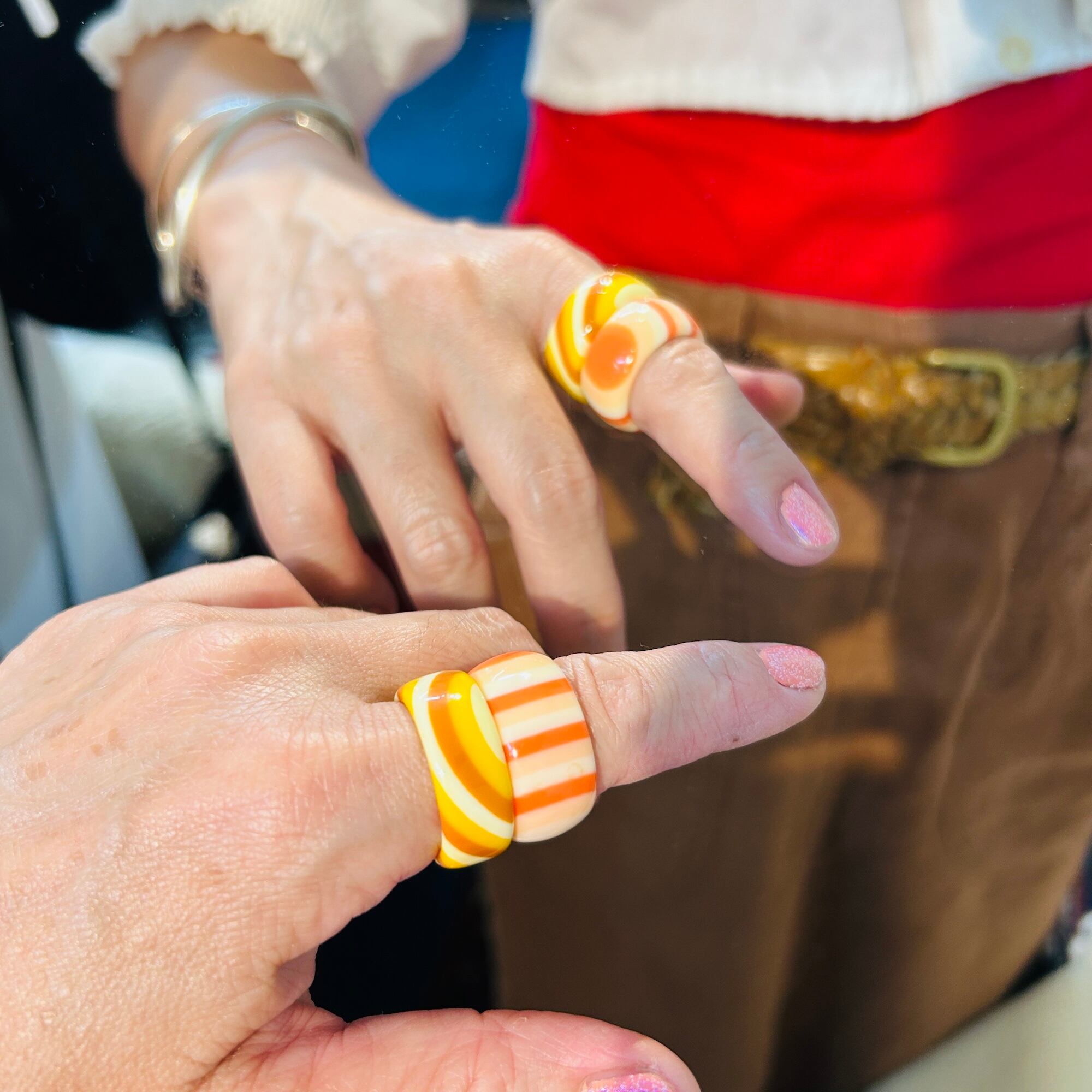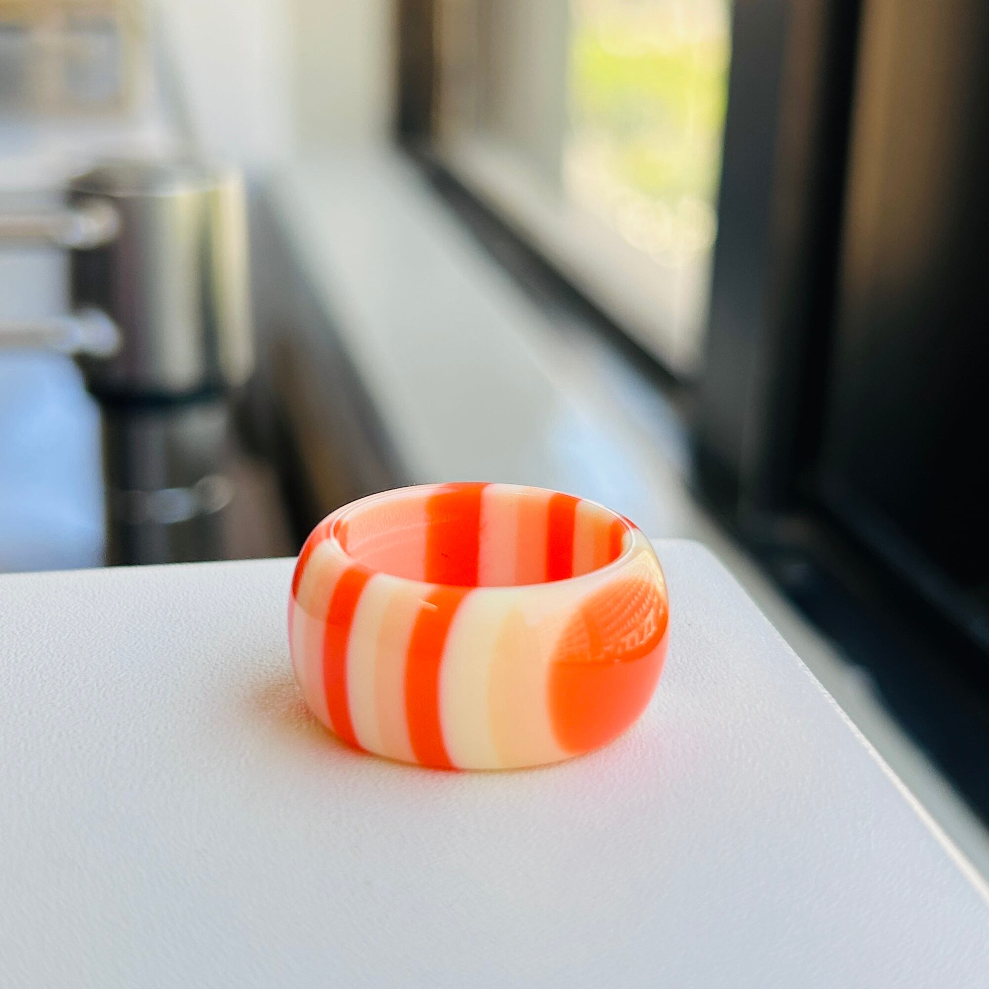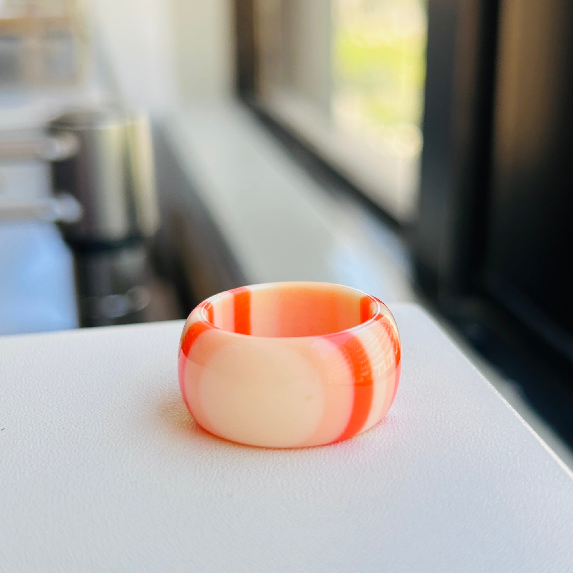レトロな縞模様が可愛いルーサイトリング。淡いサーモンピンクグラデーションです。着ける向きを変えて模様の出方も楽しんでもらえます。表面にツヤがあるキレイなコンディションです。幅太で少し膨らみのあるカタチをしています。私は普段14〜15号の人差し指にちょうどいいです。特筆すべきダメージはありません。