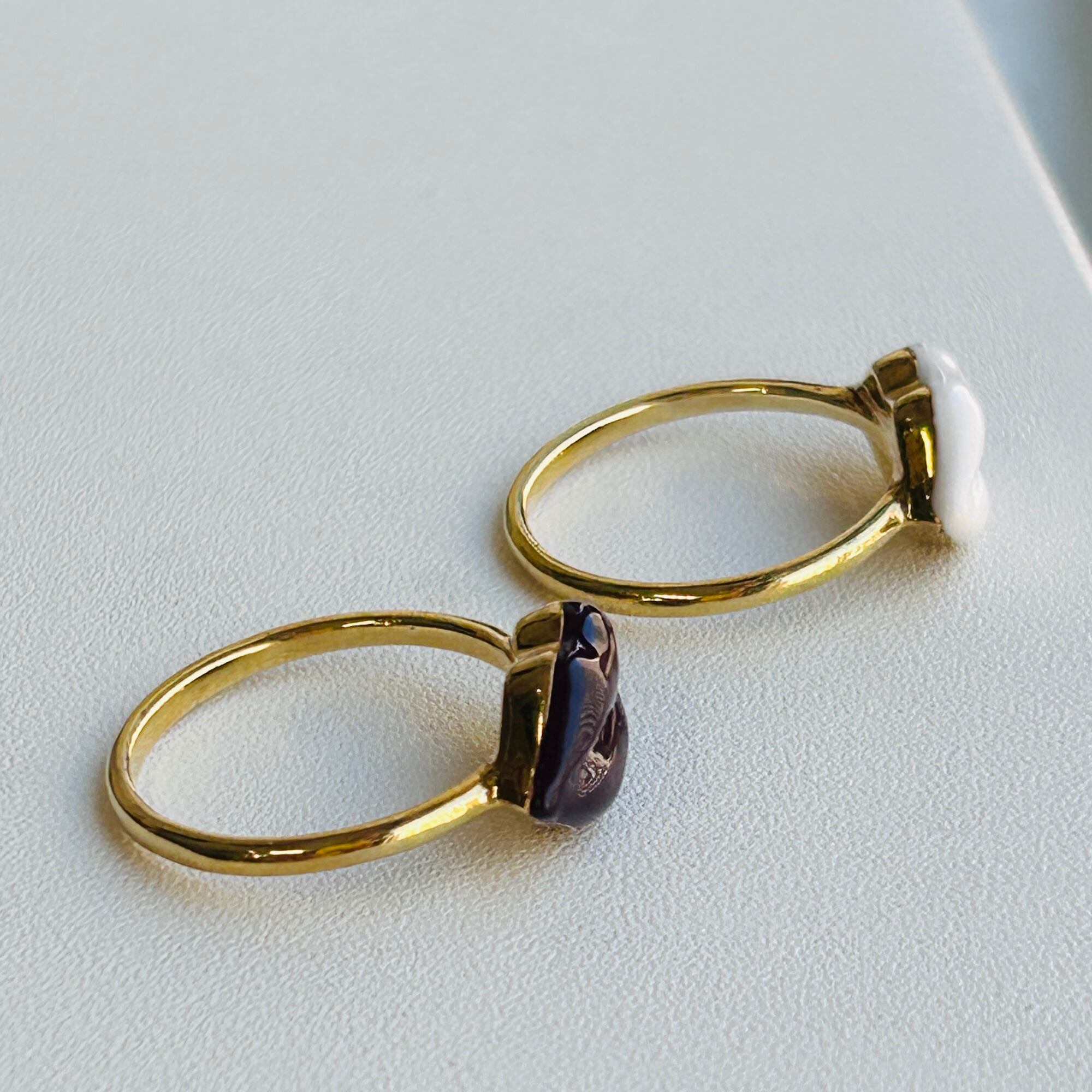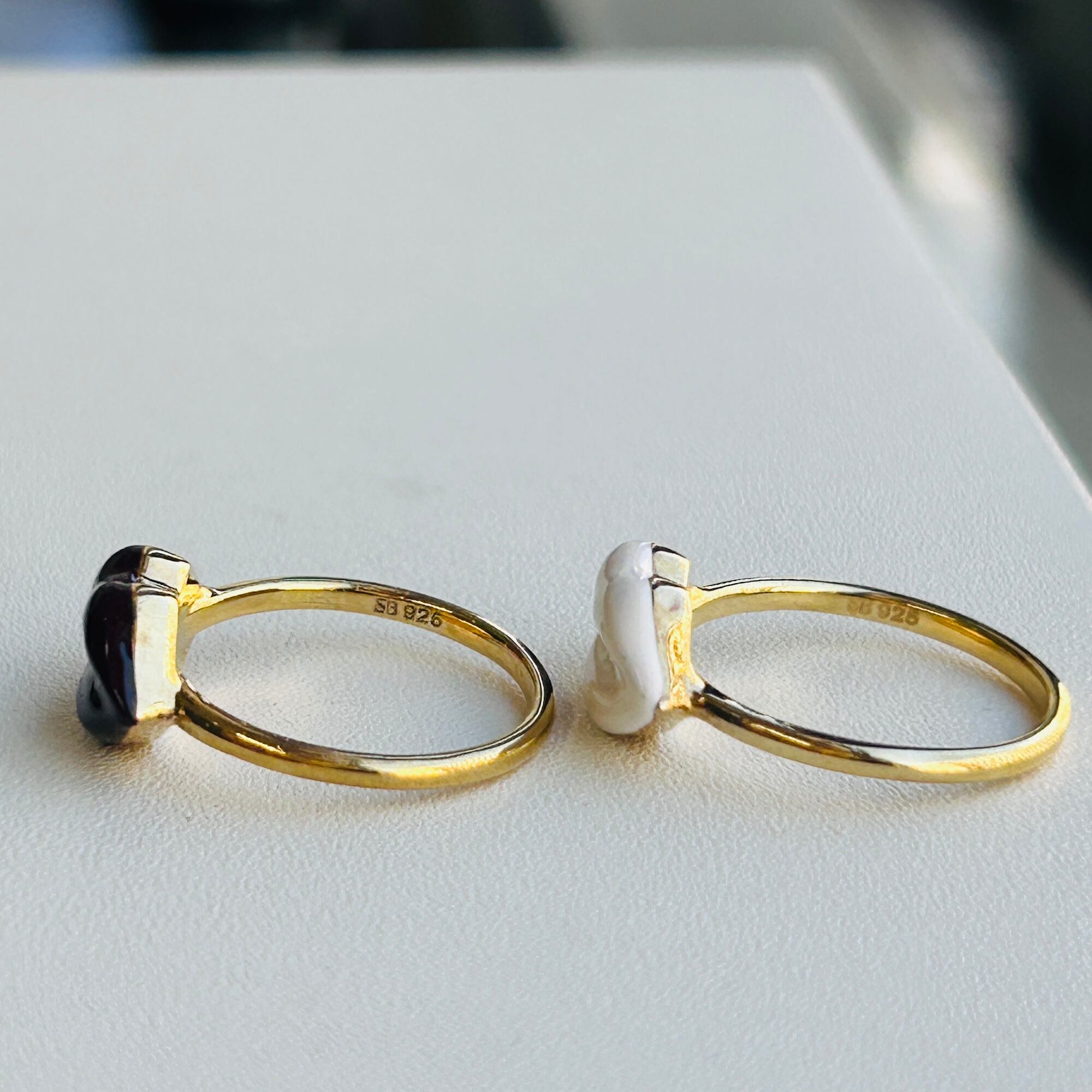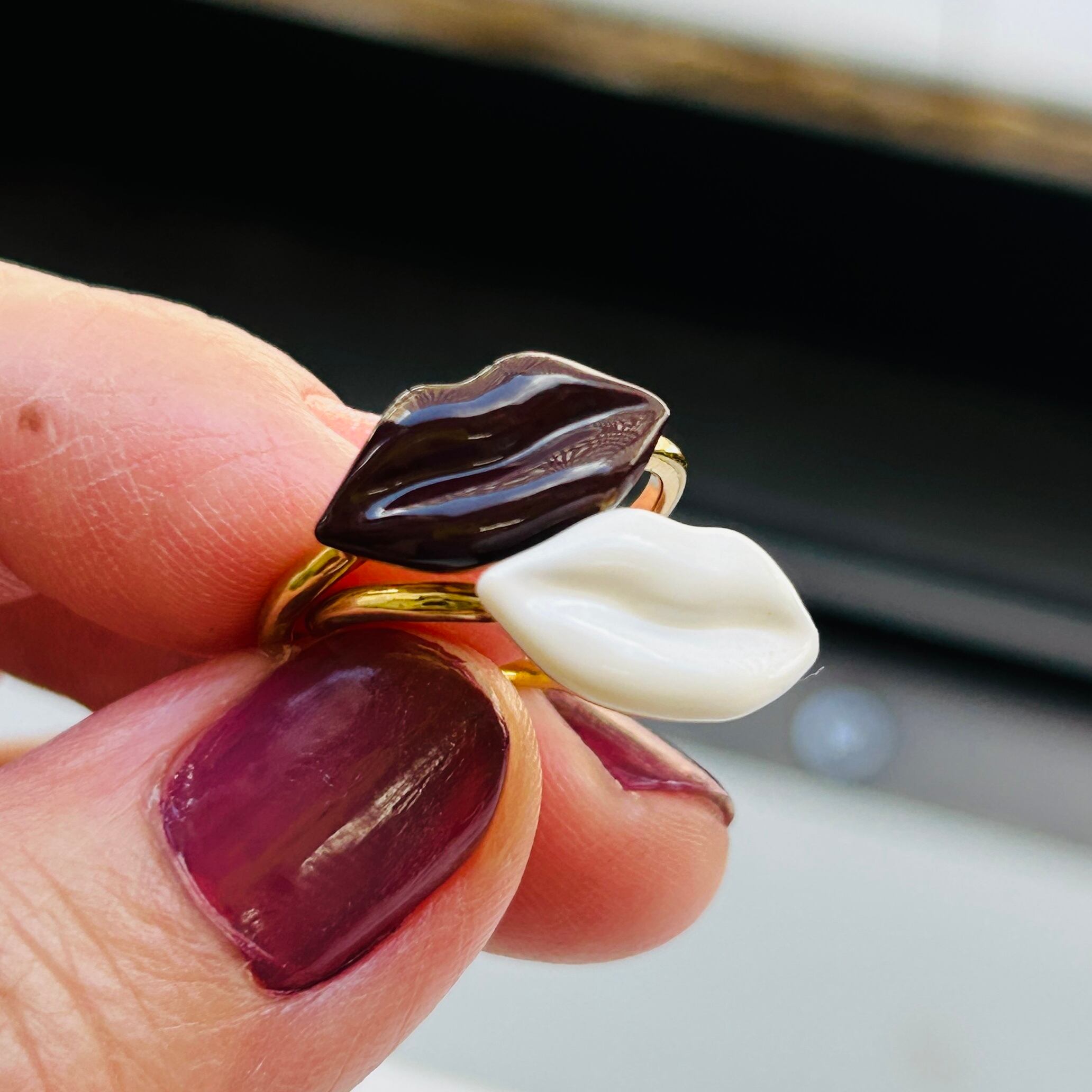 可愛くて楽しいLipデザインリング。唇の材質はエナメル樹脂のような感じでメタルやストーンではありません。ぽってりした金メッキの下はシルバー925です。ツルンとしたバンドで着脱しやすいです。内側に「SB925」刻印。メーカーの詳細は分かりません。あまり使用感の見られないキレイなお品。在庫は白とボルドーの2色。サイズが違いますがどちらも中指と人差し指に着用できます。個人的には2個着けが可愛いと思います!