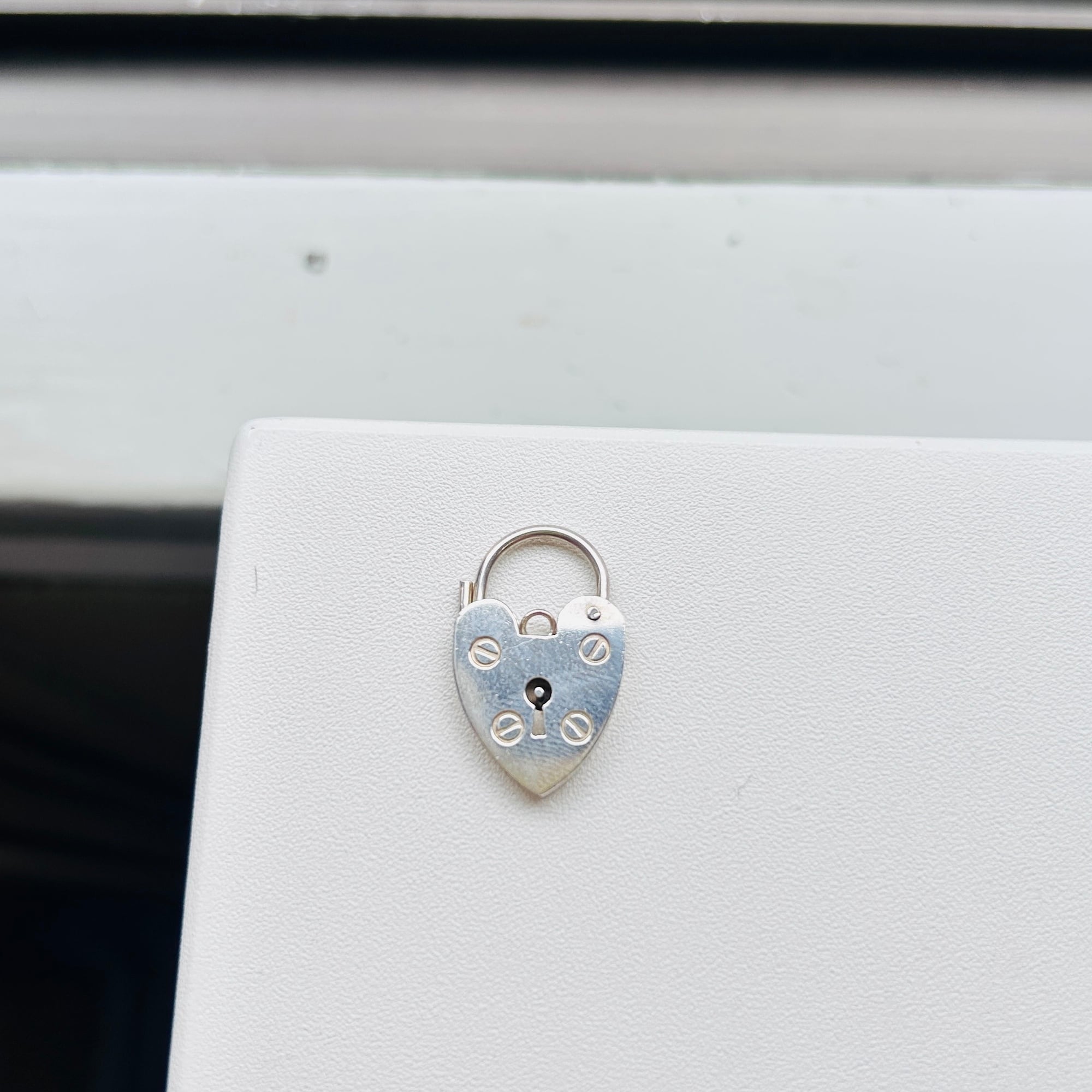 イギリス・ヴィンテージシルバーブレスレットに付いていたハート型南京錠チャームです。裏にイギリス・バーミンガムを表すアンカーマーク。年代を表すアルファベットから1973年製であることが分かります。在庫の丸カンを付けてお届けします。