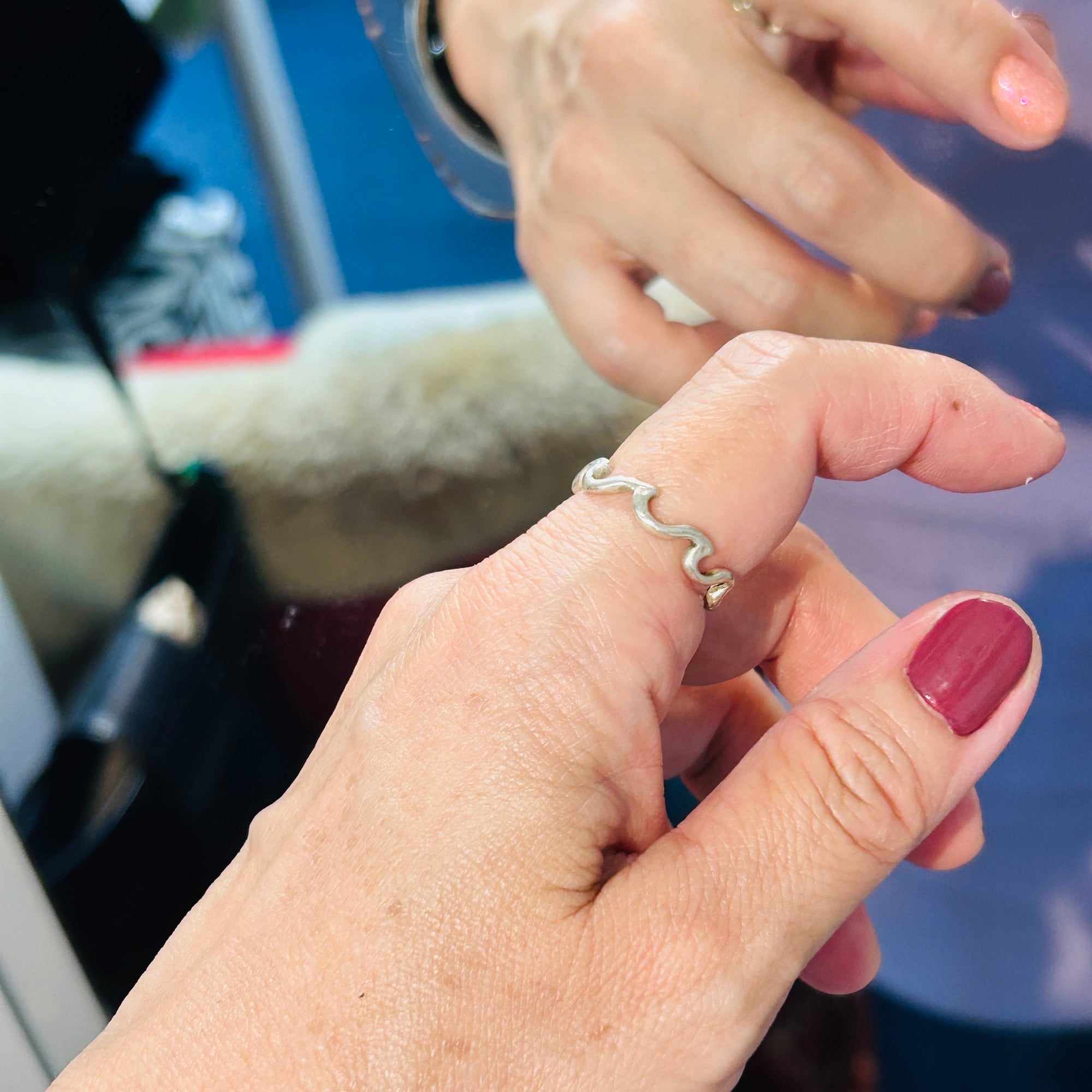 波模様みたいなバンドリング。ハンドメイドらしい不揃いな波が1点物という感じがしていいと思います。セミマットなシルバーです。さりげないアクセントになるリング。内側にアーティストサイン「DVH」と「925」刻印。