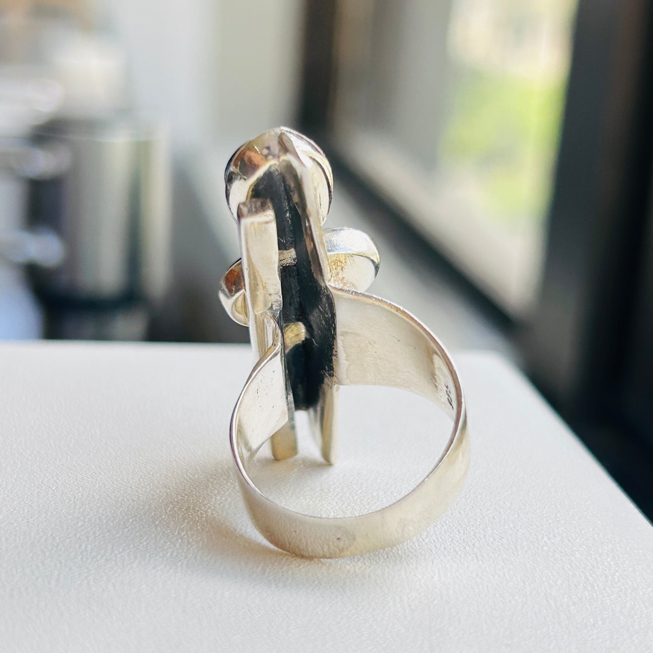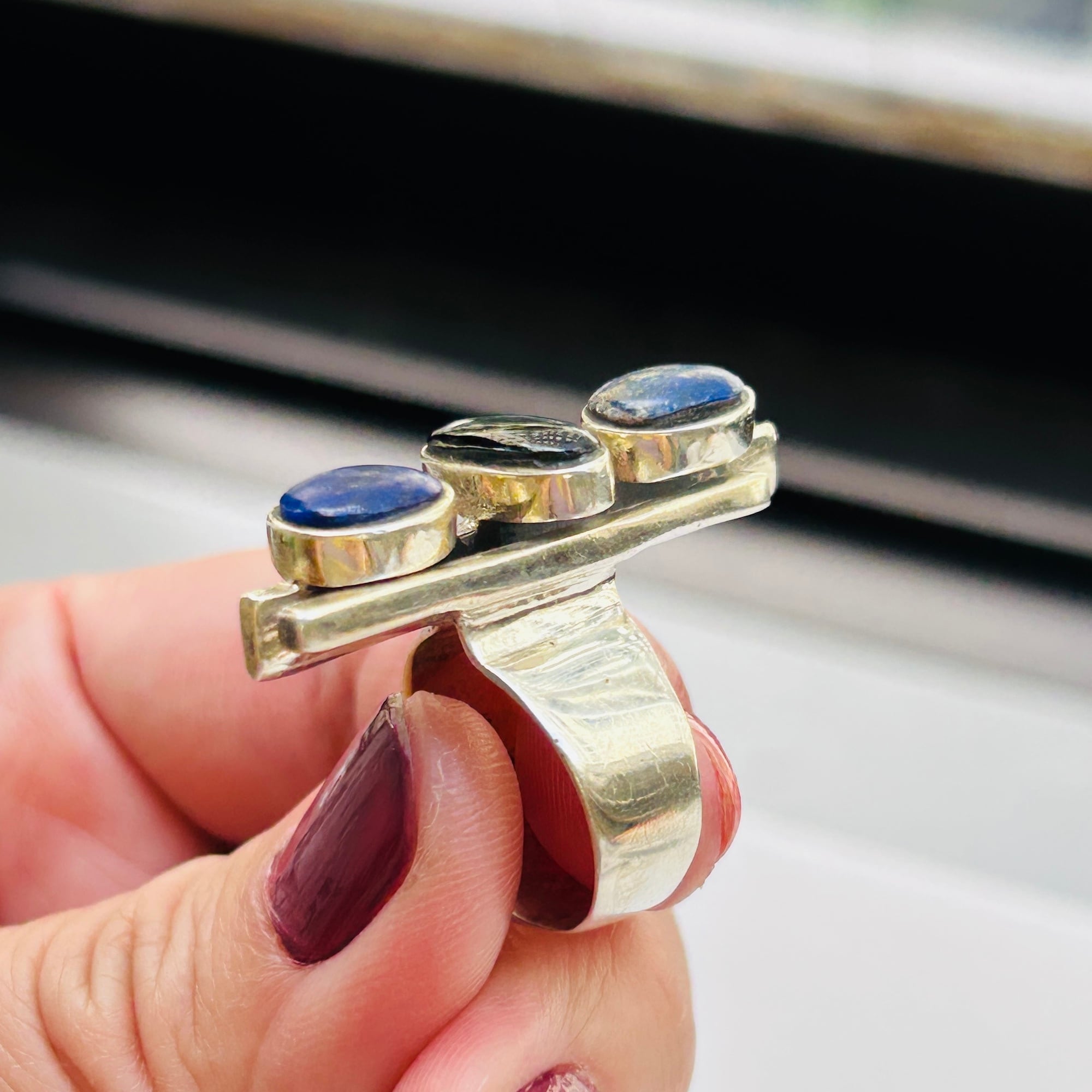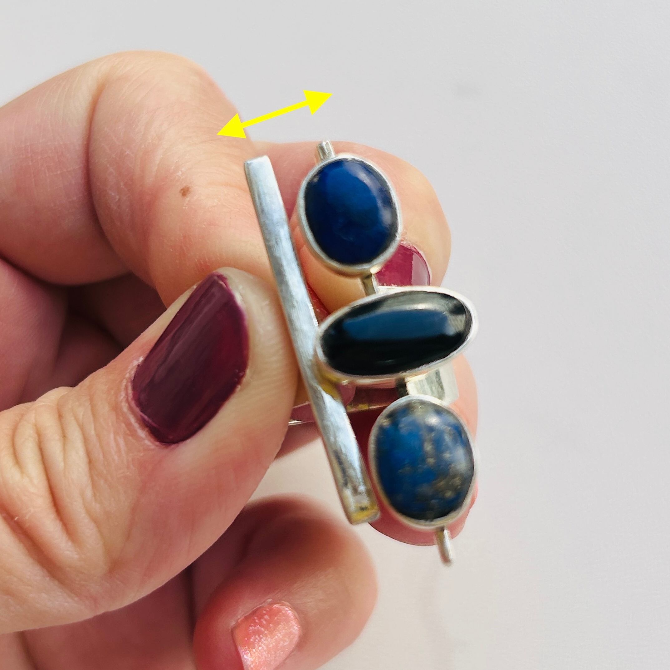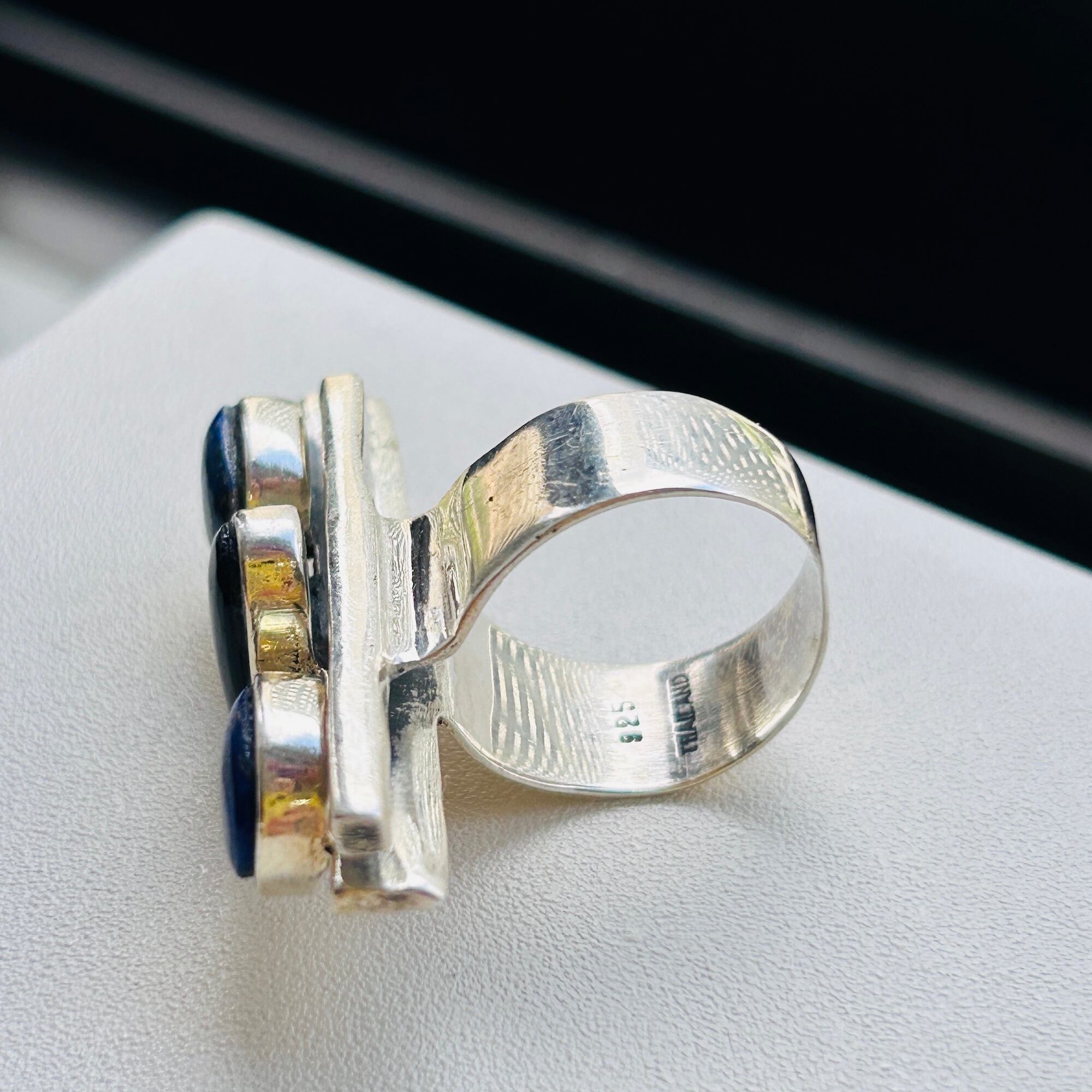 縦長モダンデザインのストーンリング。アズライトやオニキスの藍色とブラックの落ち着いた色使いで大人っぽい雰囲気です。ラップデザインになっており中央部分はくっついていません。幅広バンドで安定感のある着け心地です。着用感は実寸よりやや小さめ。私の場合、中央が開くので12号中指にも着用できます。中厚でしっかりした作りのリングです。「Thailand」「925」刻印。