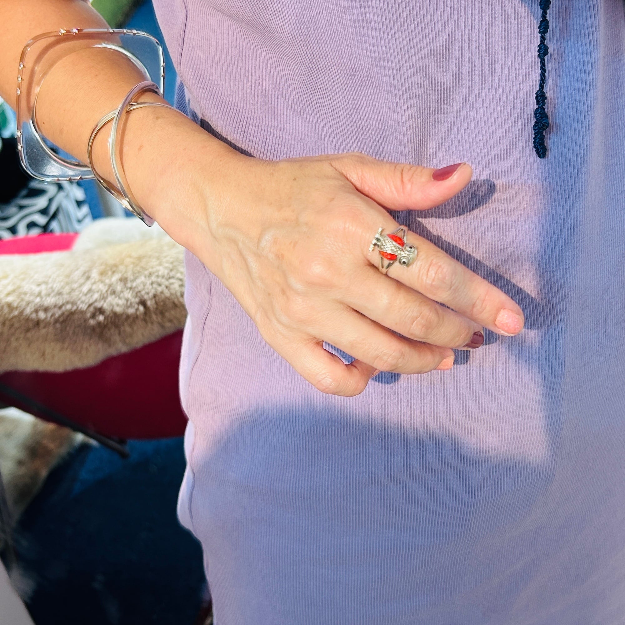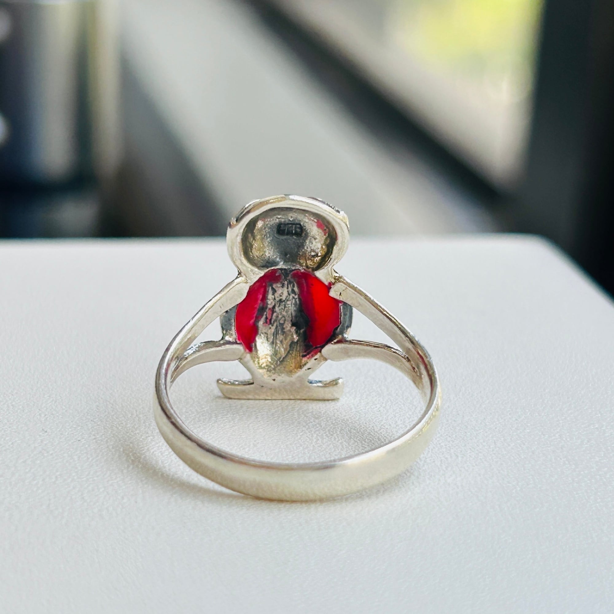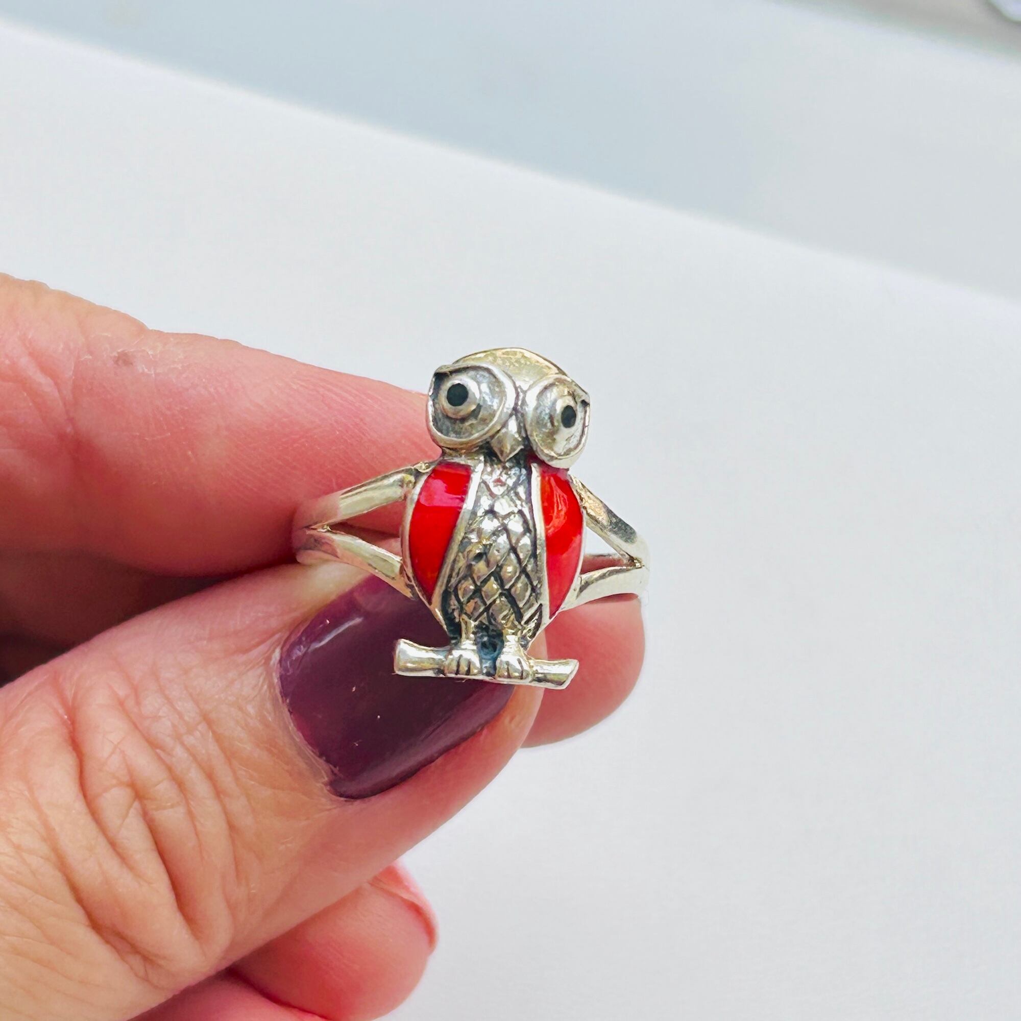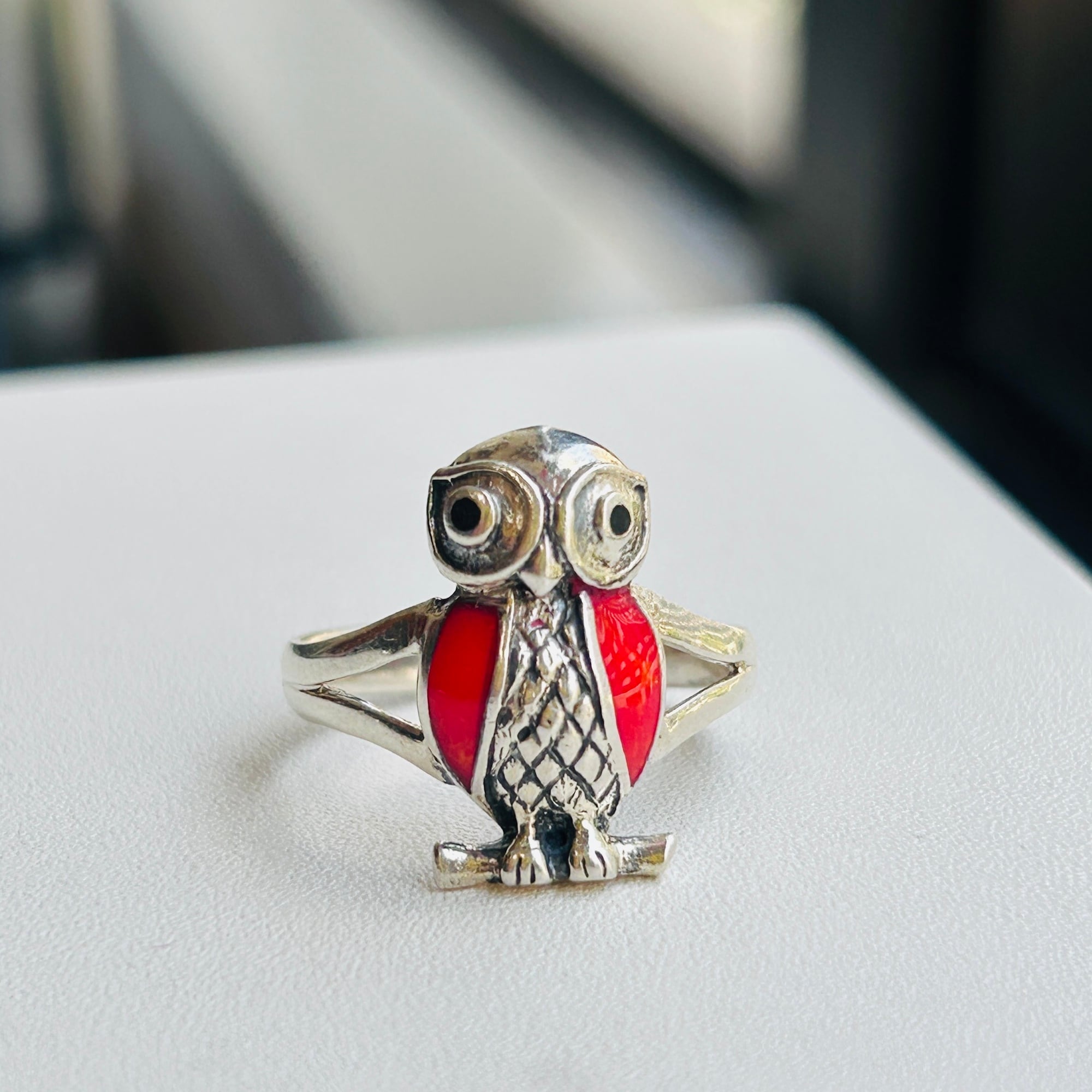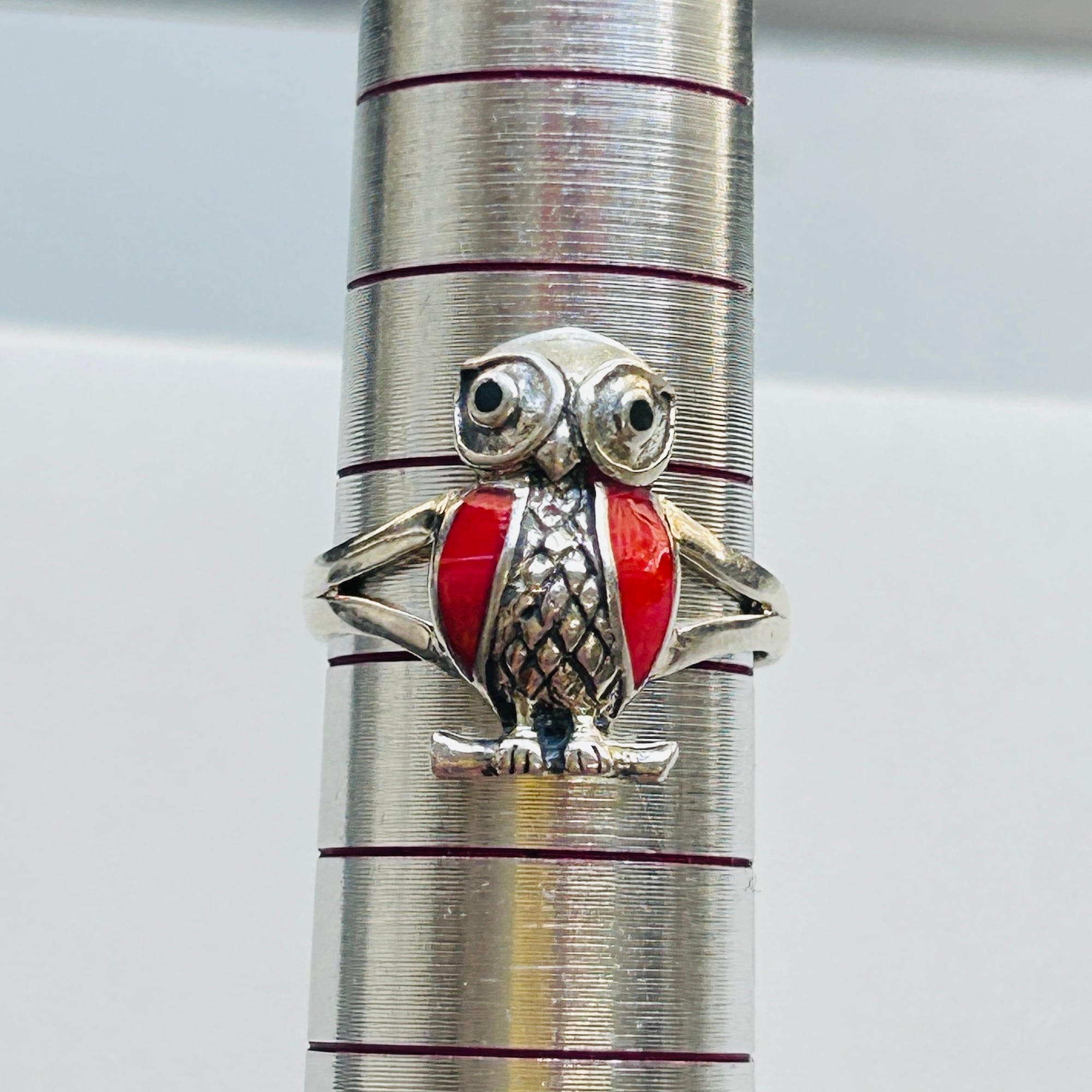 赤い差し色がキュートなフクロウリング。フクロウは「不苦労(苦労しない)」や「福来郎(福が来る)」の語呂合わせからラッキーチャームとして人気があるモチーフです。赤い色はエナメル。指に留まる愛嬌あるフクロウが可愛いです。内側に「925」刻印。