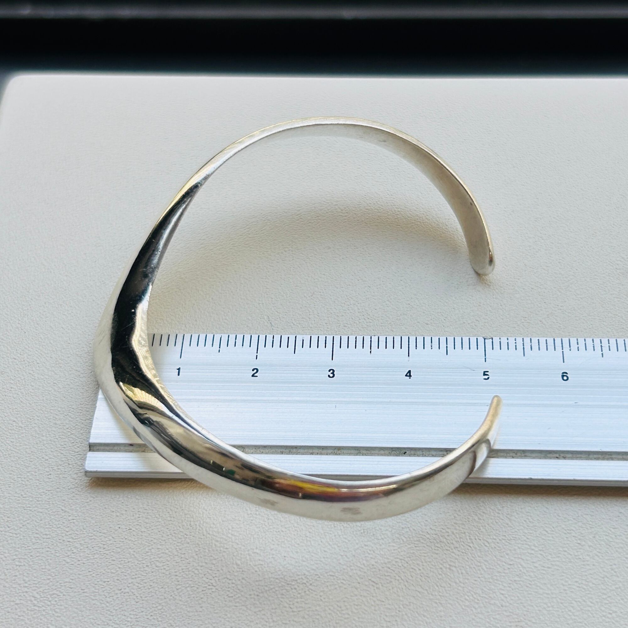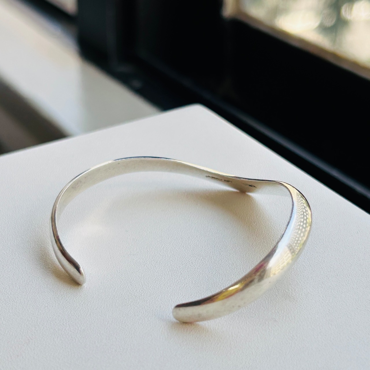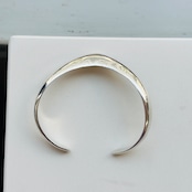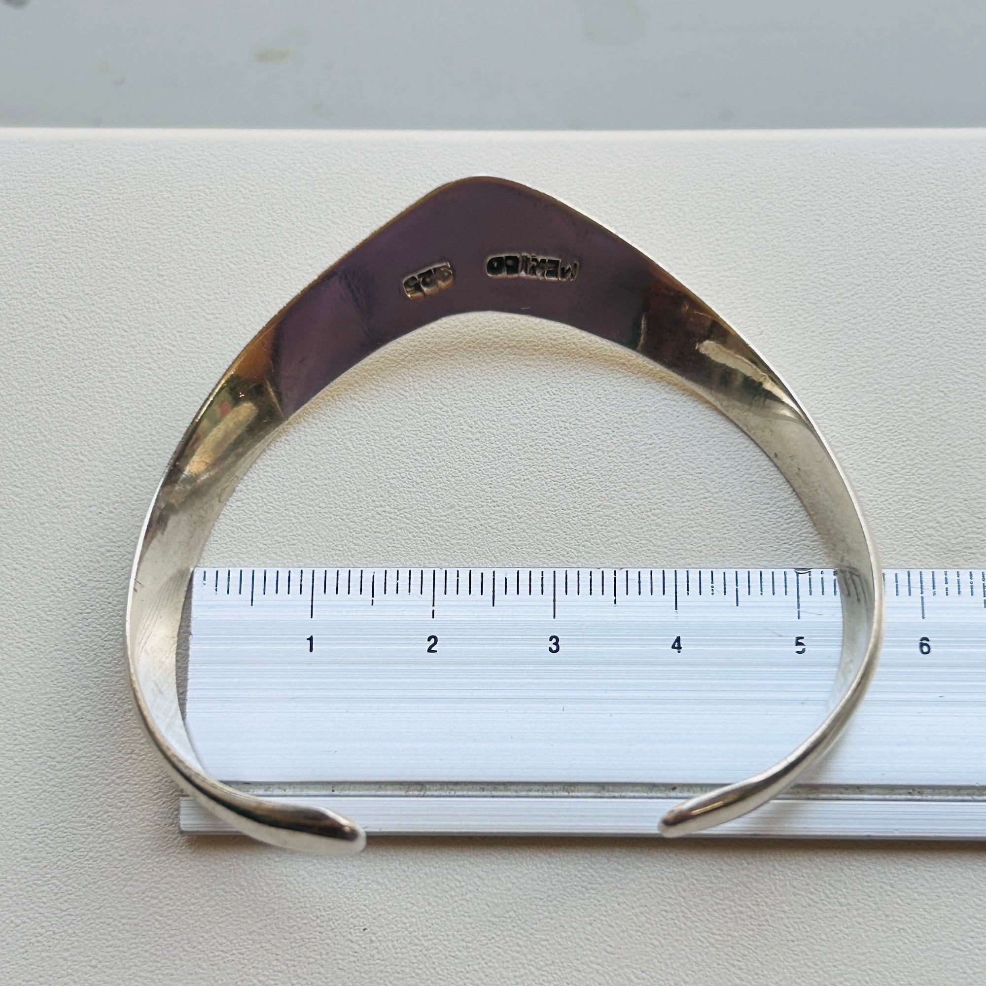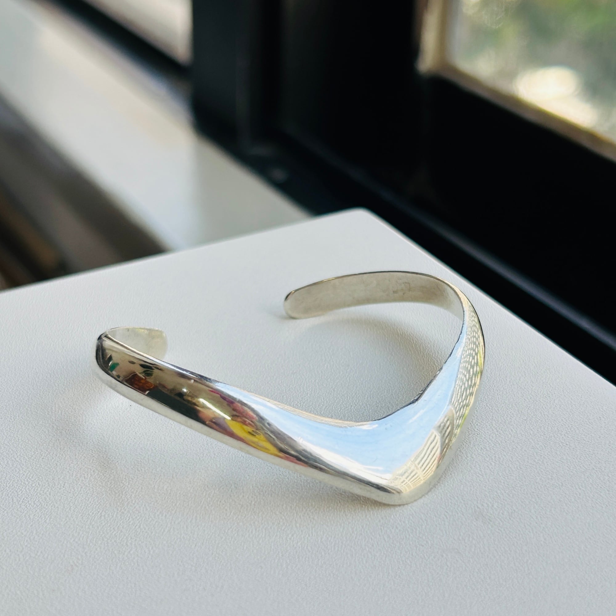 緩やかなV型バングル。Vの先端を指先の方に向けて着けると手の甲にかぶさってキレイに見えます。中厚で丈夫なソリッドシルバーですが、手で多少のサイズ調整は可能です。表面にスレ、小傷が少々ありますが光沢で身立ちません。いいシルバーバングルです:)内側に「MEXICO」「925」。