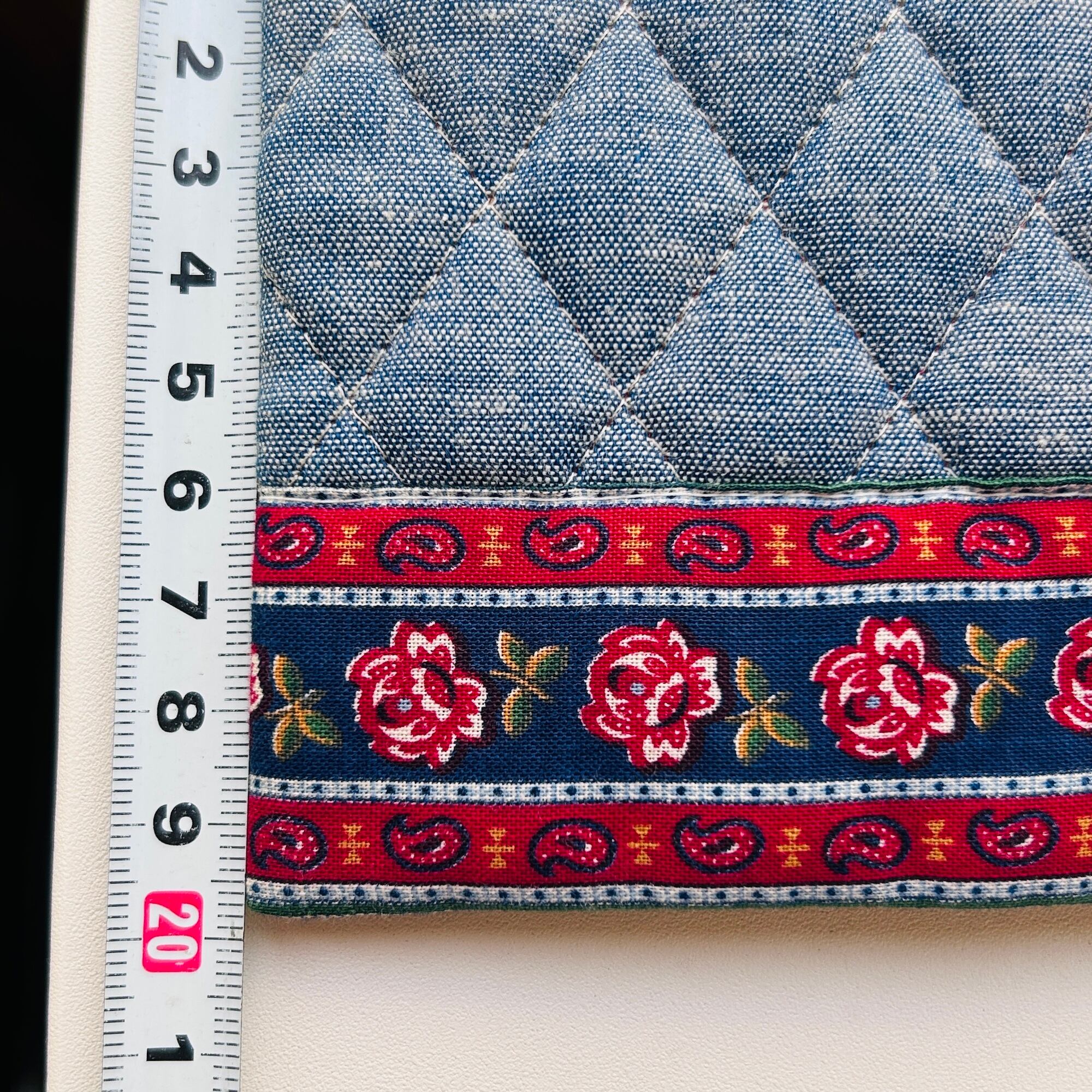 ヴェラ・ブラッドリーのコットンキルトブックカバー。シャンブレー生地のキルティング、フチにバラとペイズリー模様のカントリーテイストの素敵なデザインです。Veraは1982年創業のコットンバッグメーカーです。2007年頃から製造を海外へ移し始めて2015年以降、全ての商品を中国の工場で製造しています。このカバーはMade in USAです。USAコットンはとても品質がいいと思います。海外のブックカバーが日本の文庫本と合うのか分かりません。通帳入れなどにも使って頂けると思います。使用感がなくキレイなコンディション。