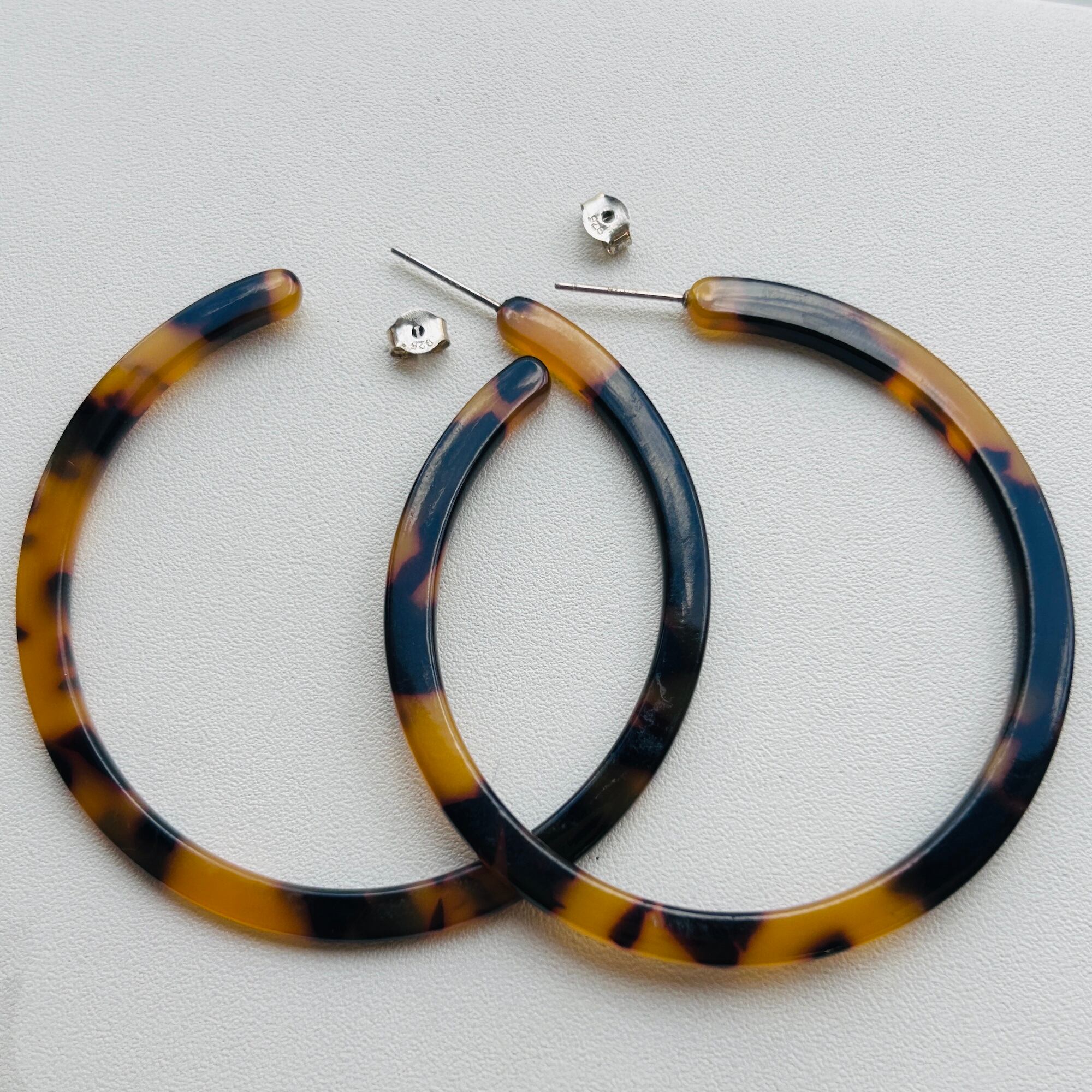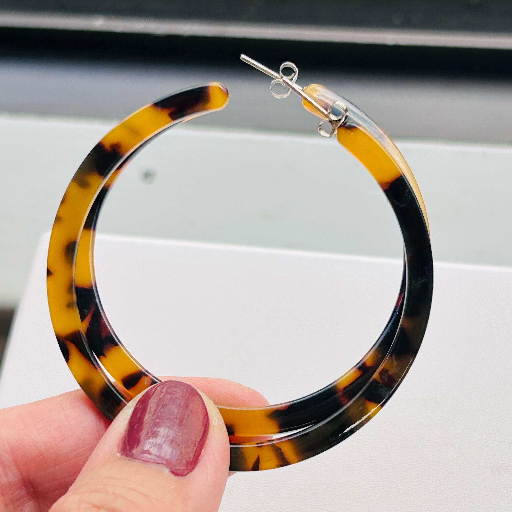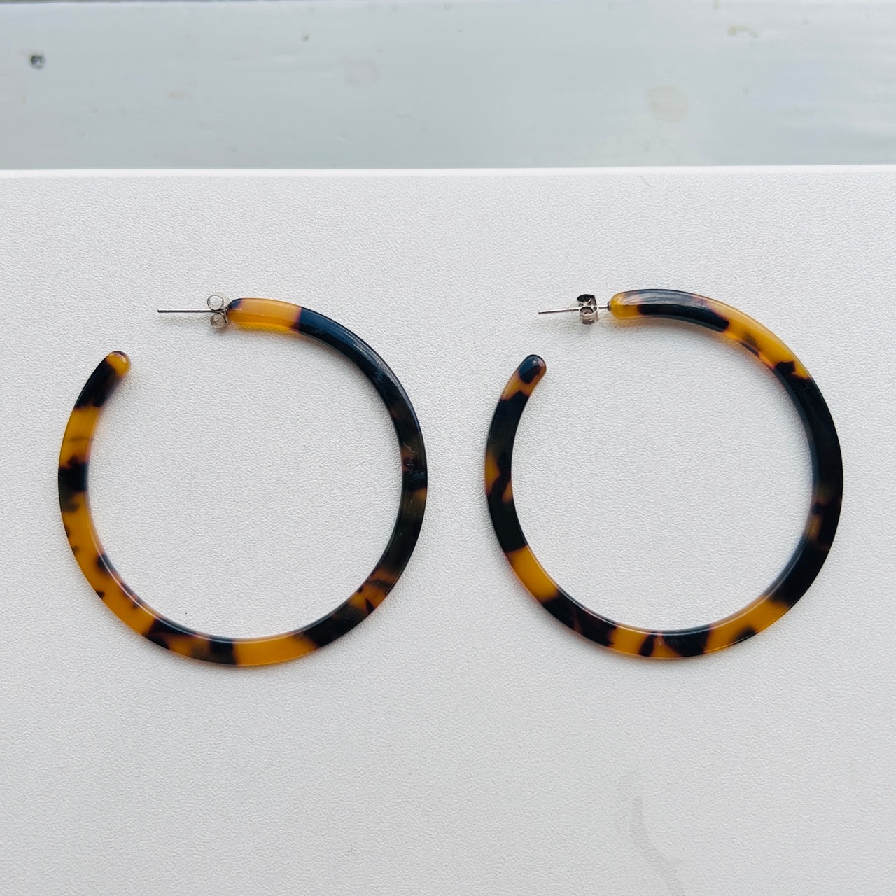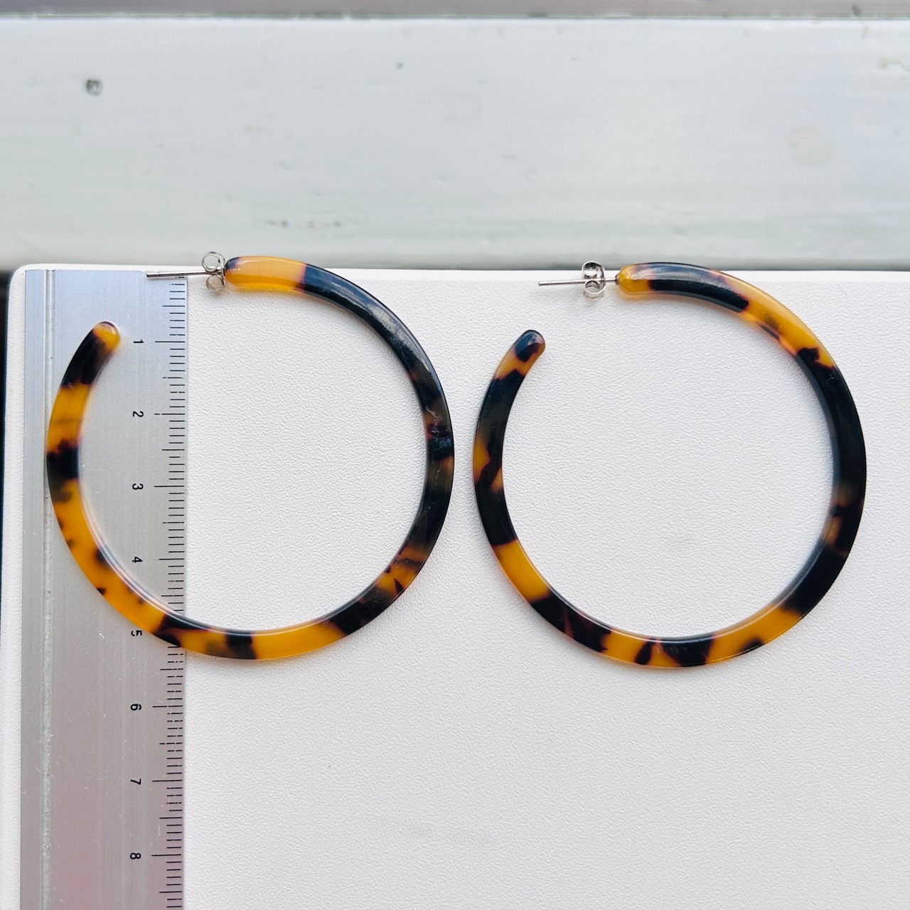 レトロで可愛い鼈甲調のフープピアス。5.5cmの大きめフープ。手で持つととっても軽くオモチャっぽさはありますがシルバーポストで着けた時の見栄えがいいので、コストパフォーマンスあるピアスだと思います。針とキャッチに「925」刻印。