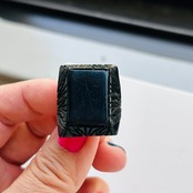 古くてオシャレなブラックベークライトリング。大きなスクエアフェイスにリーフ模様のフレームです。古さとかっこ良さを併せ持った逸品です。トップのフラット面に擦り傷少々ございます。写真では分かりやすく撮影していますが実際には目立たず気にならないです。もともと6号サイズでしたが内側を削って9号にサイズアップしてもらいました。着用感は9〜10号くらいです。