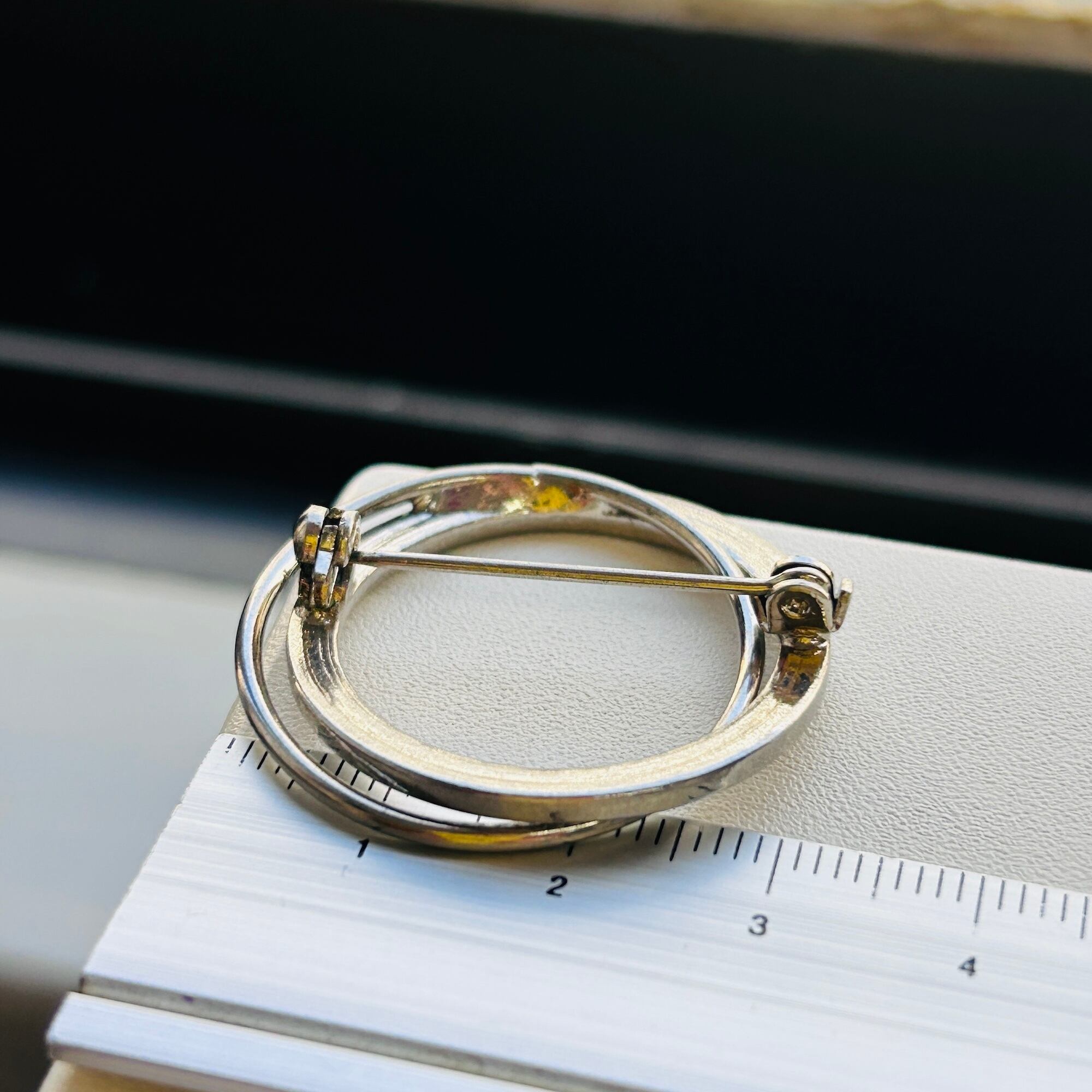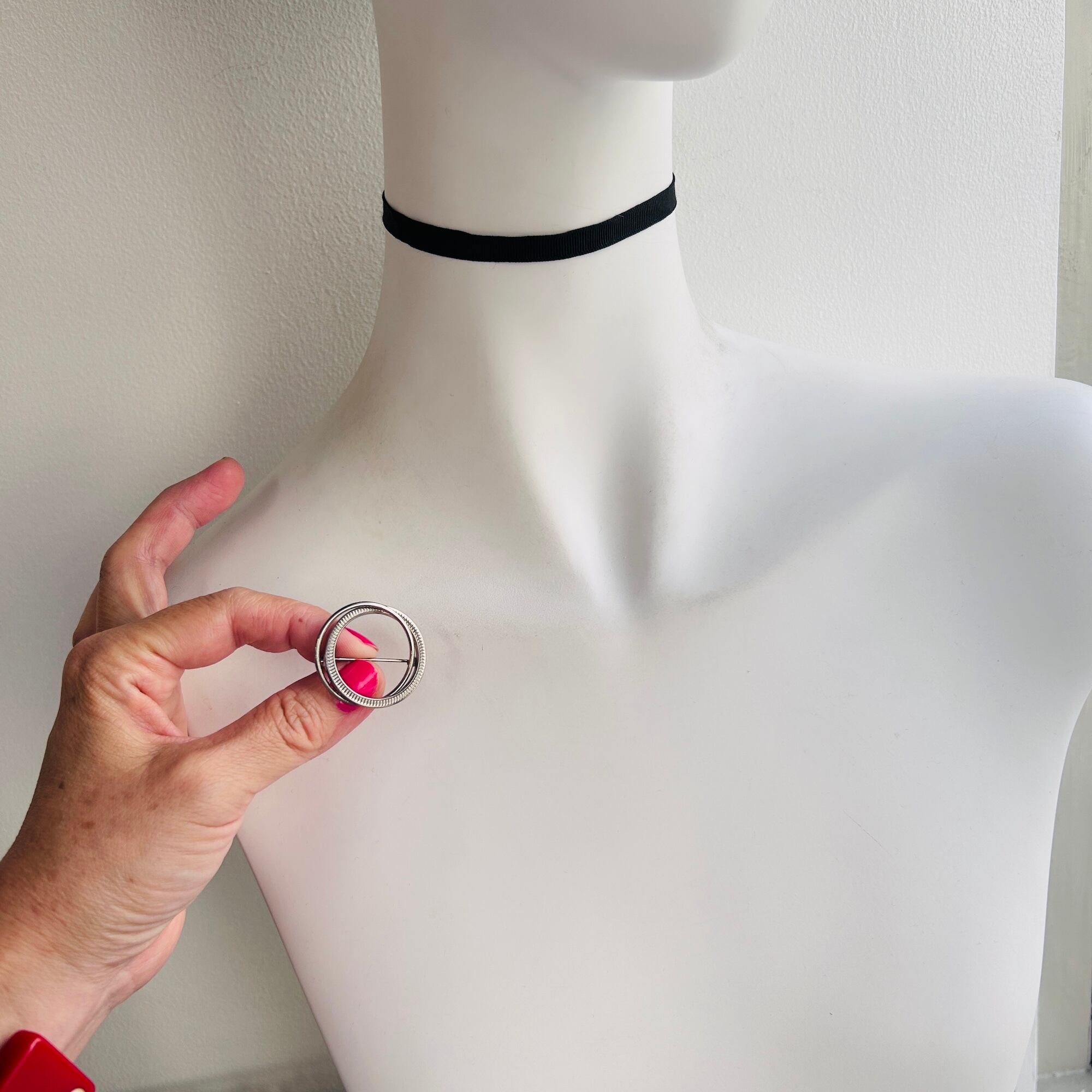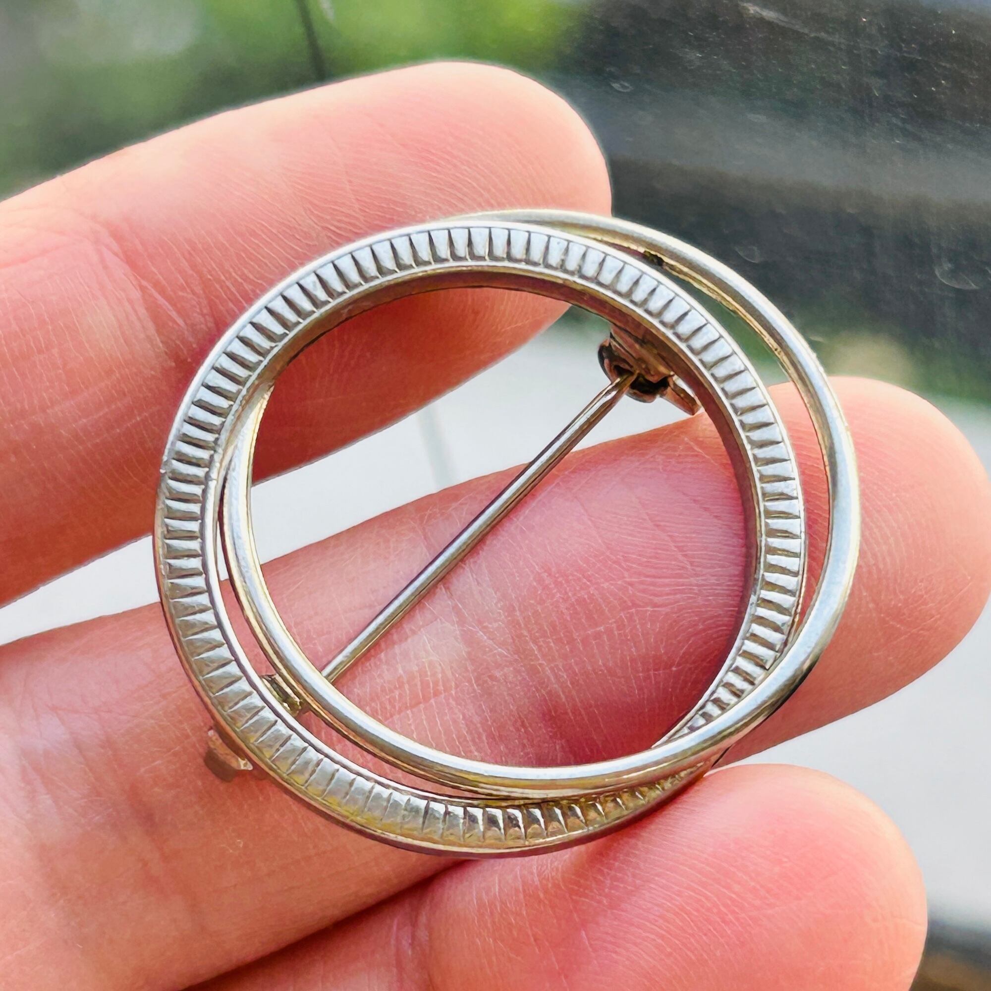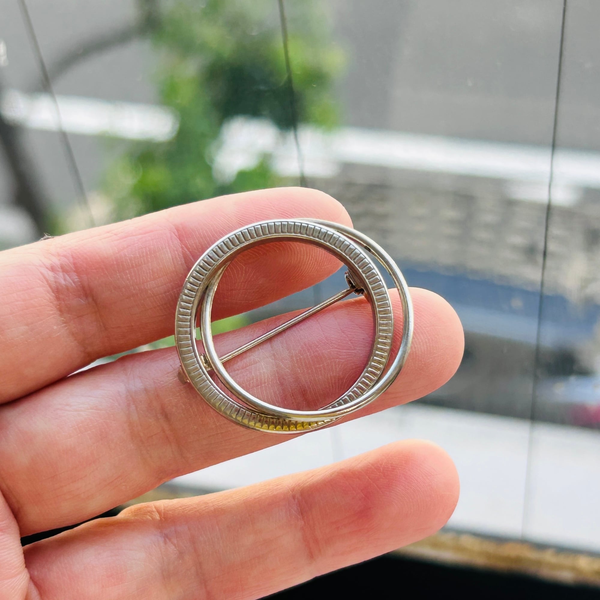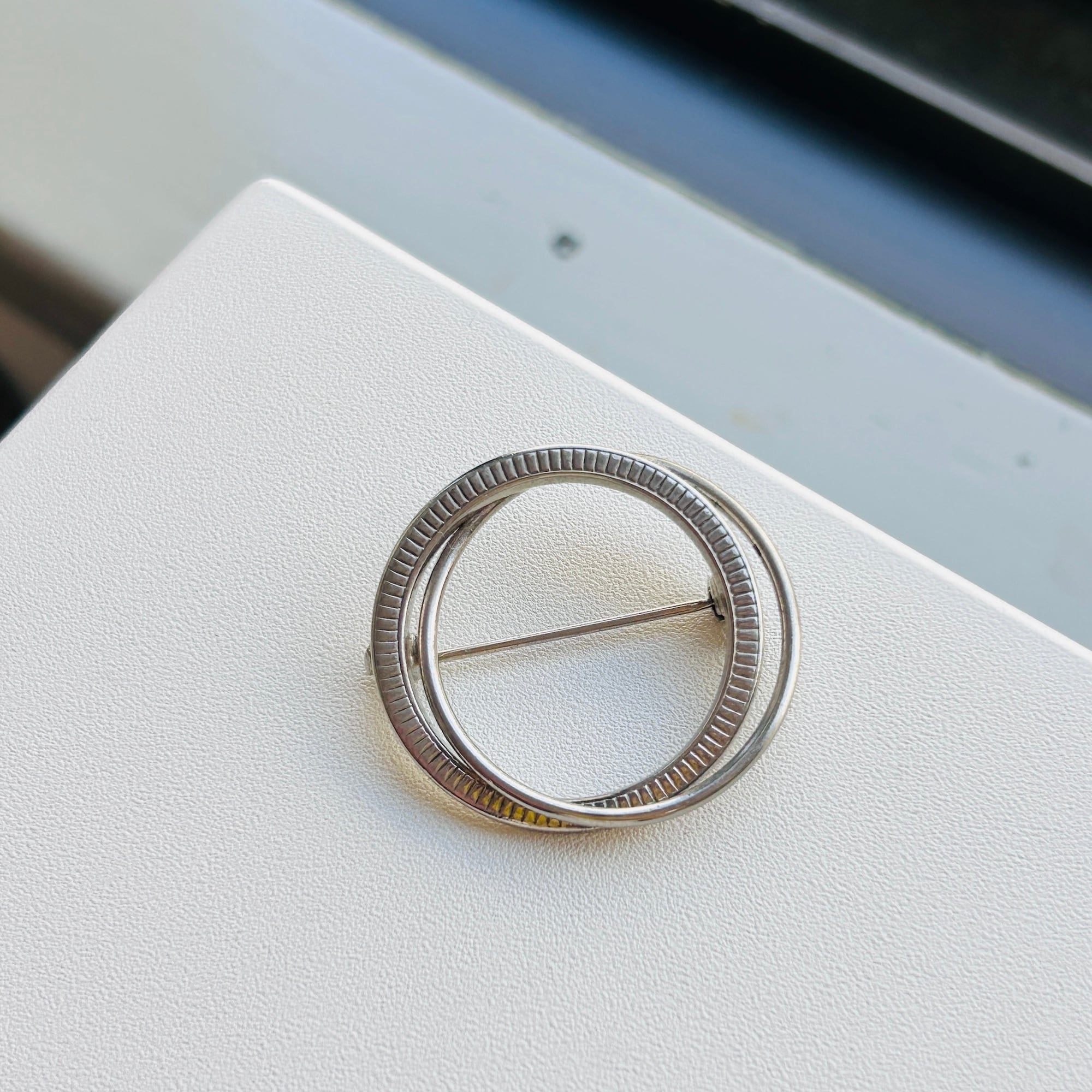 型押し模様とプレーンのダブルサークルブローチ。どのようなスタイルにも合わせやすいデザインです。ブローチを1つ着けるとオシャレ感UP:)こちらはシルバーメタルですが、見た目はシルバー925っぽいので見劣りしません。お店に置いていても変色する様子もないので扱いやすいと思います。金具の動きに問題ありません。コスパのいいブローチです:)