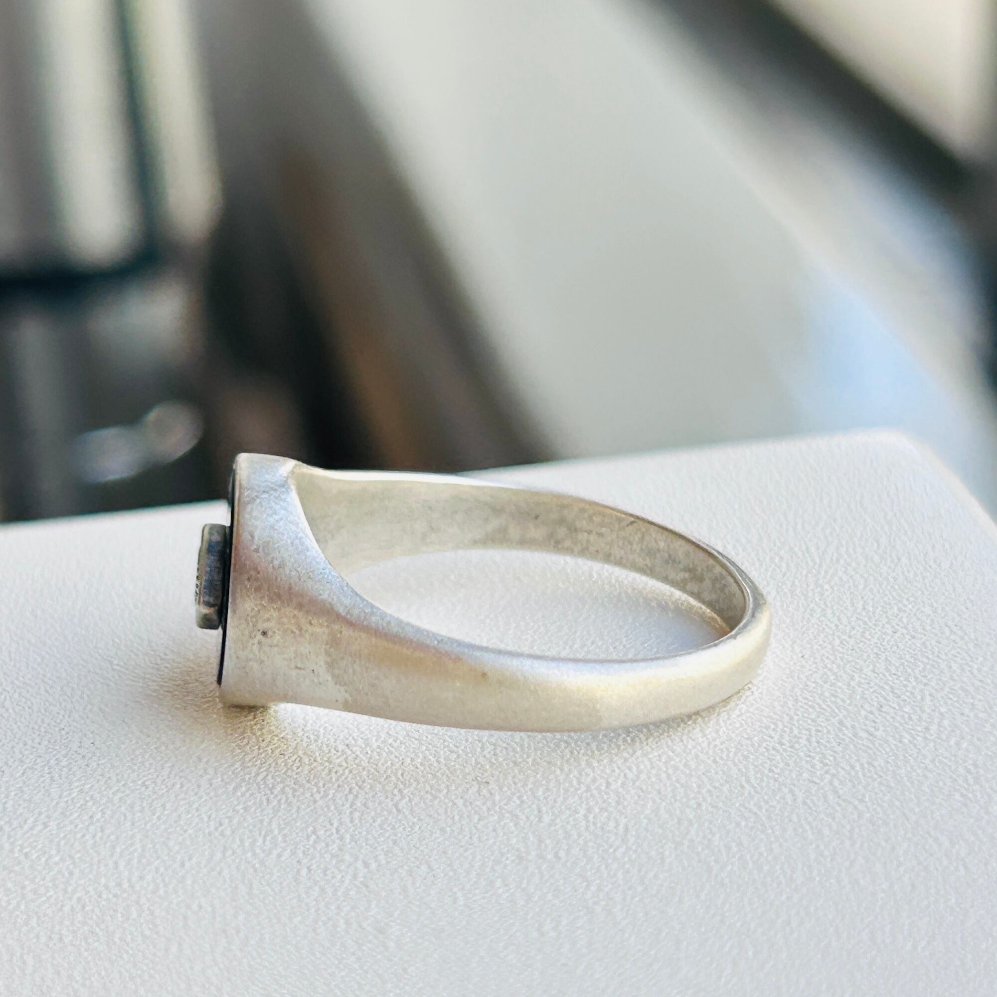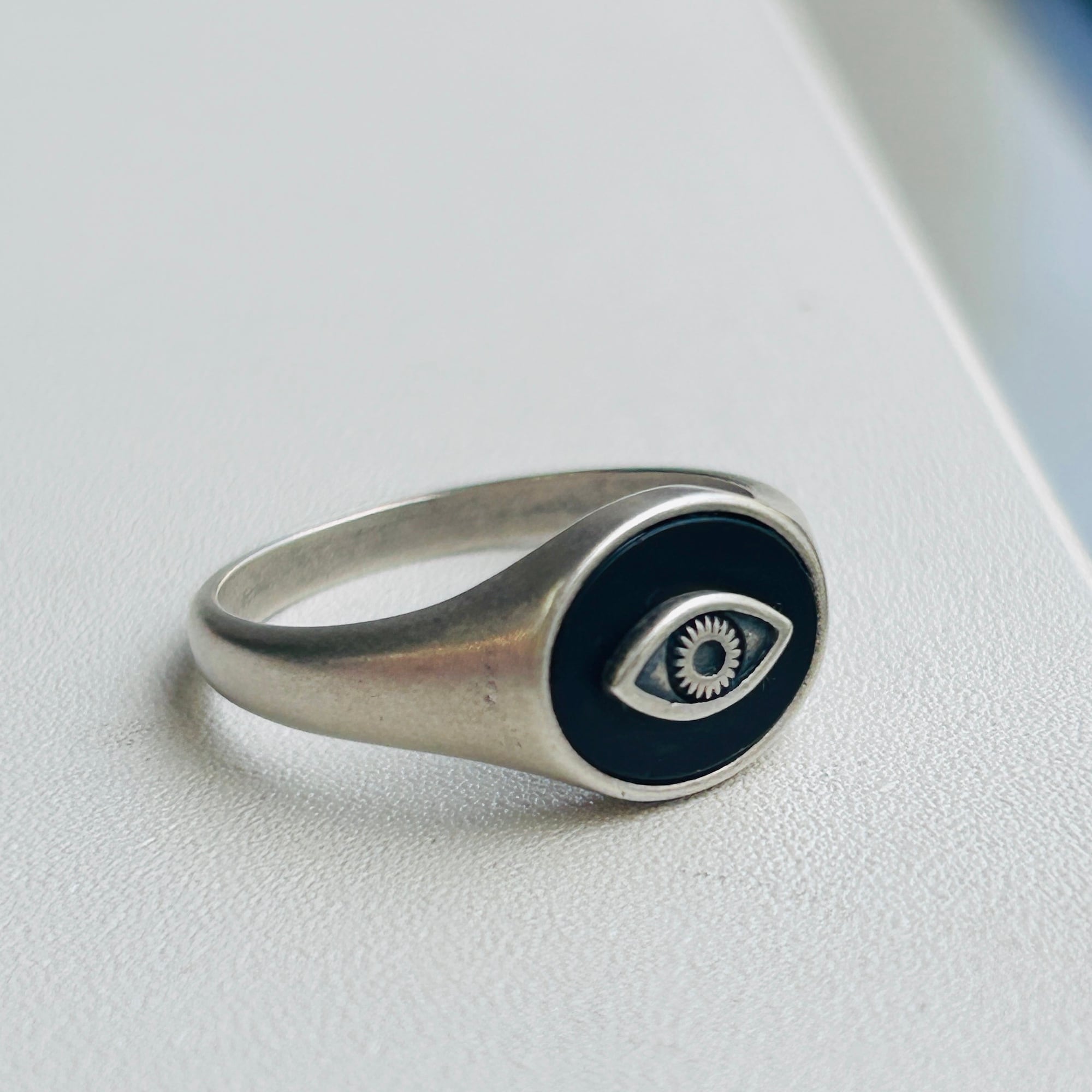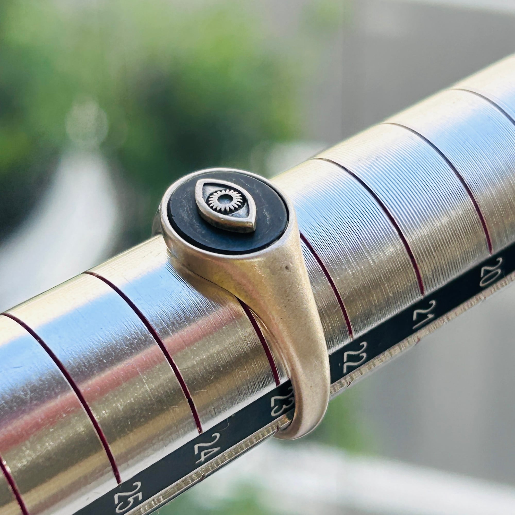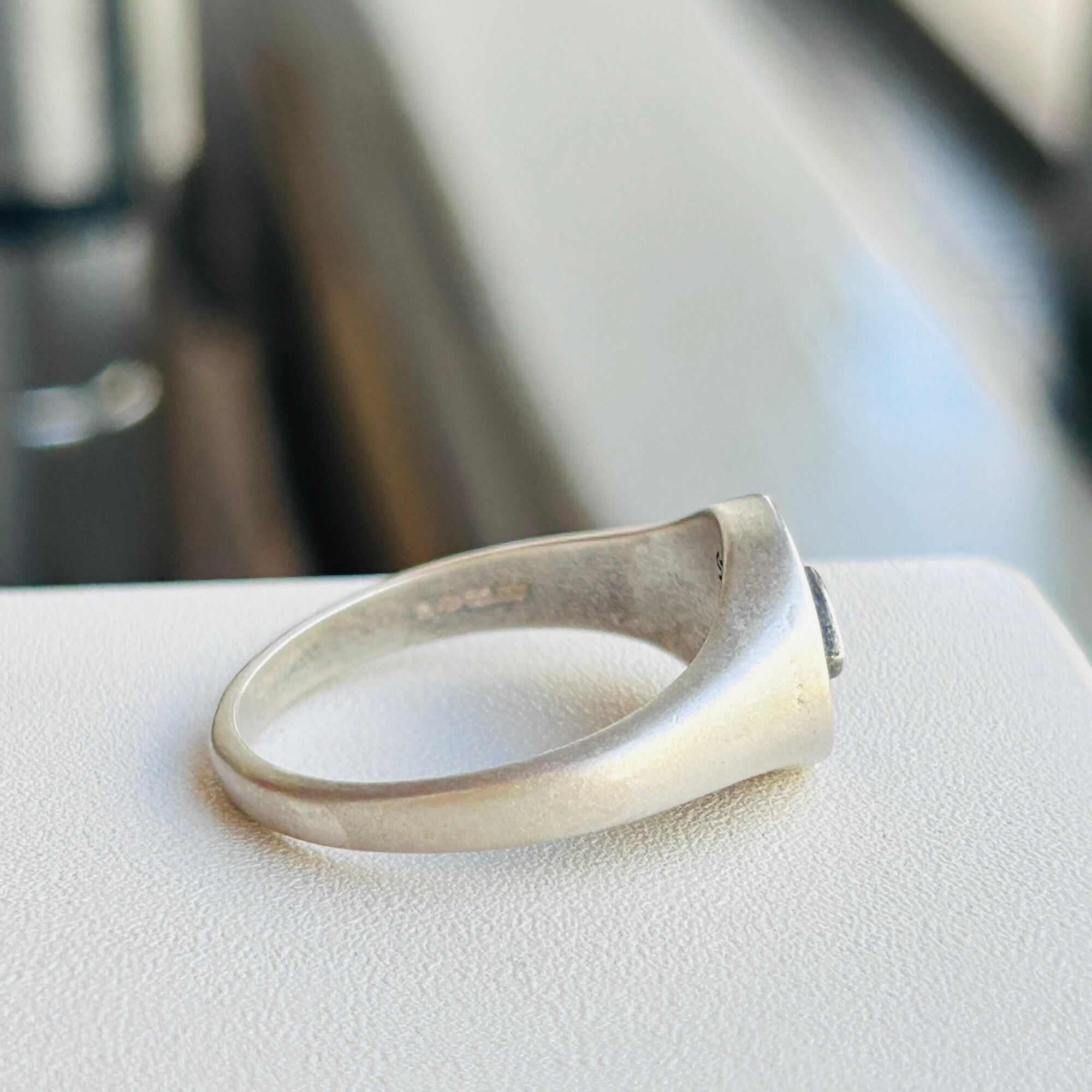 ユニークな目玉デザインリング。黒い部分はマットな質感で石のような材質。樹脂ではなさそうです。写真7・9、目の周りの薄いシミ跡はウェットティッシュで拭いたら取れました。写真1・3が拭き取った後です。バンドはマットなシルバーです。内側トップ背面に「K」「925」と内側のサイドにヨーロッパ各国の貴金属刻印(貴金属の安心安全な取引、高品質を保つために結ばれたヨーロッパ各国の共通刻印です)。刻印からロンドンで1976年以降に製造されたものであることがわかります。