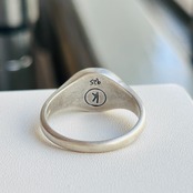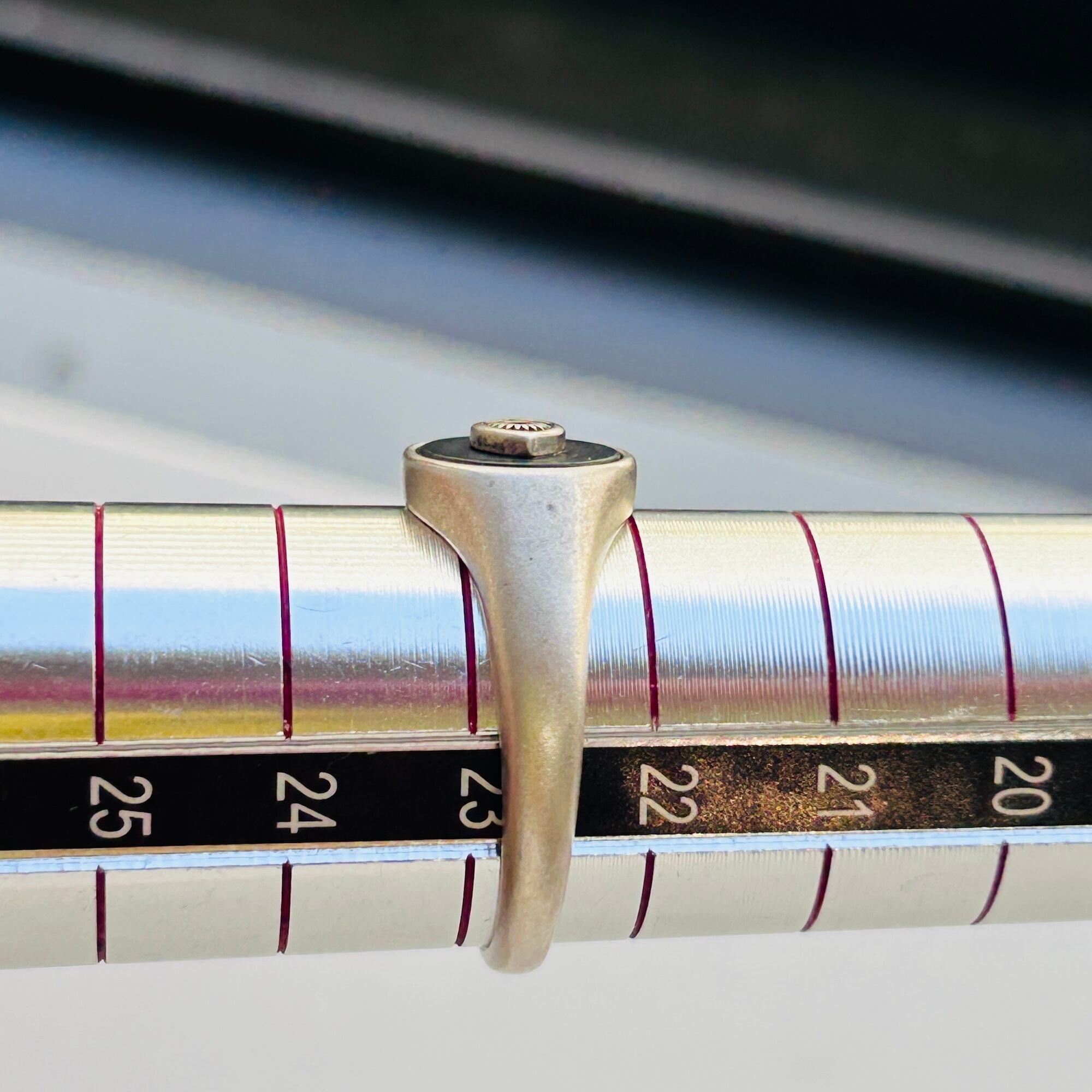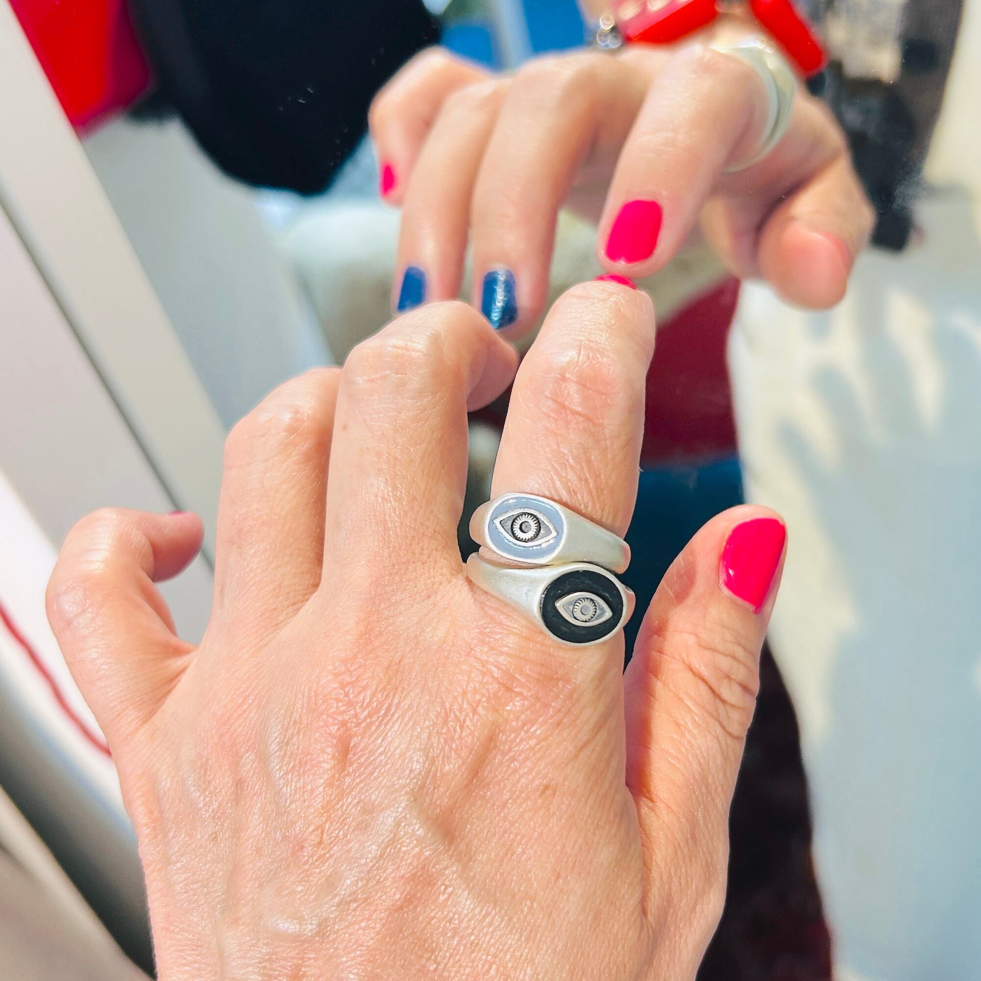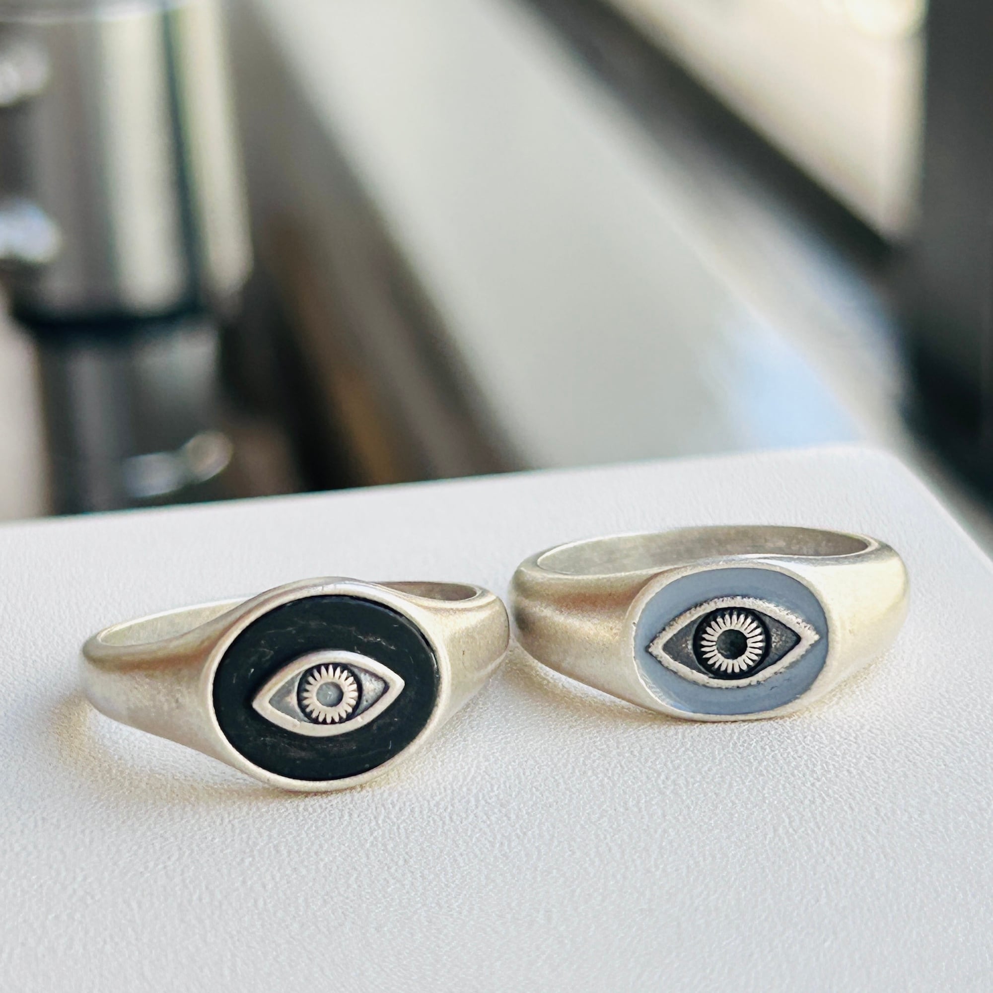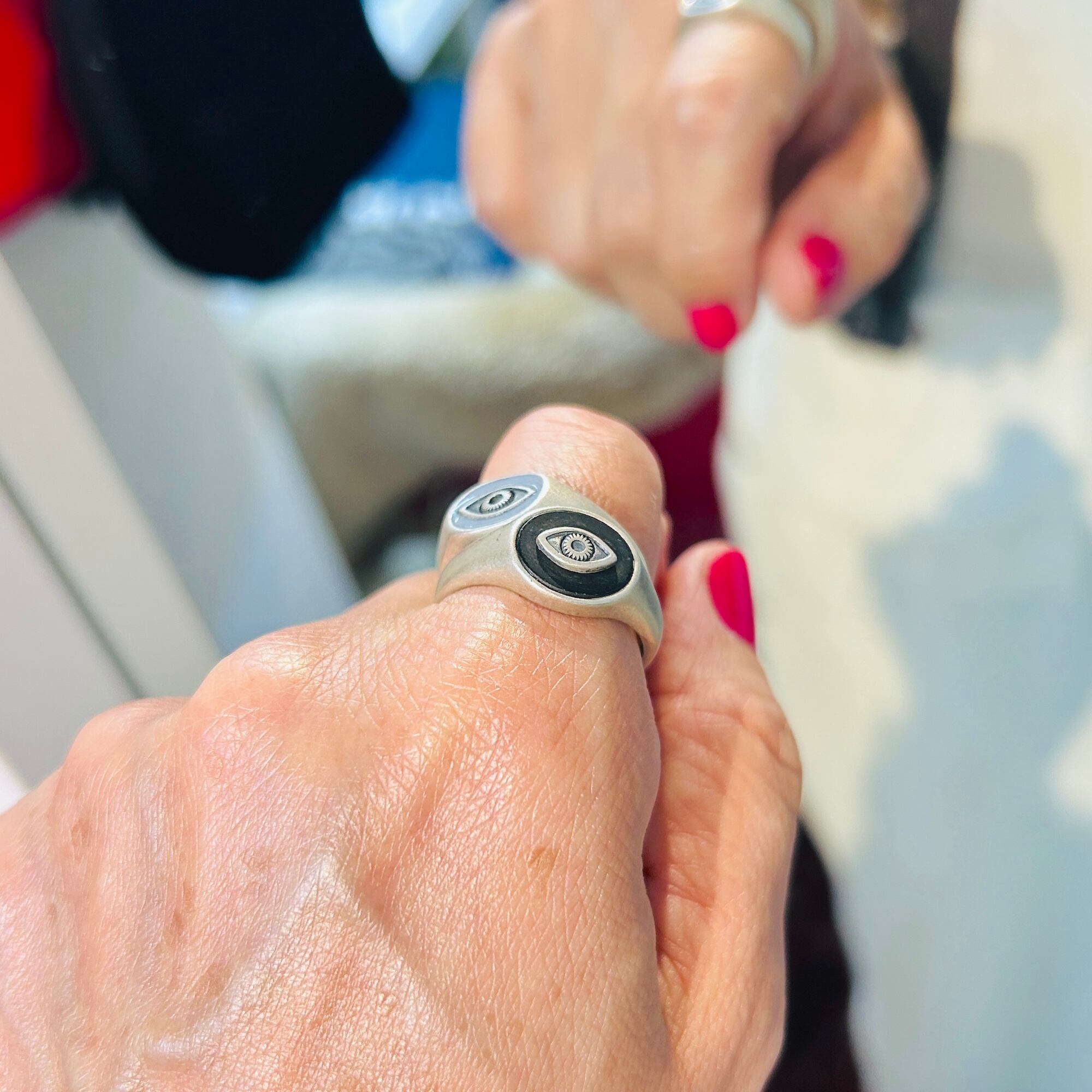 ユニークな目玉デザインリング。黒い部分はマットな質感で石のような材質。樹脂ではなさそうです。写真7・9、目の周りの薄いシミ跡はウェットティッシュで拭いたら取れました。写真1・3が拭き取った後です。バンドはマットなシルバーです。内側トップ背面に「K」「925」と内側のサイドにヨーロッパ各国の貴金属刻印(貴金属の安心安全な取引、高品質を保つために結ばれたヨーロッパ各国の共通刻印です)。刻印からロンドンで1976年以降に製造されたものであることがわかります。