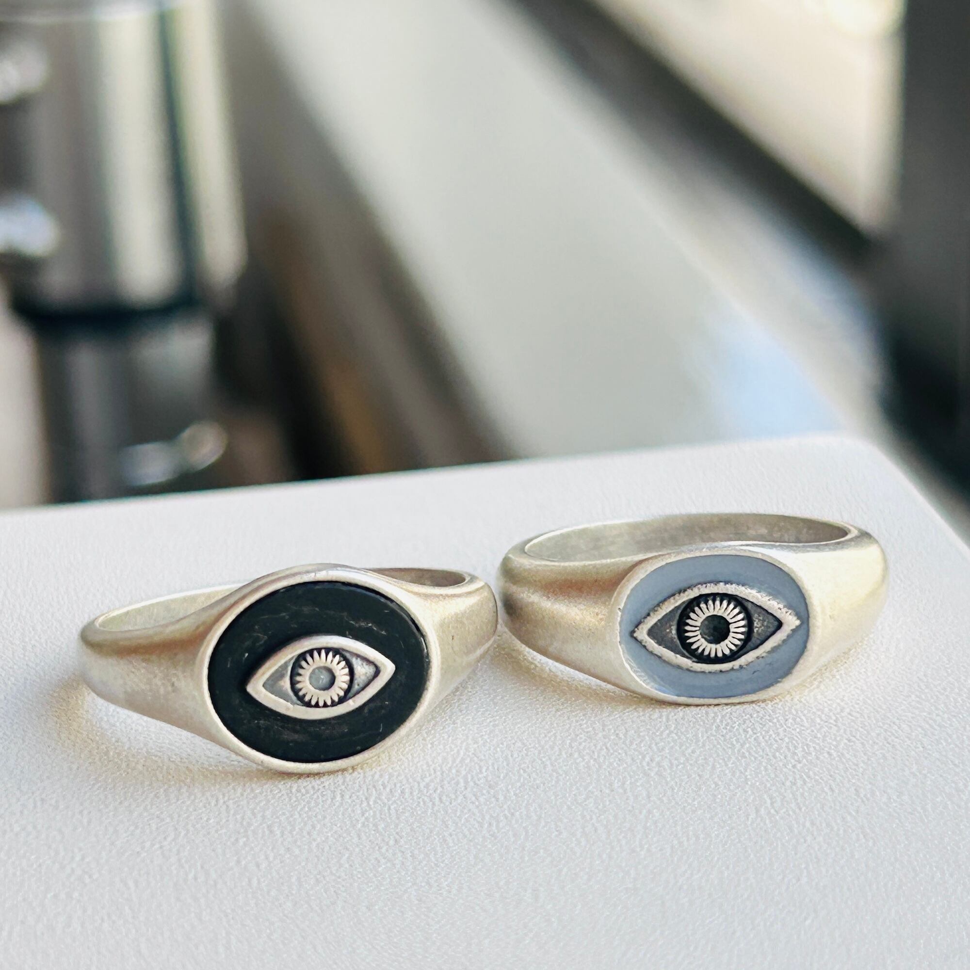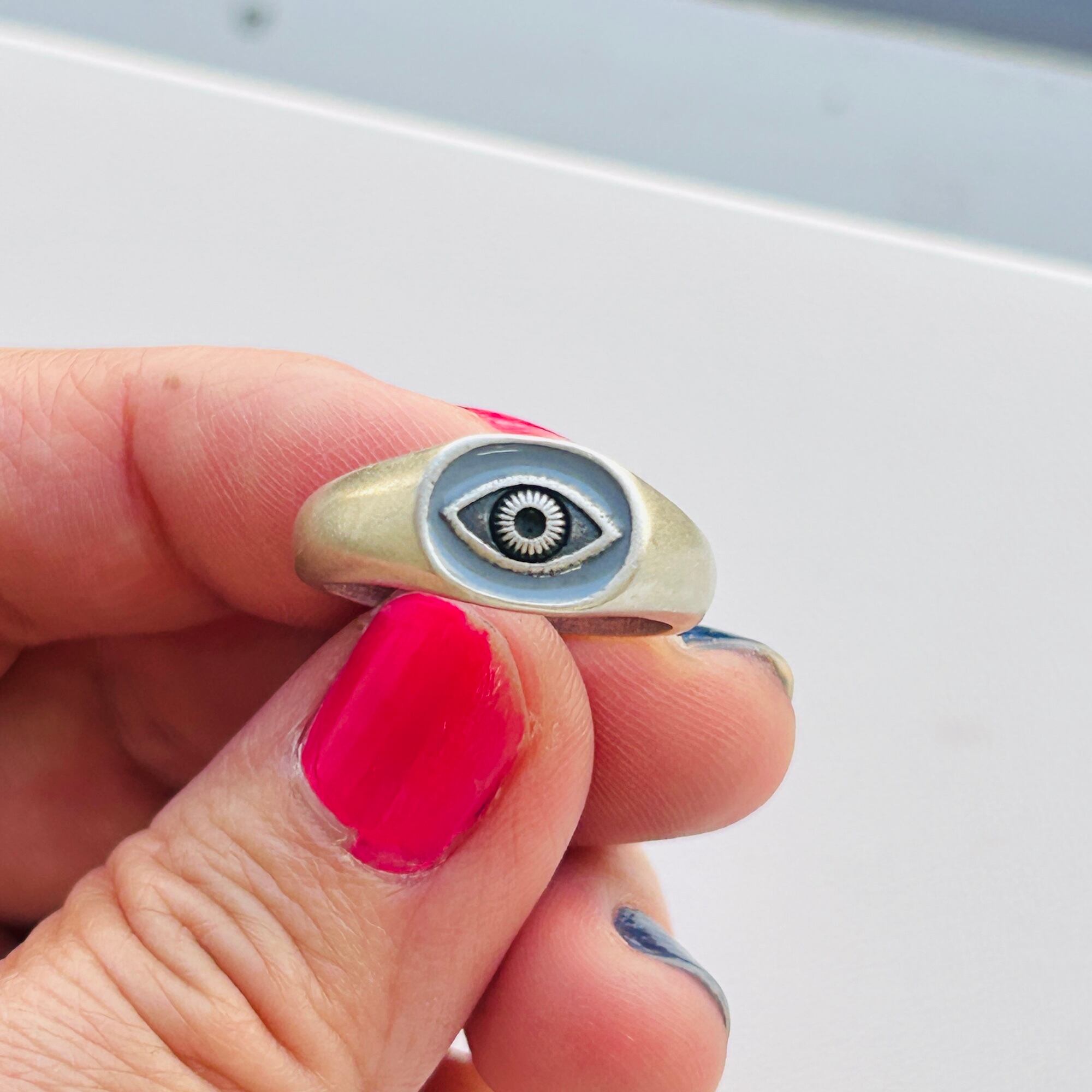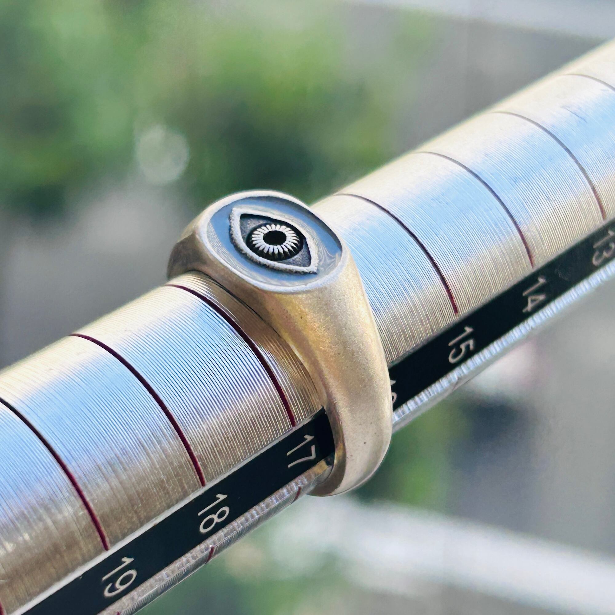 ユニークな目玉デザインリング。目玉周りのブルーグレーはエナメルです。バンドはマットなシルバー。内側のサイドにヨーロッパ各国の貴金属刻印(貴金属の安心安全な取引、高品質を保つために結ばれたヨーロッパ各国の共通刻印です)。刻印からロンドンで1976年以降に製造されたものであることがわかります。
