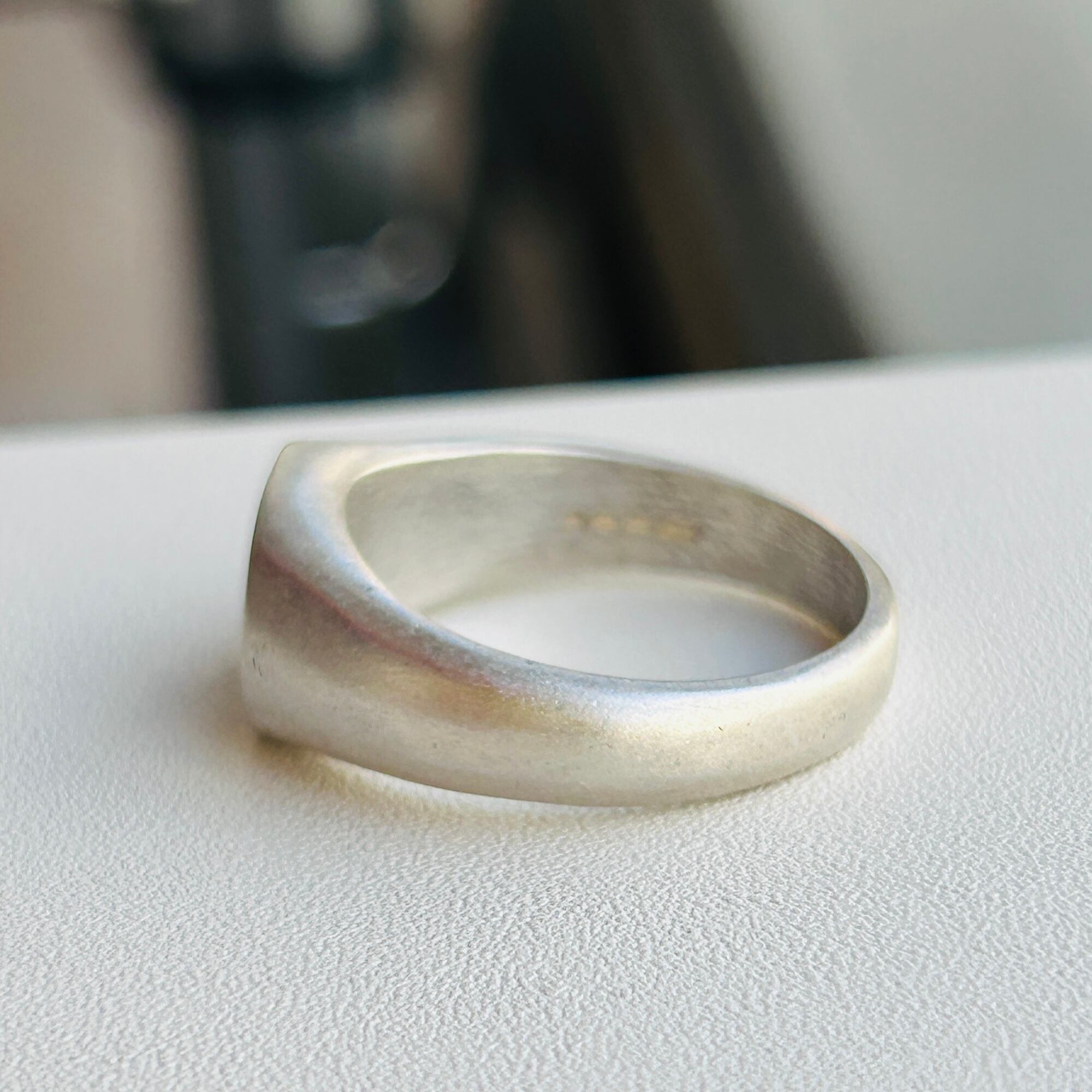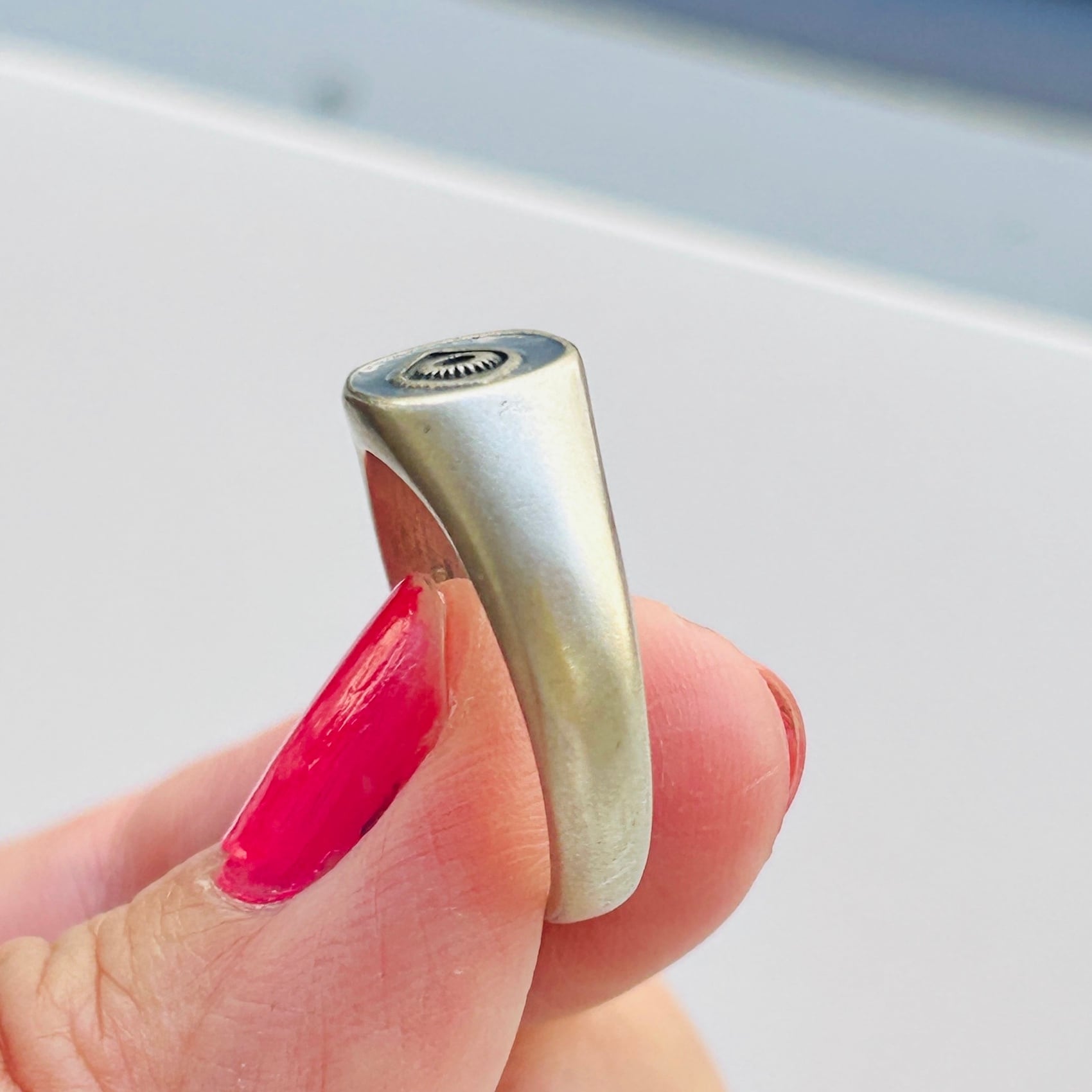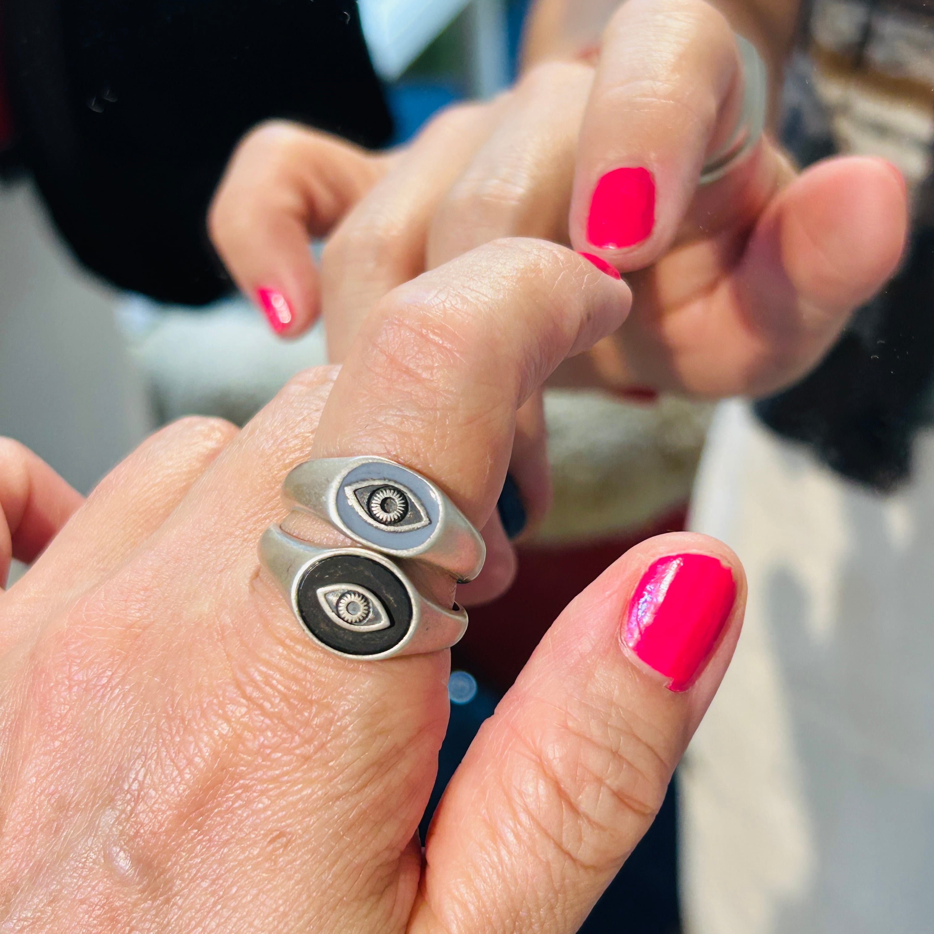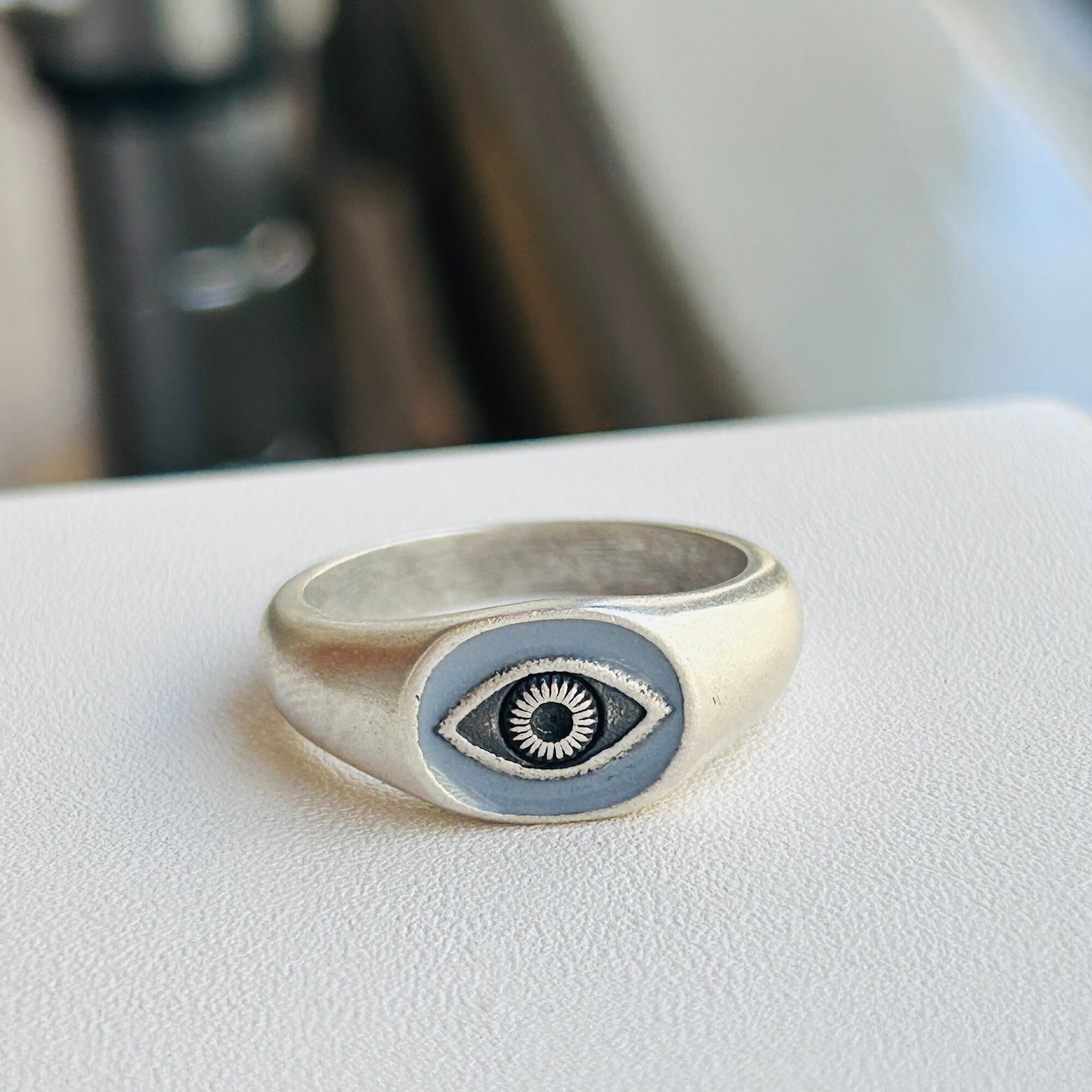 ユニークな目玉デザインリング。目玉周りのブルーグレーはエナメルです。バンドはマットなシルバー。内側のサイドにヨーロッパ各国の貴金属刻印(貴金属の安心安全な取引、高品質を保つために結ばれたヨーロッパ各国の共通刻印です)。刻印からロンドンで1976年以降に製造されたものであることがわかります。