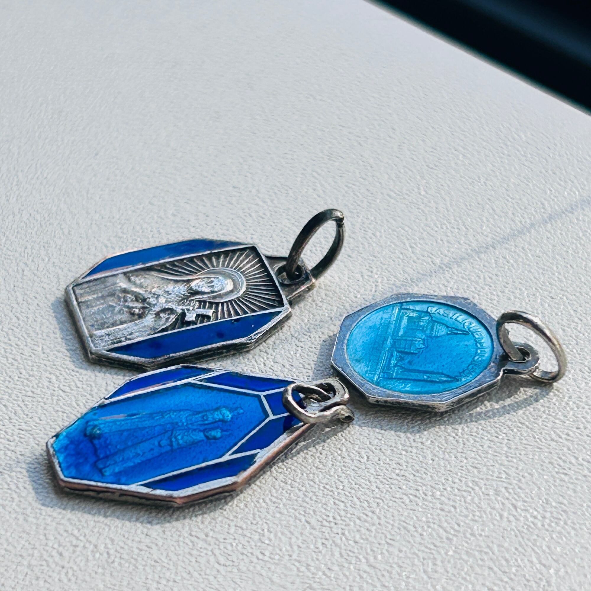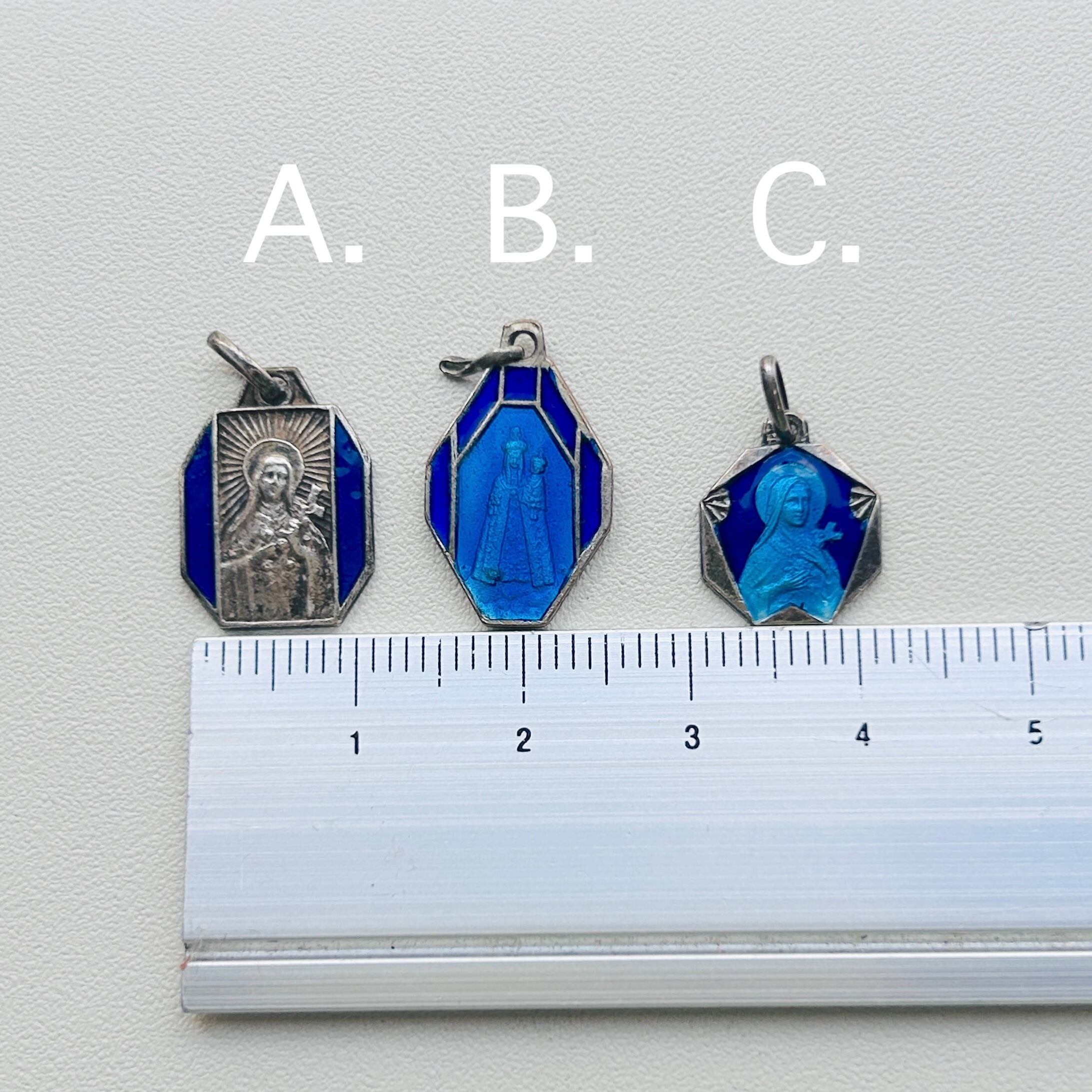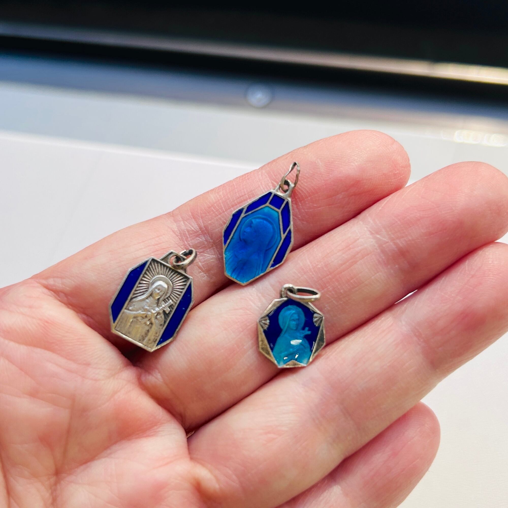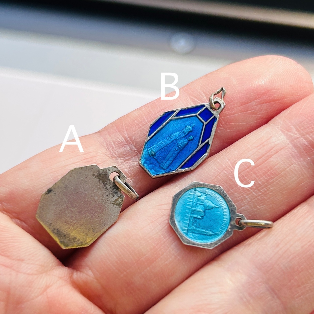 フランスのreligiousチャーム。銀色メタルにブルーエナメルの配色が素敵です。どれも横幅は1.1cm。薄くて軽いチャームです。B・Cはリバーシブル仕様です。