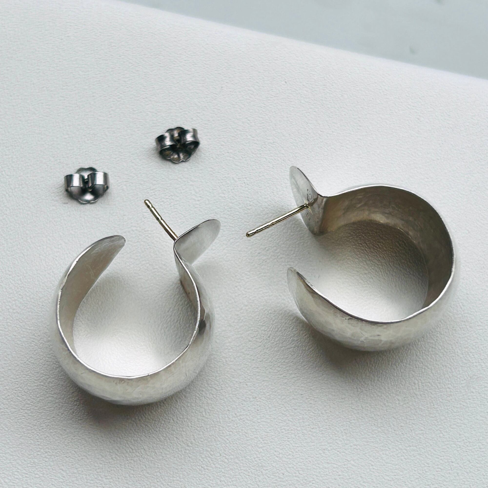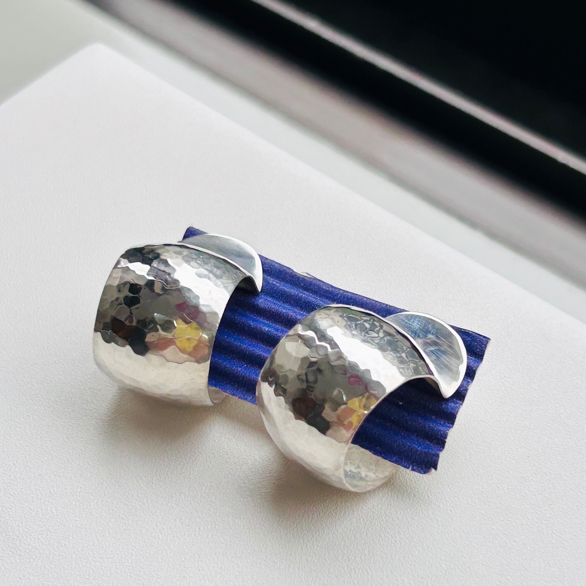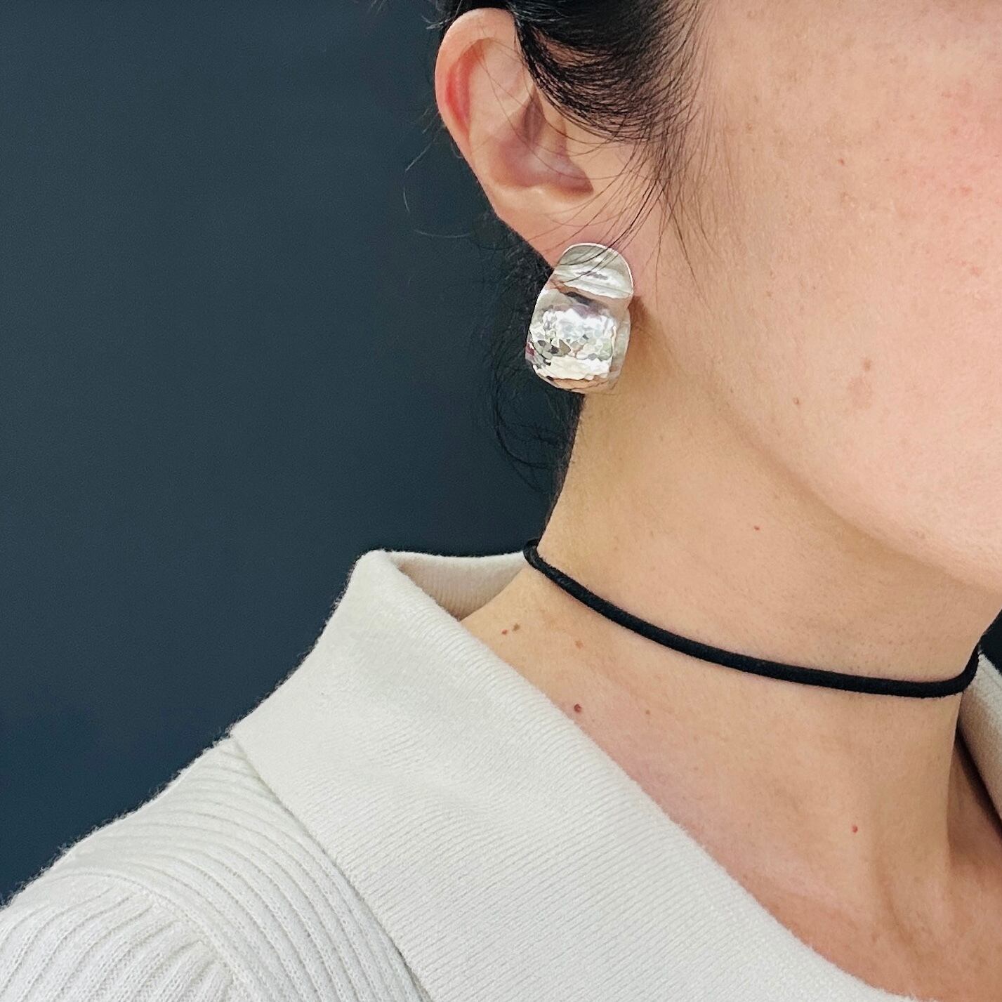 幅広でフラットな槌目プレートがコロンと丸まったフープピアス。槌目模様の眩い輝きが素敵です。針の付いている部分が立ち上がっていて着けやすく、安定感があります。写真では分かりにくいですが針に金メッキが施されています。金の含有率は刻印がないので分かりませんが金属アレルギーを考慮したメッキだと思います。刻印は「SS」とクマのような牛のようなマークとロゴマーク。恐らくネイティブ・アメリカンジュエリーだと思います。丁寧な作りで高級感のある大人なジュエリー。良いお品です。