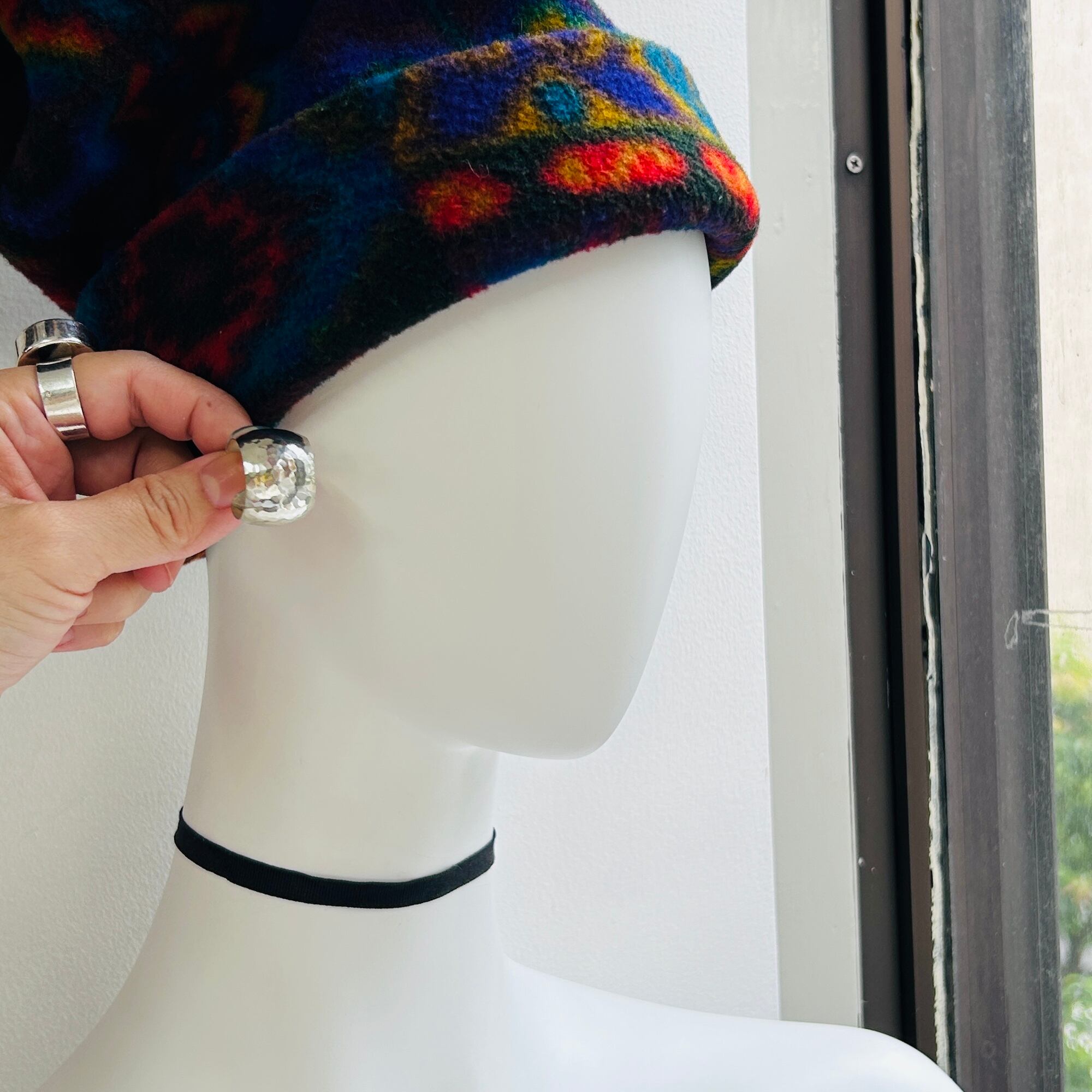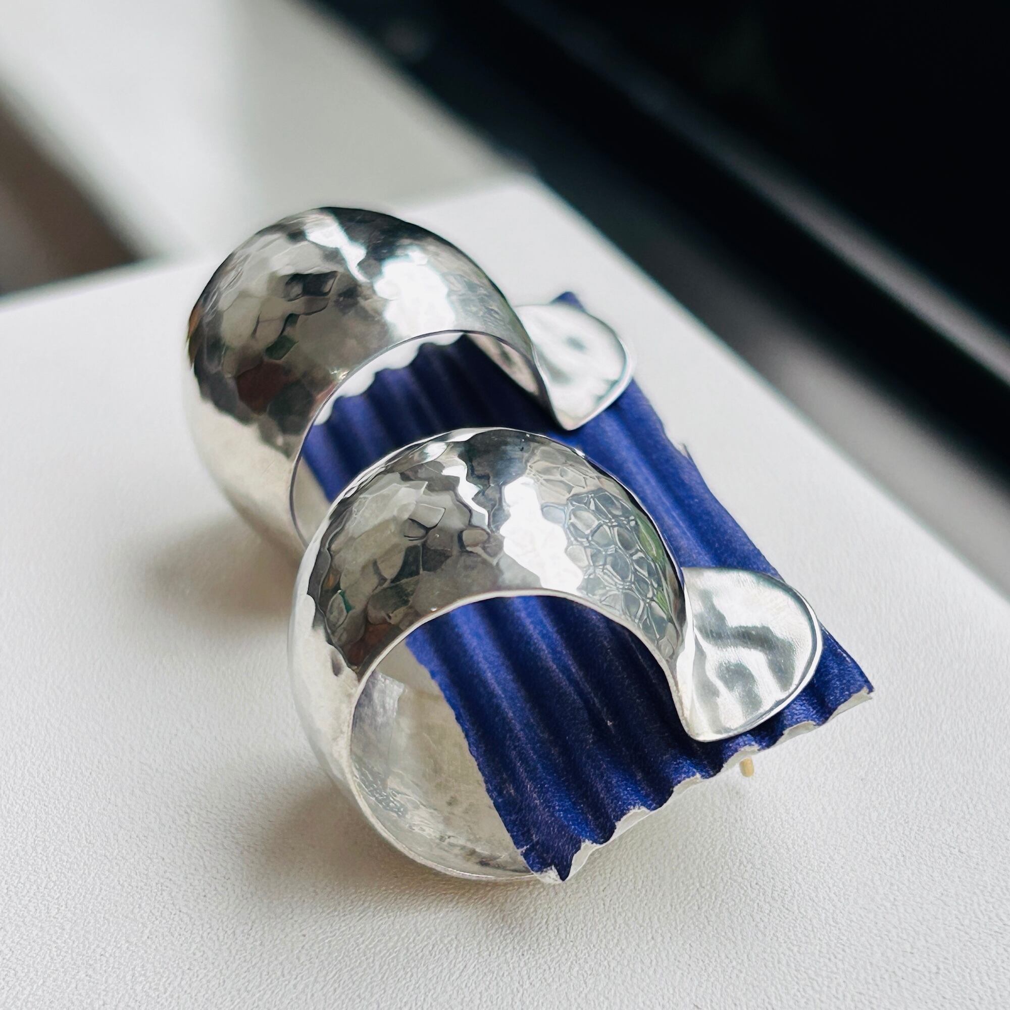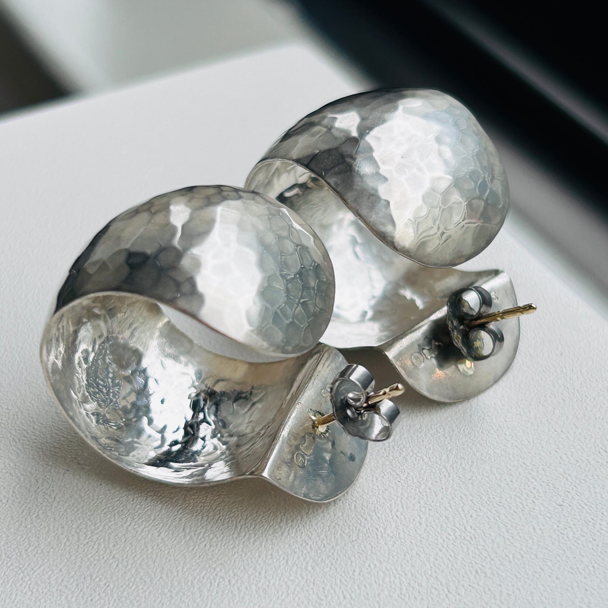 幅広でフラットな槌目プレートがコロンと丸まったフープピアス。槌目模様の眩い輝きが素敵です。針の付いている部分が立ち上がっていて着けやすく、安定感があります。写真では分かりにくいですが針に金メッキが施されています。金の含有率は刻印がないので分かりませんが金属アレルギーを考慮したメッキだと思います。刻印は「SS」とクマのような牛のようなマークとロゴマーク。恐らくネイティブ・アメリカンジュエリーだと思います。丁寧な作りで高級感のある大人なジュエリー。良いお品です。