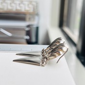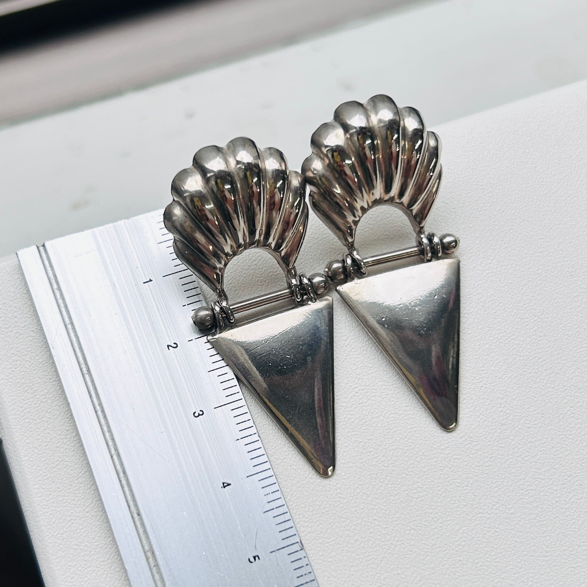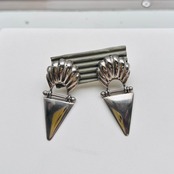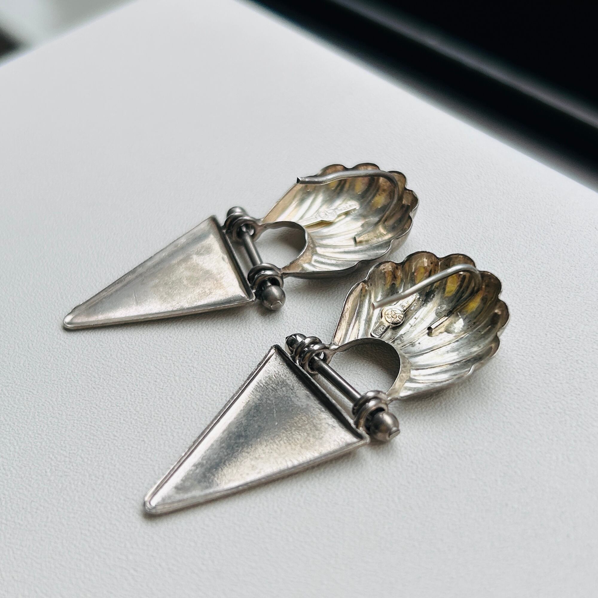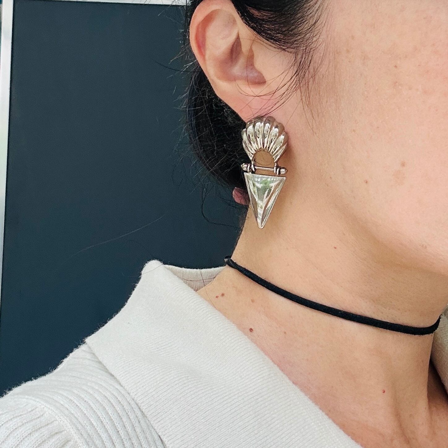 型押しシェルと長三角形の2パーツから成るピアス。三角形が揺れる面白いデザインです。引っ掛けるタイプのフック金具でしっかり耳に留まりつつユラユラ揺れてくれます。落とす心配がなさそうなカタチです。ツヤがあり、ややダークトーンなシルバーカラー。内側にイタリアンシルバーのホールマークとメーカーロゴがあります。