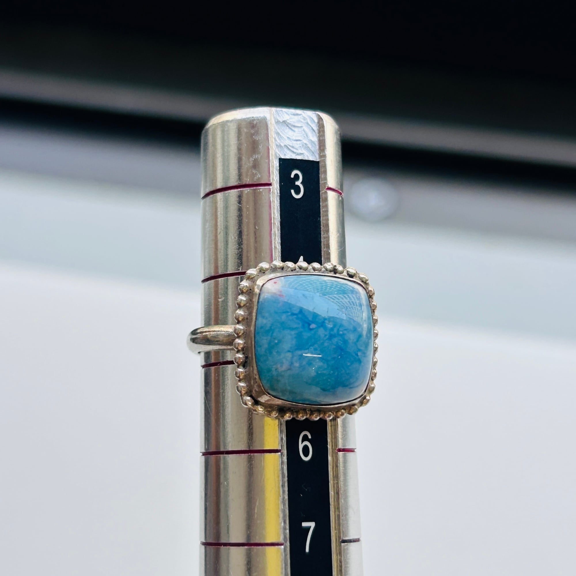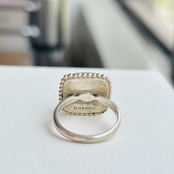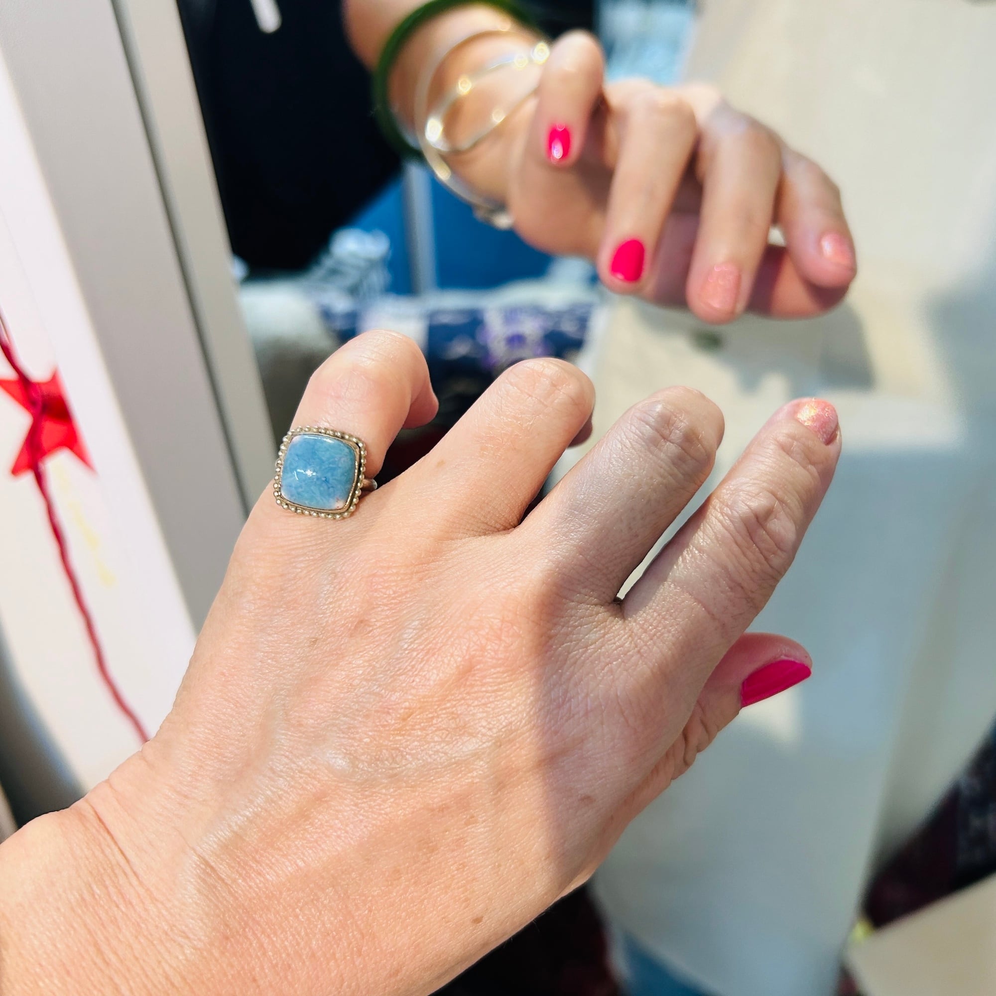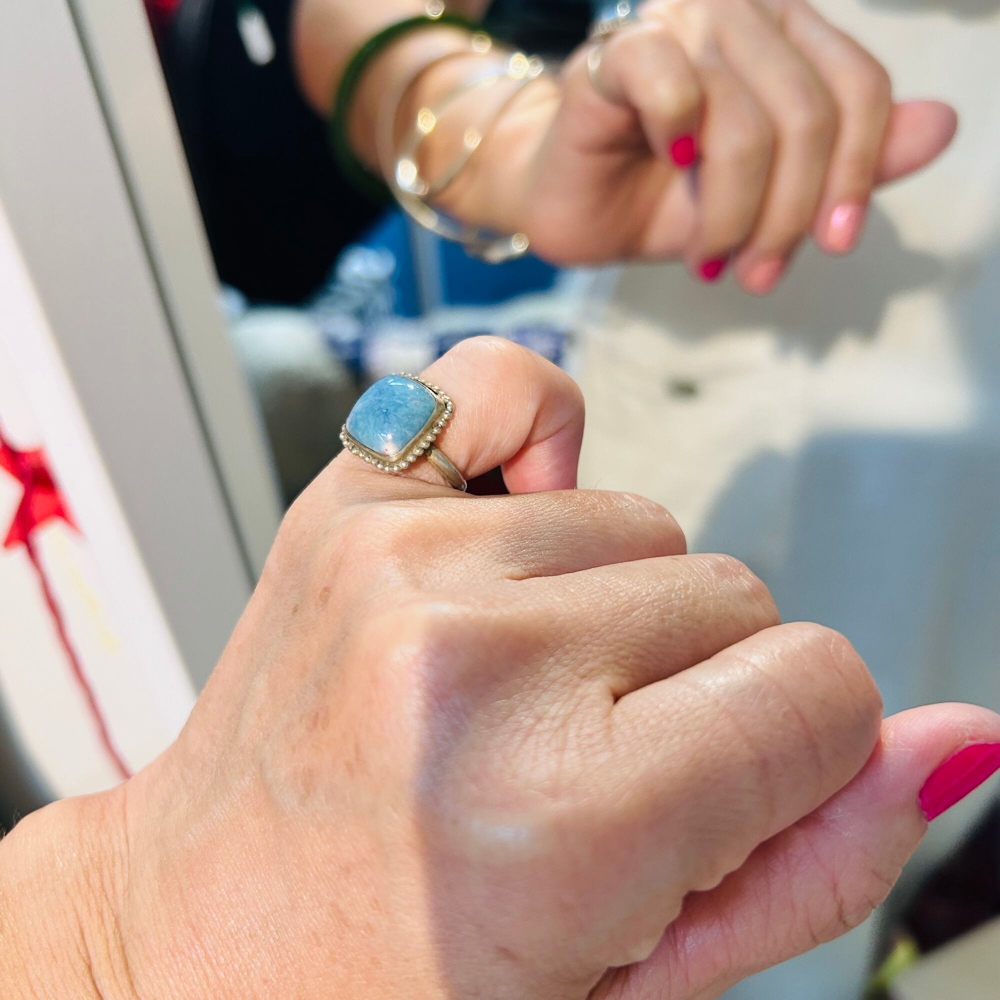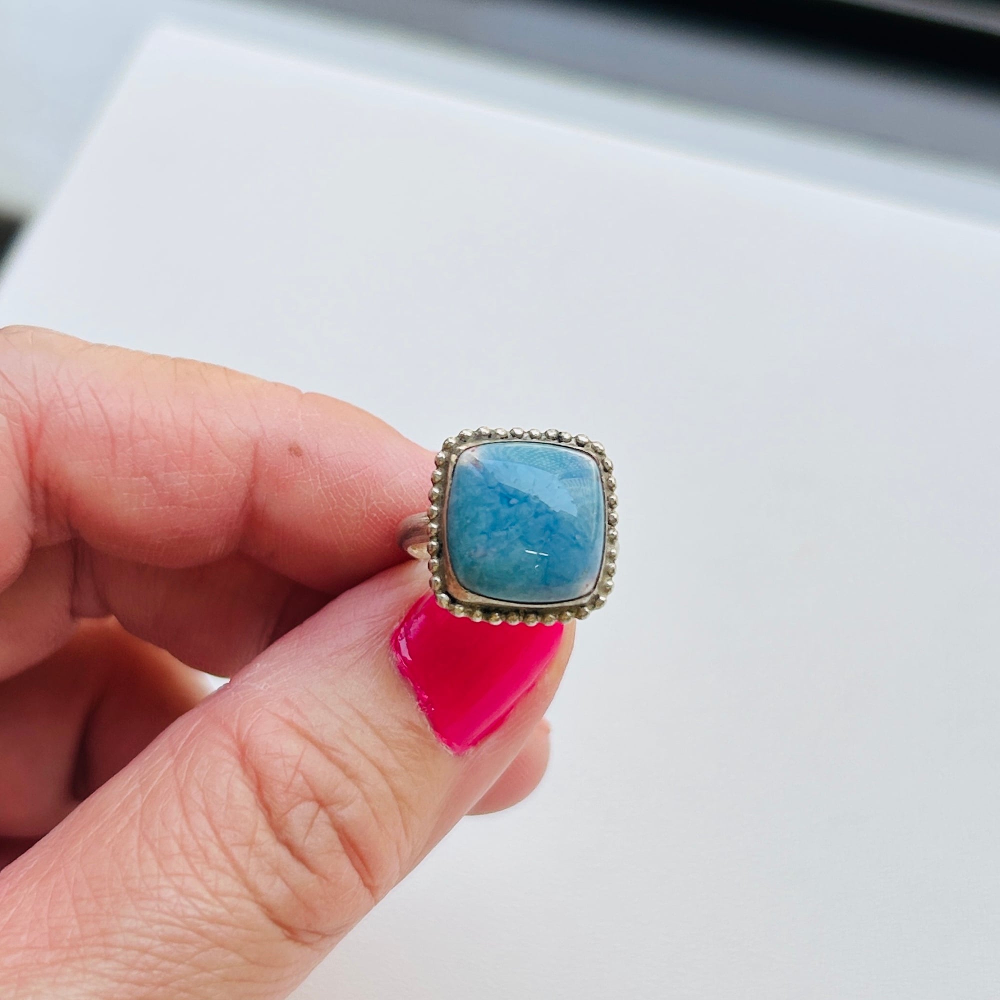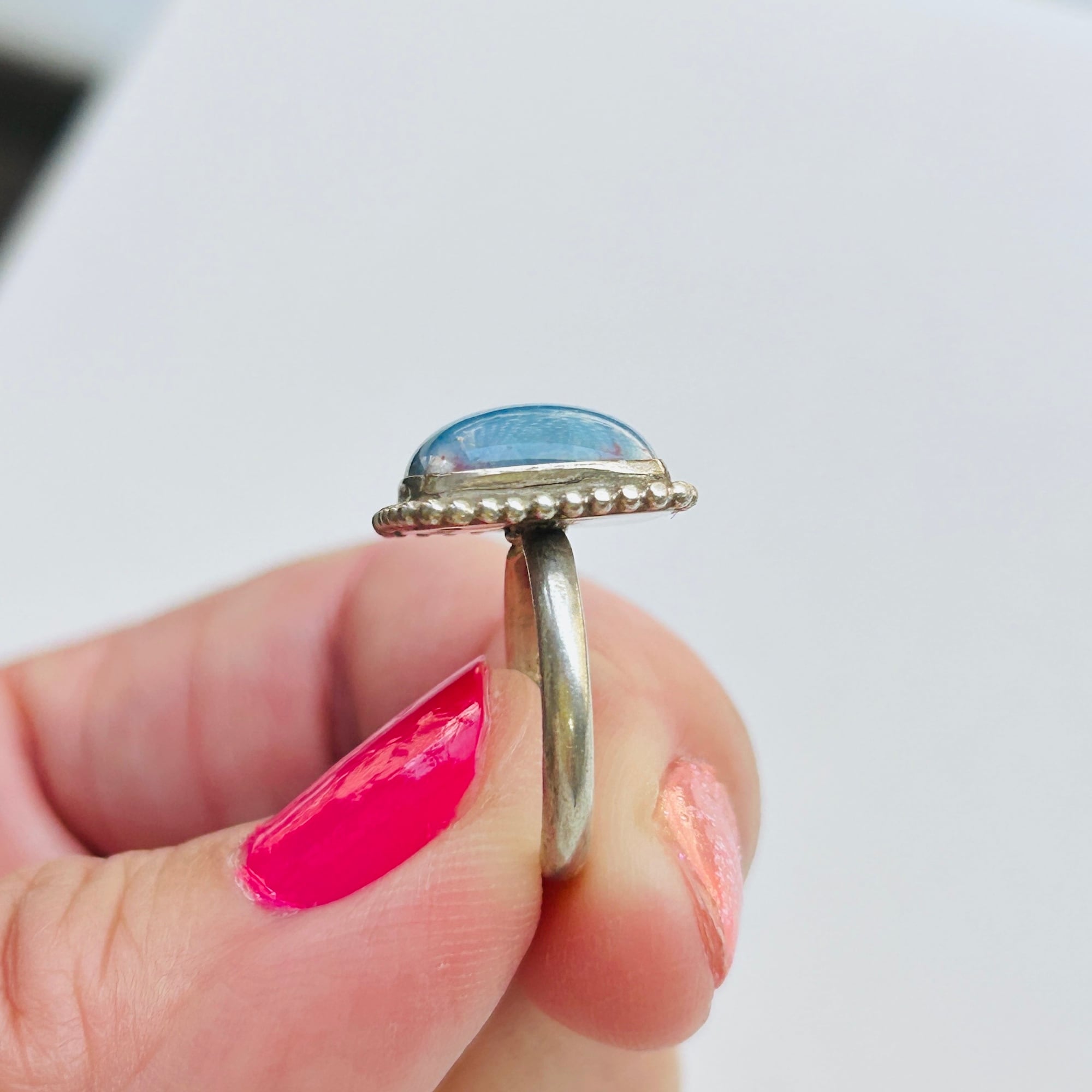 サイズが小さいブルーストーンリング。普通サイズのリングっぽいデザインなのに5号という小ささが魅力です。色がキレイなストーンは陶器のような素材。周りの粒々フレームもポイントです。シルバーはセミマットなツヤです。裏にメーカー名「RUSKIDE」。シルバー刻印はありませんがシルバー925です。