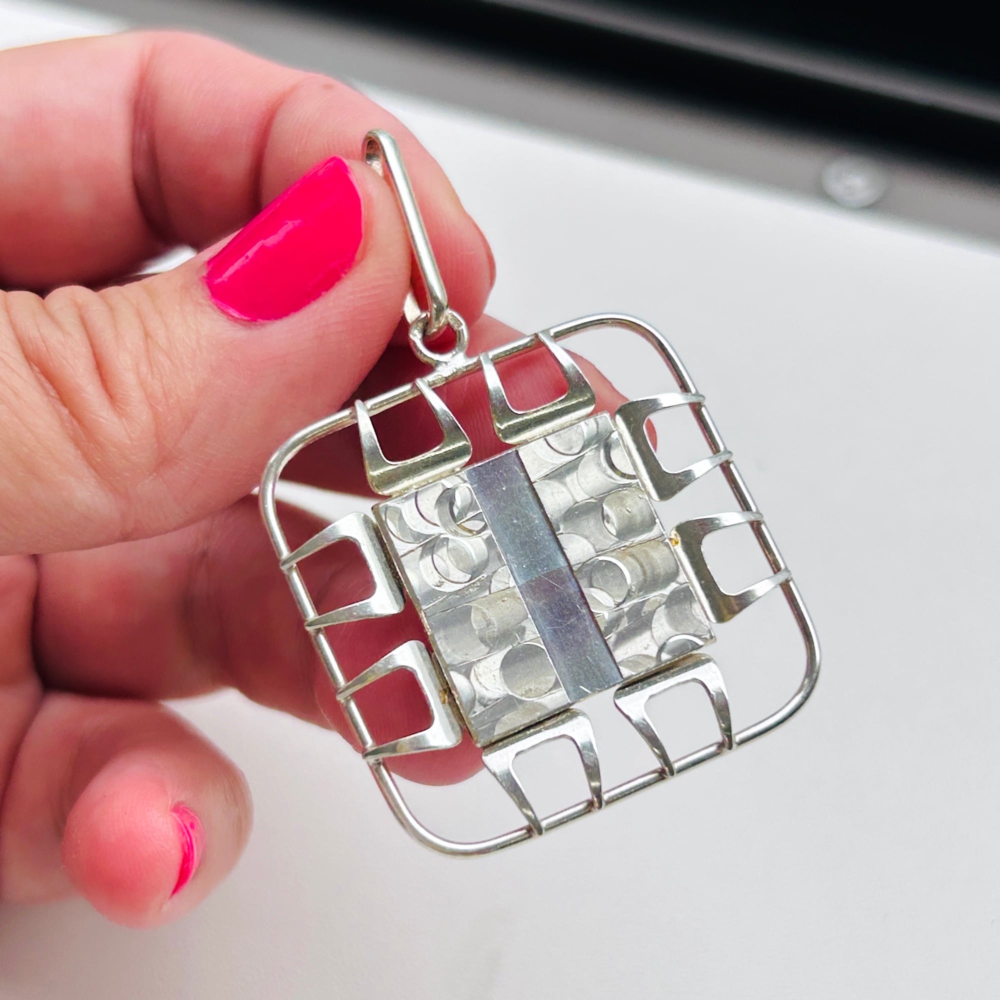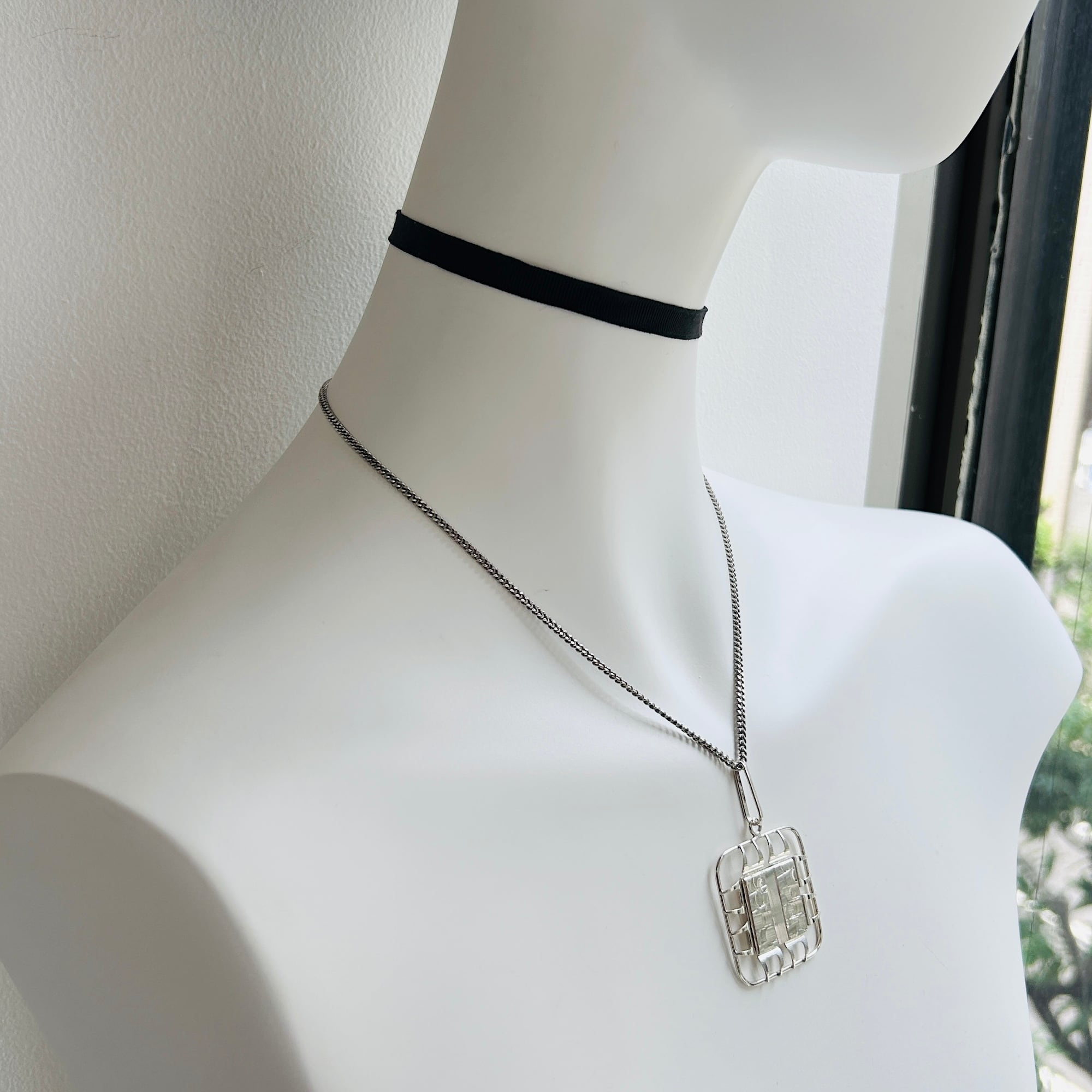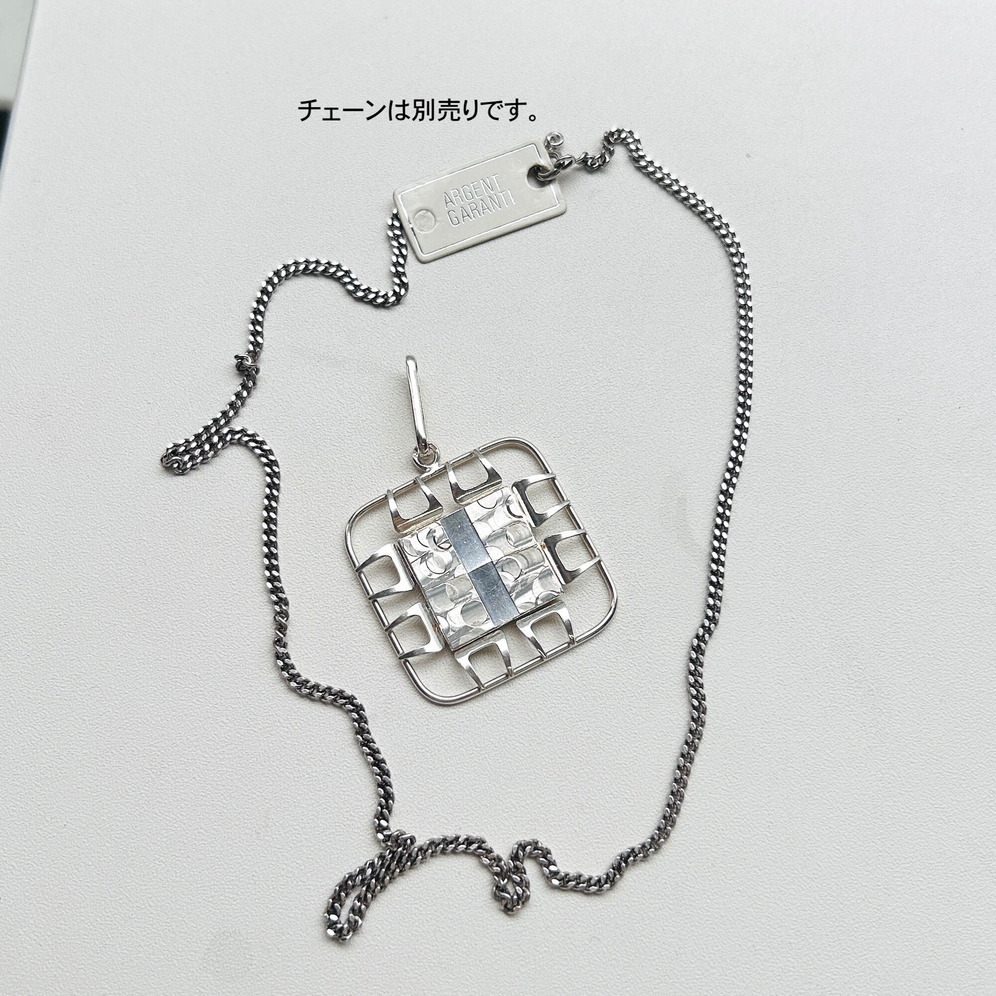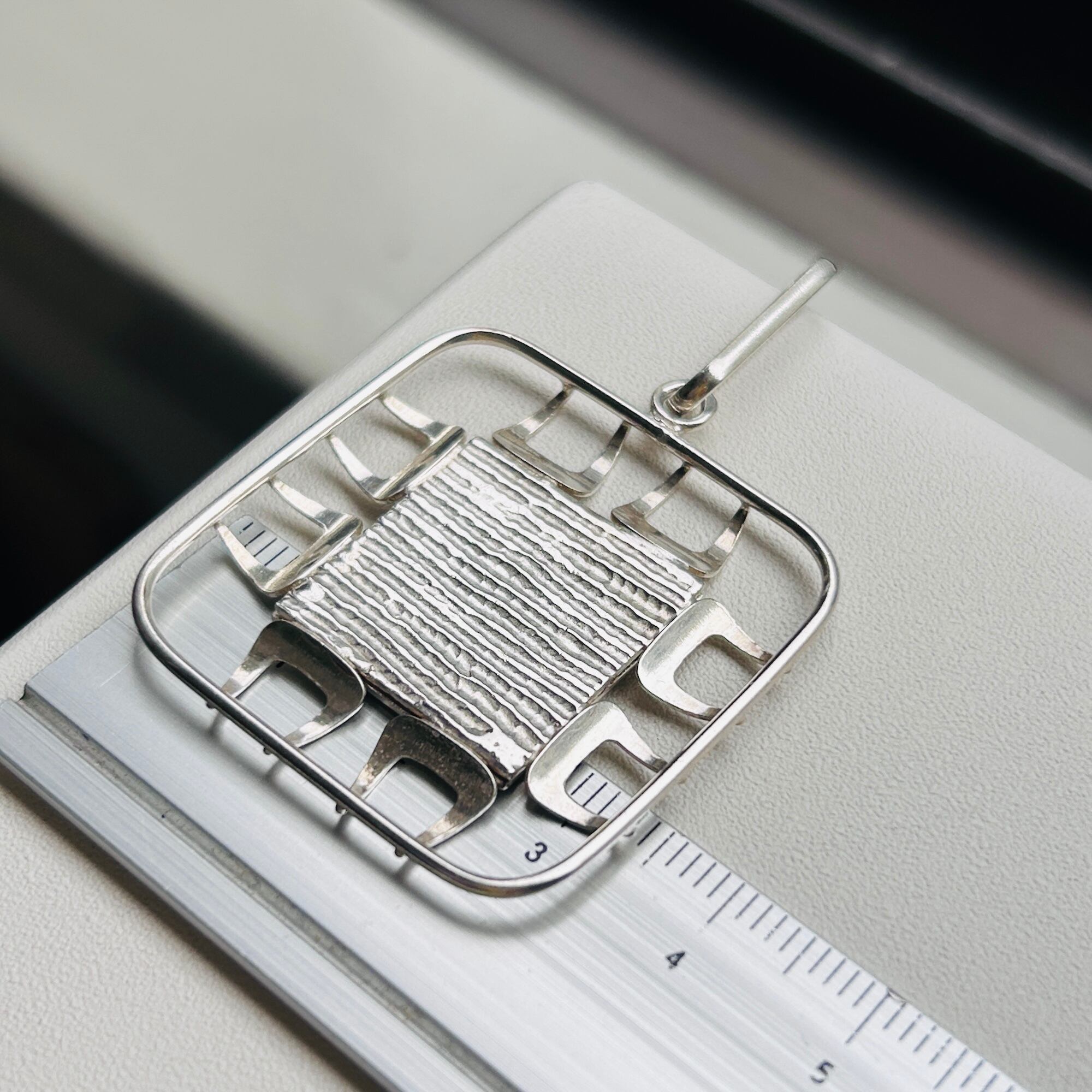 幾何学デザインのペンダントトップ。アウトラインスクエアの中に素敵な技法とデザインが詰まっています。チェーンを通すベイルは細長くてスタイリッシュです。ベイルが大きいと使いやすくて嬉しいですね。お手持ちのチェーンや革紐と合わせて下さい。ベイルが通っている丸い部分に刻印が3つ。「900」とメーカーマーク、チェコスロバキアのシルバー900を表す野ウサギマーク。製造年は1960−70年頃かと思います。