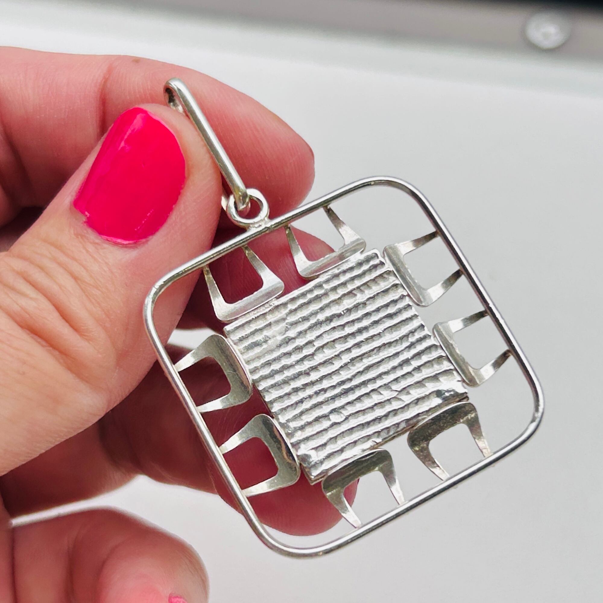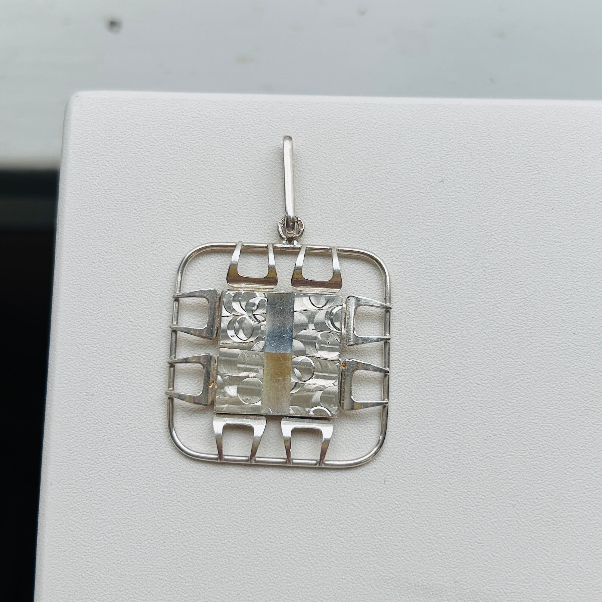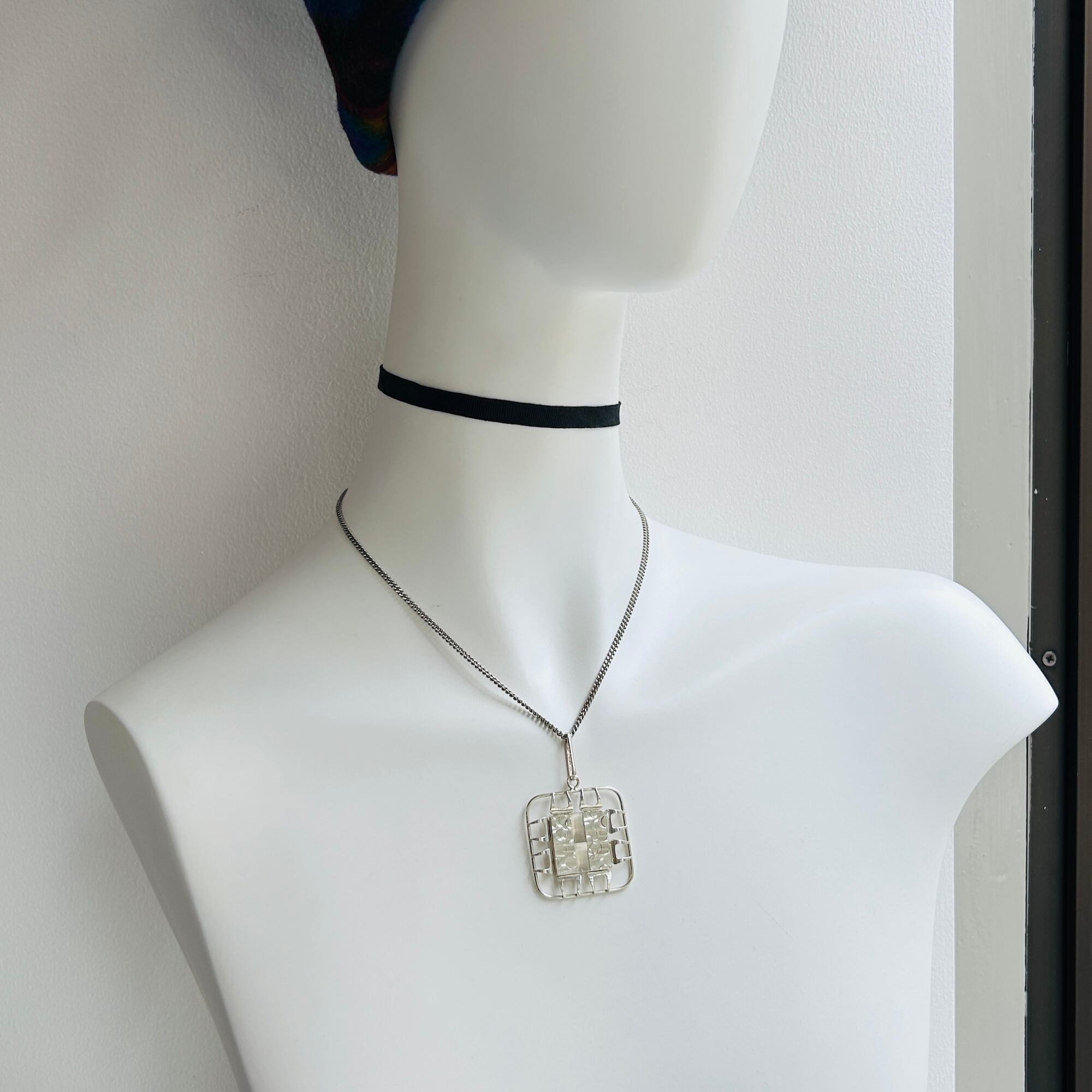 幾何学デザインのペンダントトップ。アウトラインスクエアの中に素敵な技法とデザインが詰まっています。チェーンを通すベイルは細長くてスタイリッシュです。ベイルが大きいと使いやすくて嬉しいですね。お手持ちのチェーンや革紐と合わせて下さい。ベイルが通っている丸い部分に刻印が3つ。「900」とメーカーマーク、チェコスロバキアのシルバー900を表す野ウサギマーク。製造年は1960−70年頃かと思います。