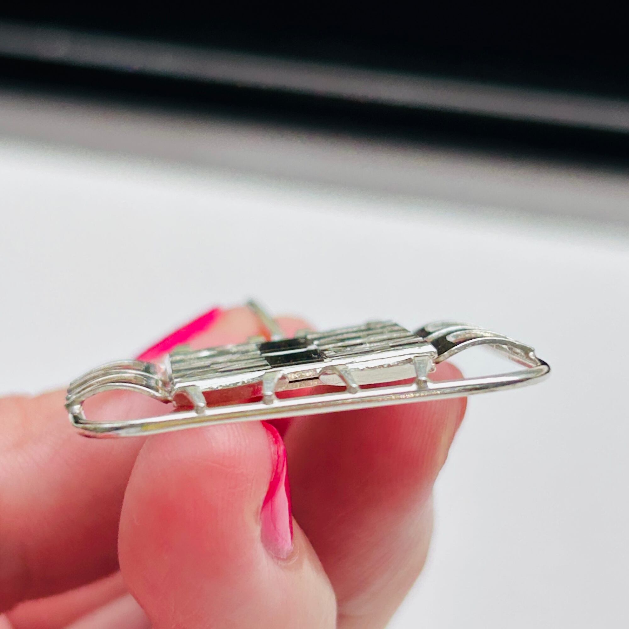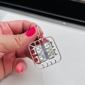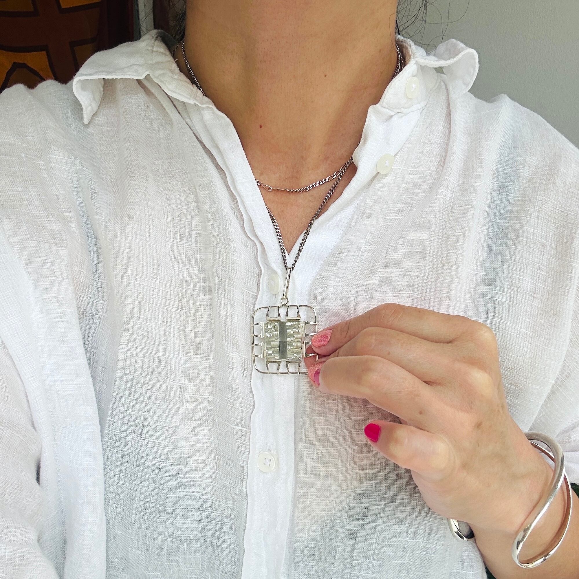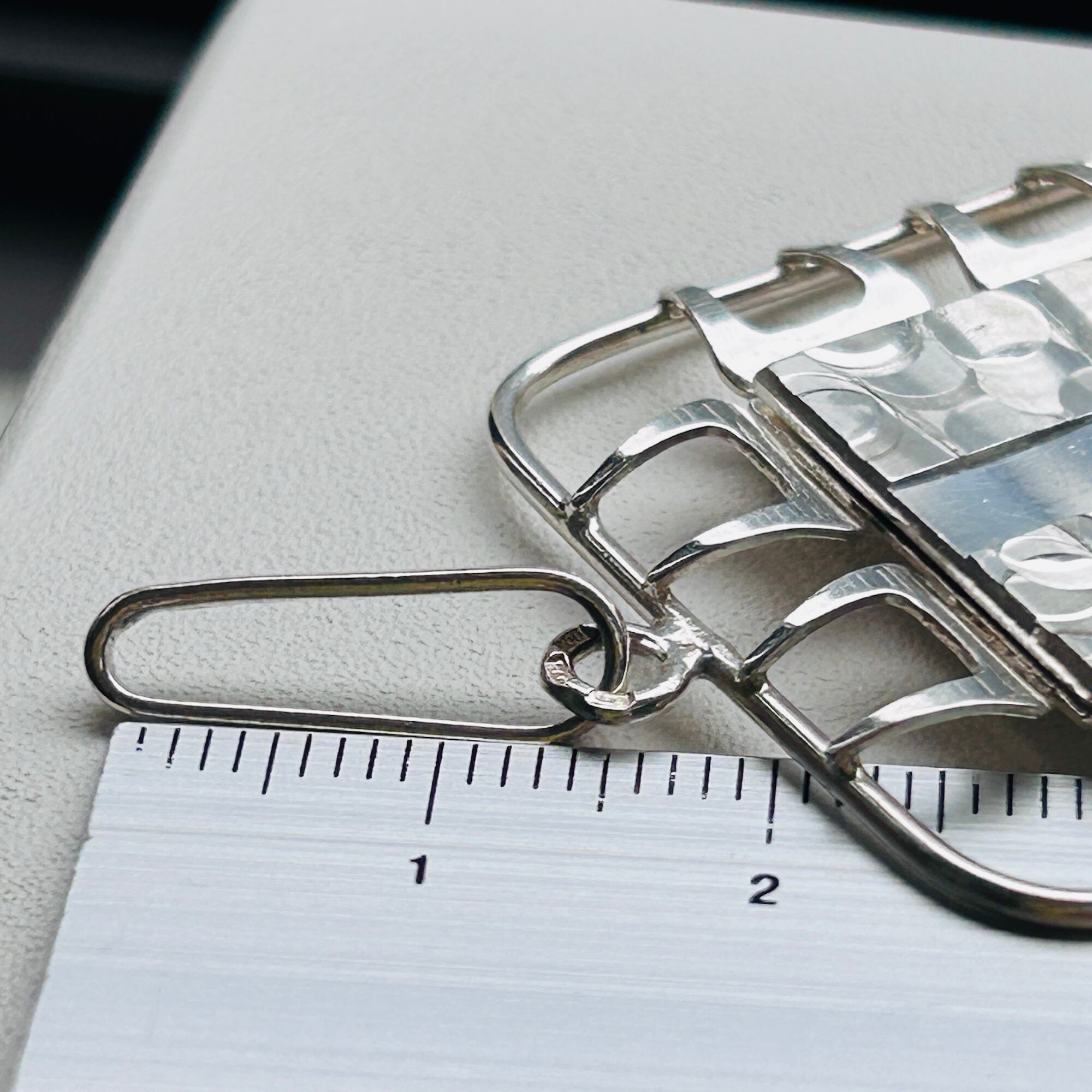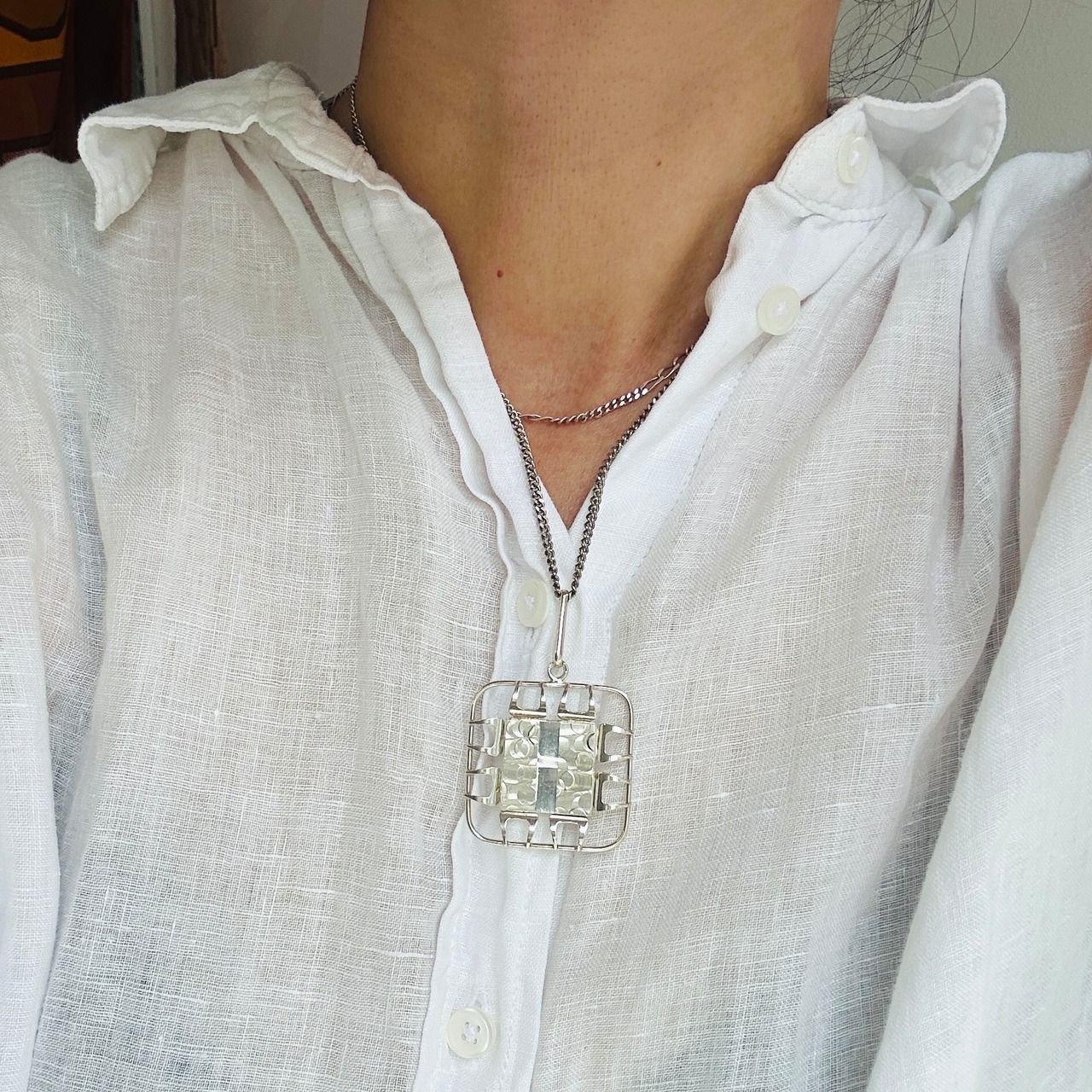 幾何学デザインのペンダントトップ。アウトラインスクエアの中に素敵な技法とデザインが詰まっています。チェーンを通すベイルは細長くてスタイリッシュです。ベイルが大きいと使いやすくて嬉しいですね。お手持ちのチェーンや革紐と合わせて下さい。ベイルが通っている丸い部分に刻印が3つ。「900」とメーカーマーク、チェコスロバキアのシルバー900を表す野ウサギマーク。製造年は1960−70年頃かと思います。