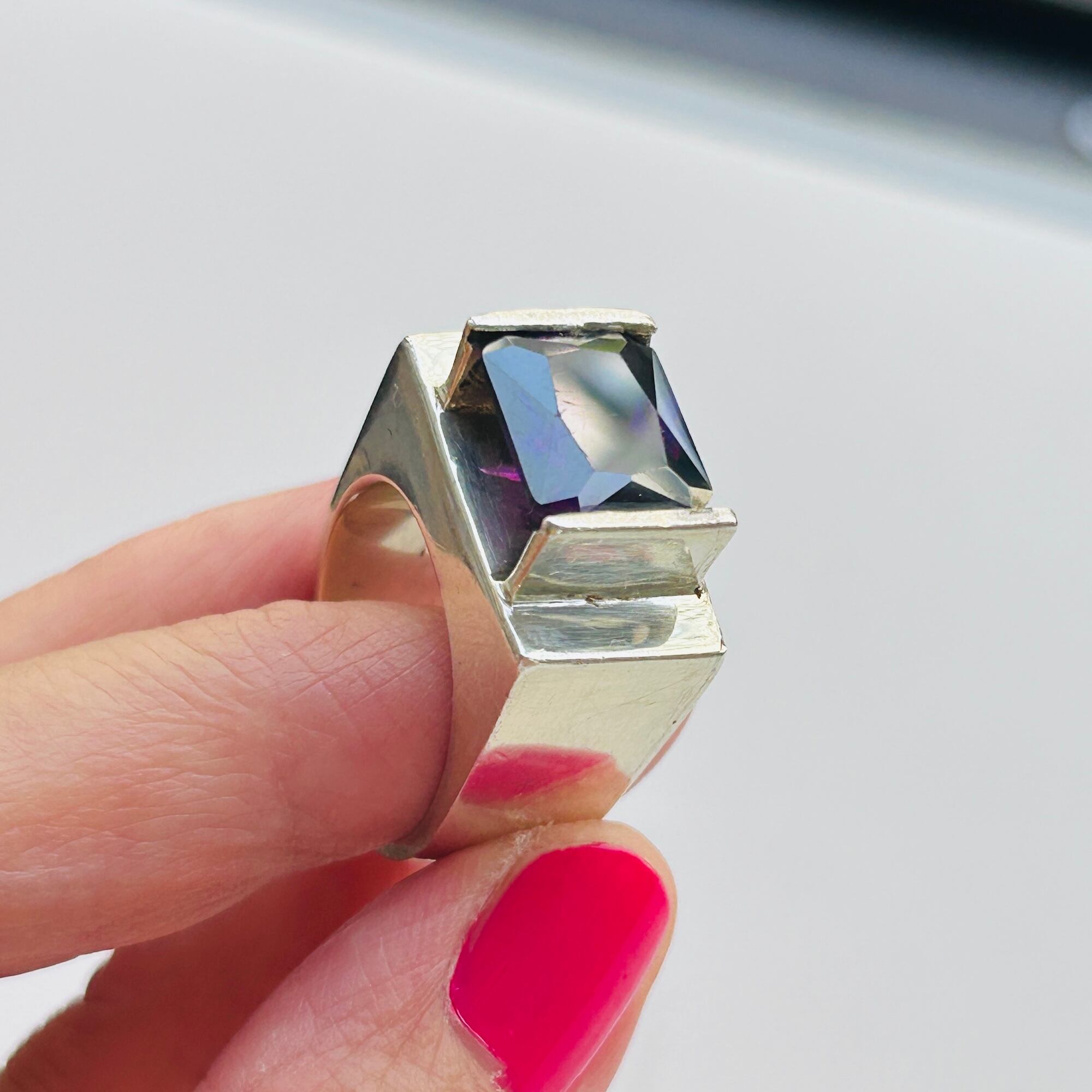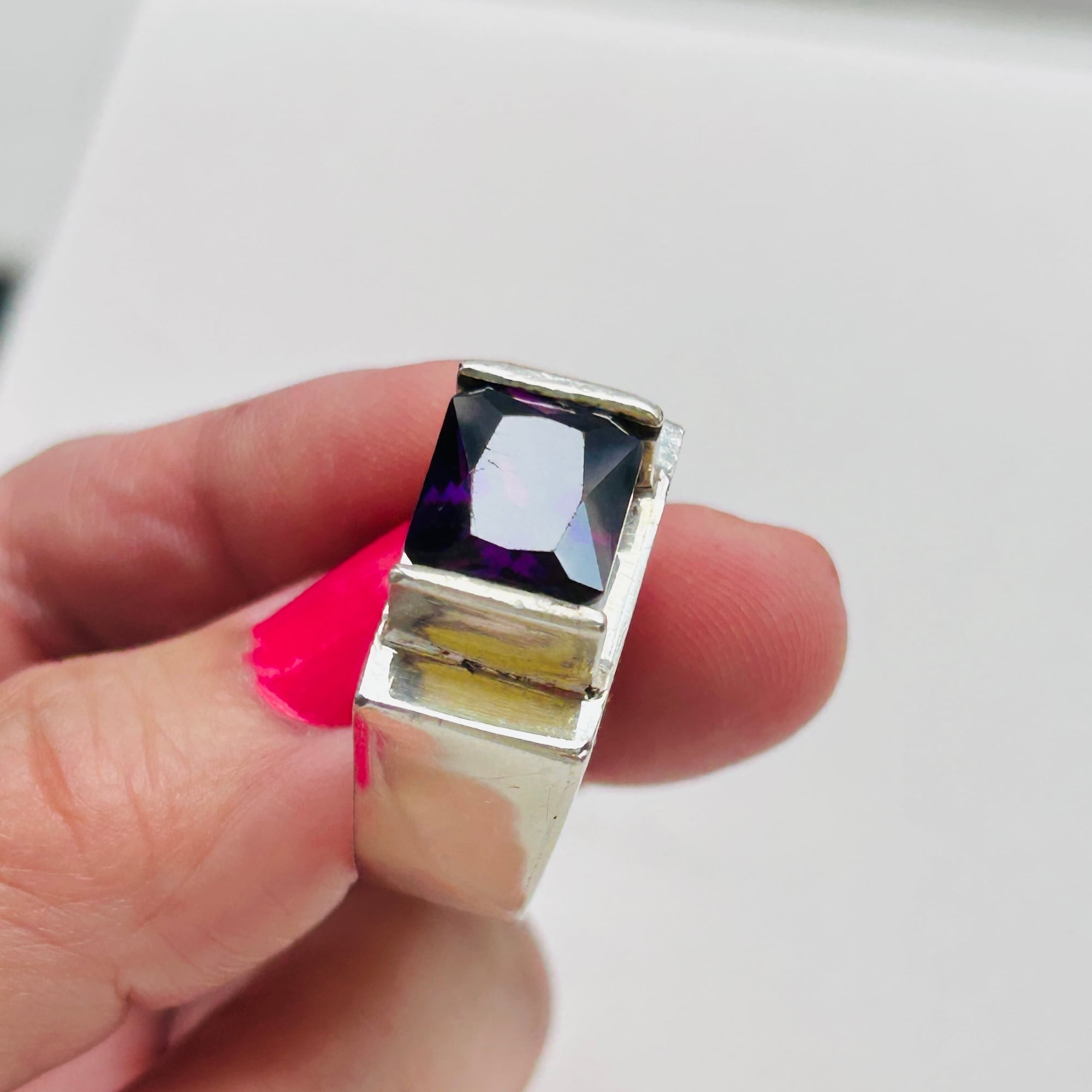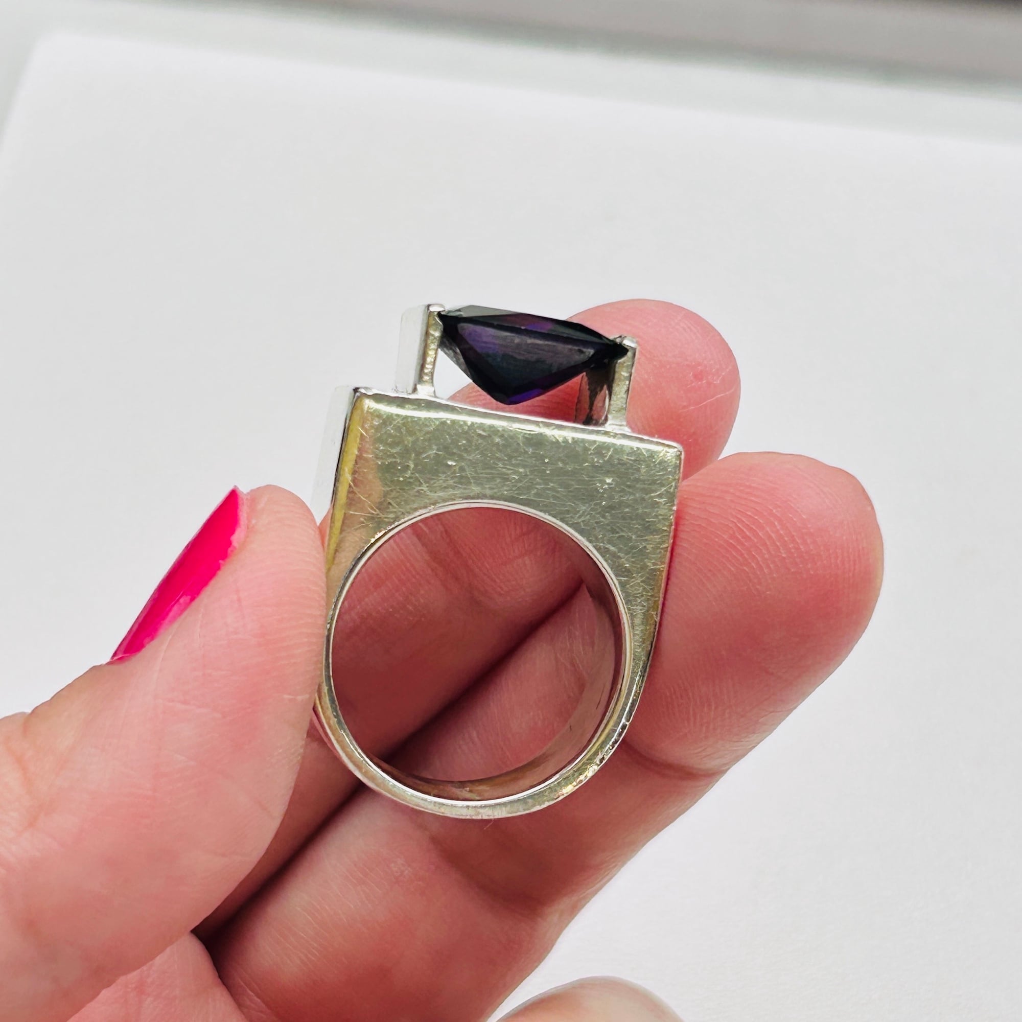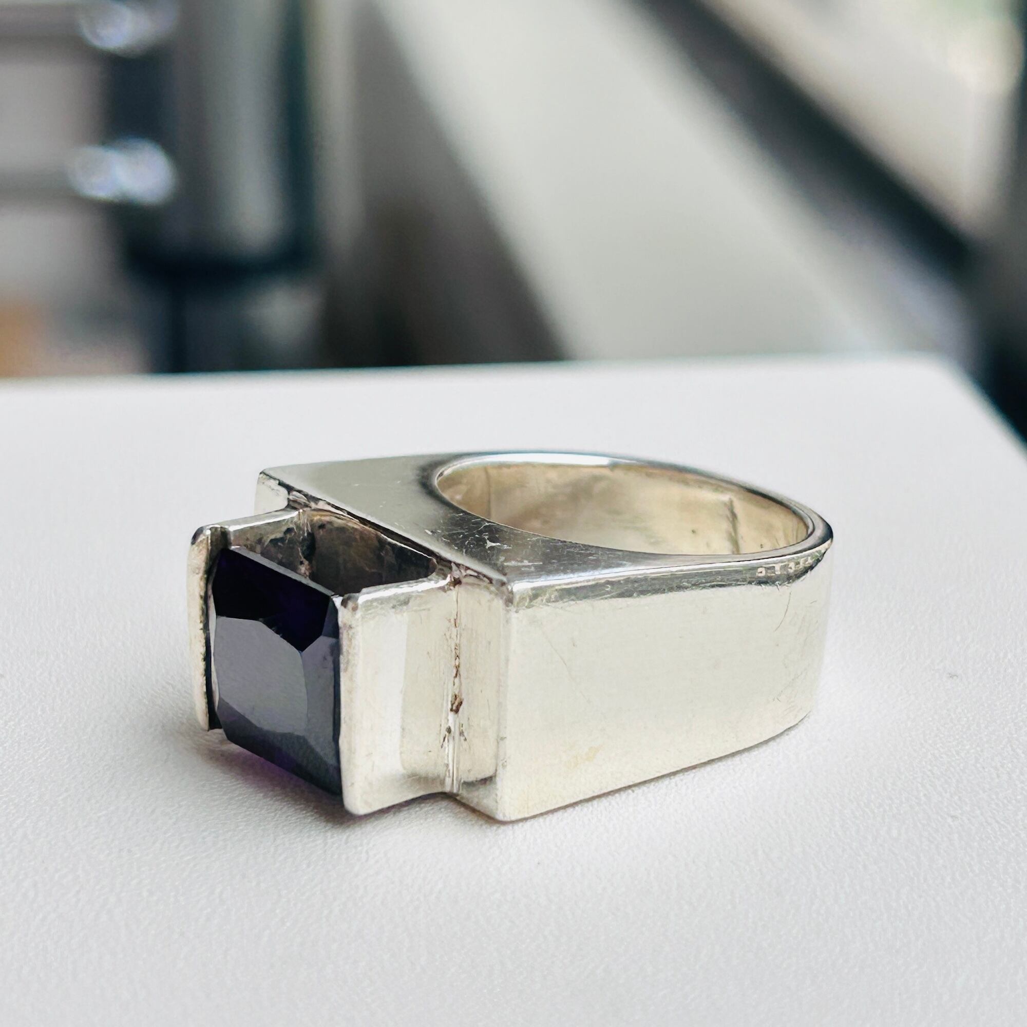 角ばった大振りリング。カクテルリングをデフォルメしたような遊びゴコロあるデザインです。トップはアメジストに見立てた合成ガラスストーンです。多少スリキズありますが欠けはありません。シルバー部分にも小傷が多少ありますが光沢あるシルバーで目立ちません。シルバーがふんだんに使われたヘビーなリング。刻印はありませんがシルバー925です。お出かけにいかがでしょうか。実寸より小さく感じると思います。
