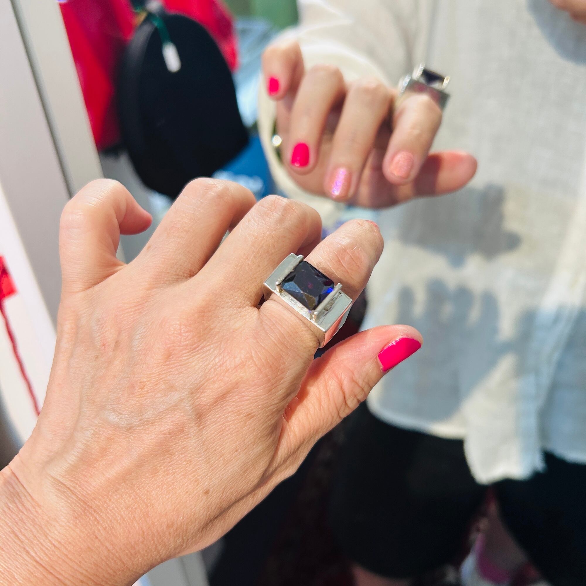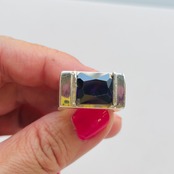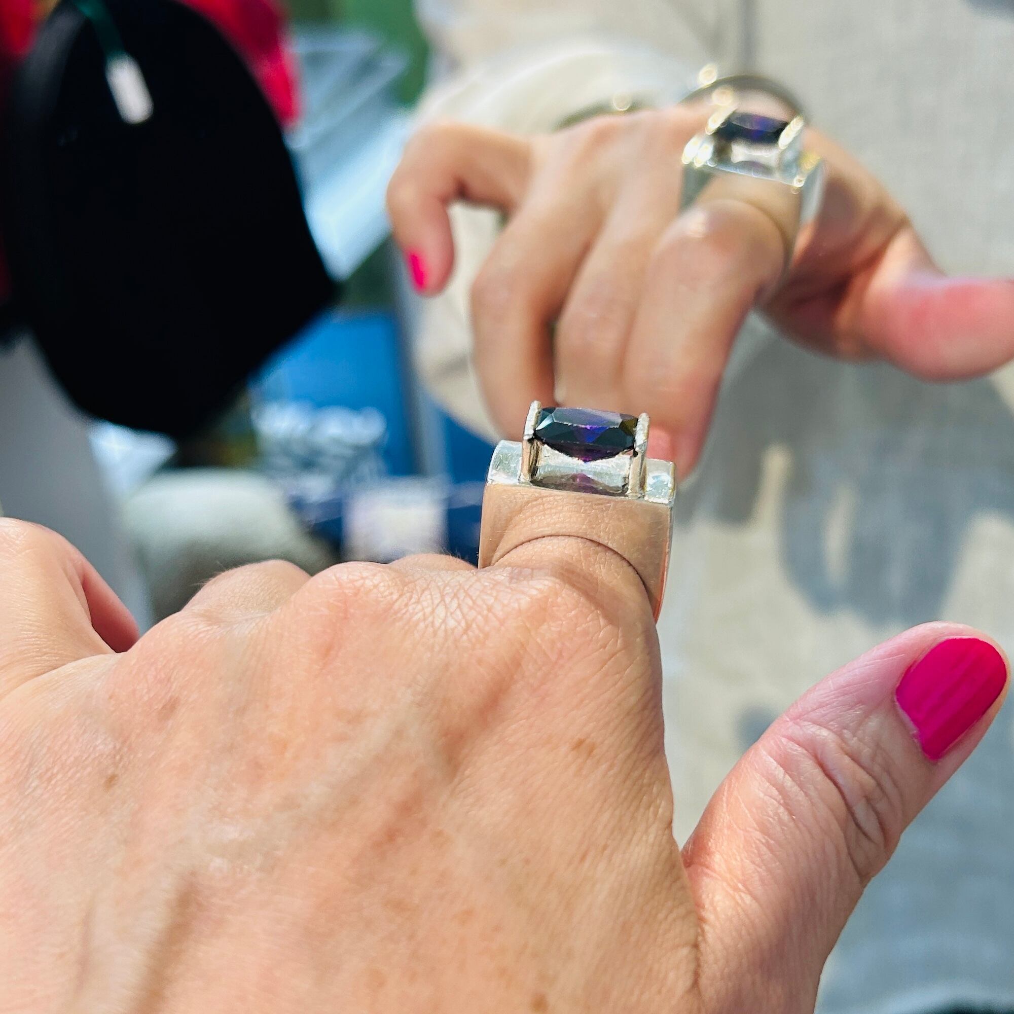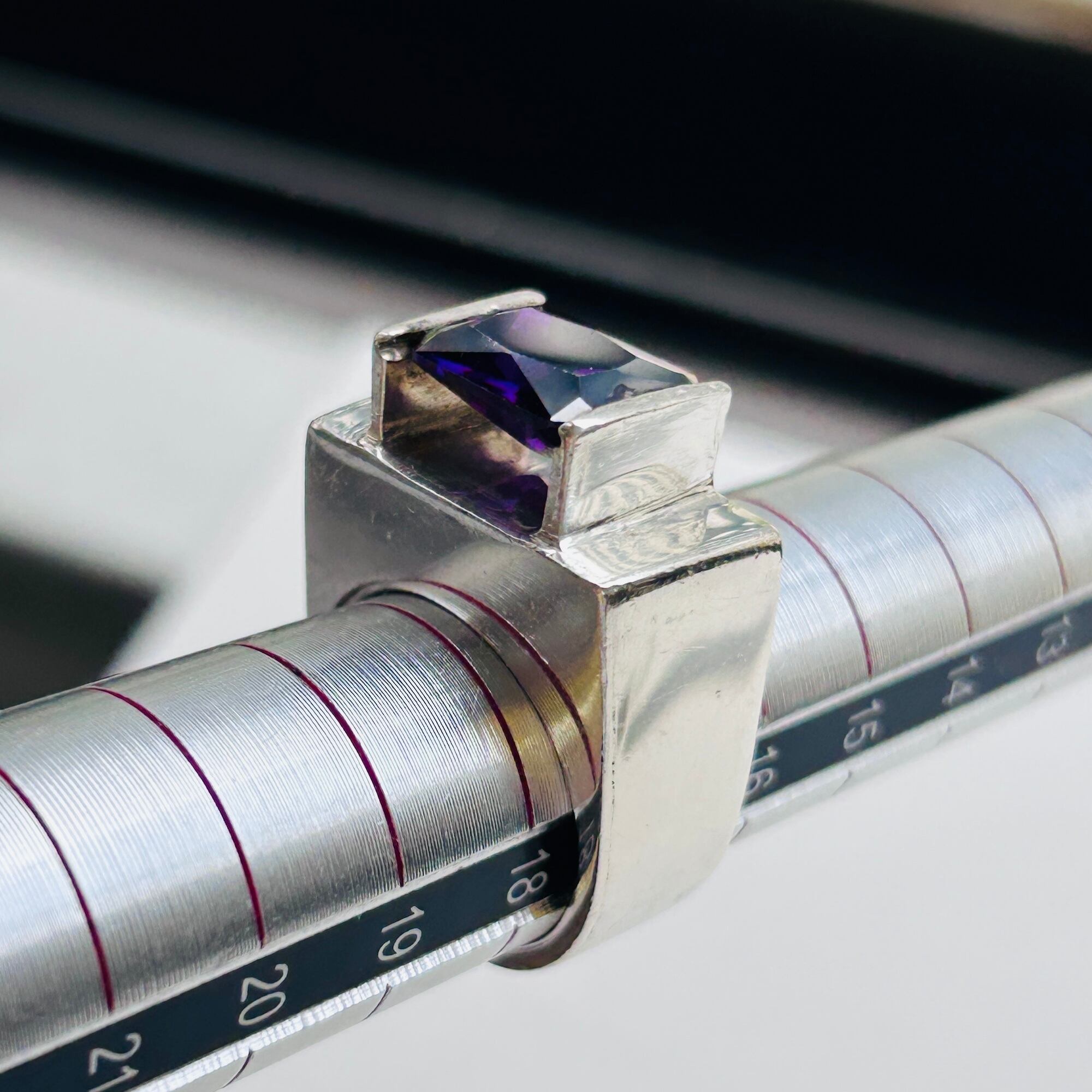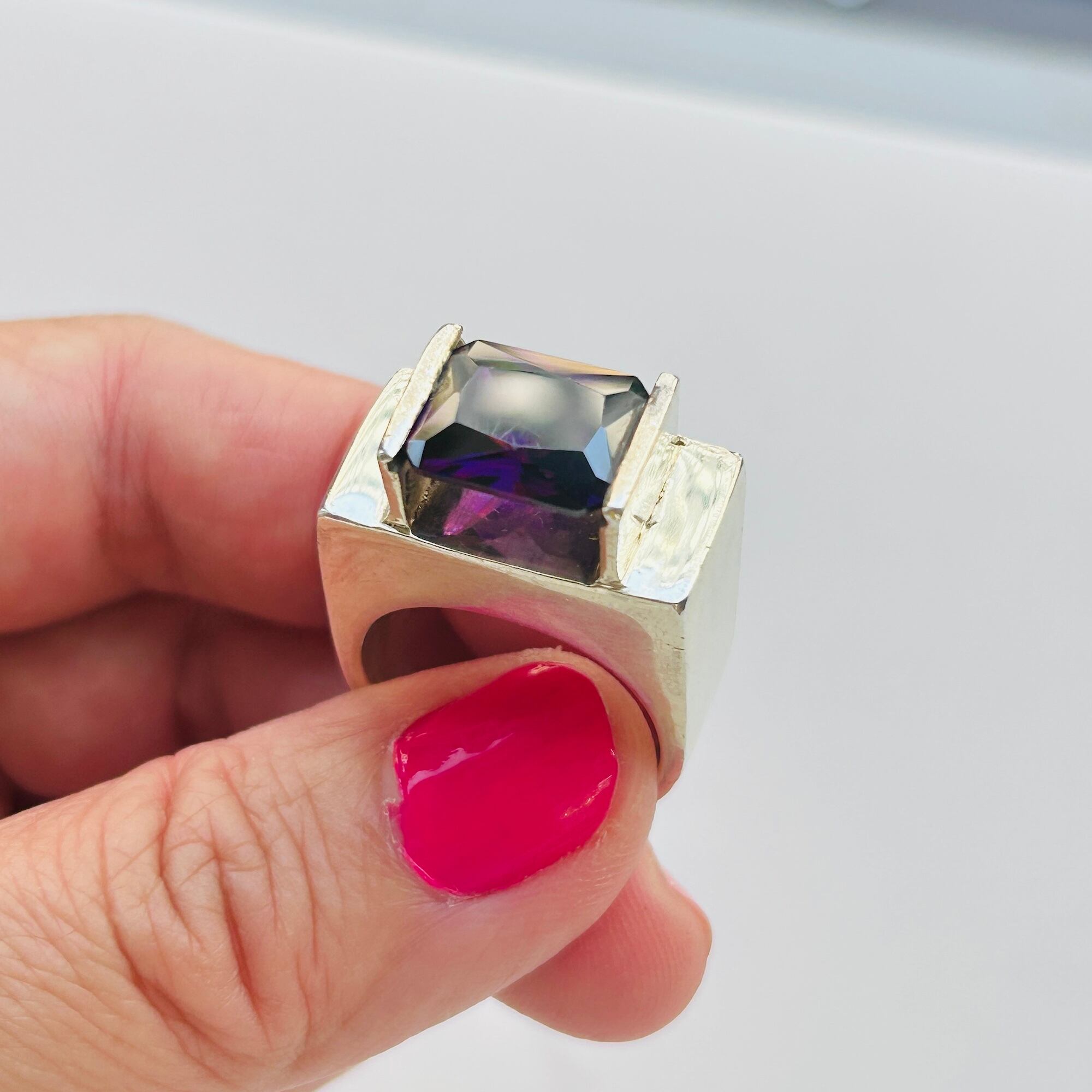 角ばった大振りリング。カクテルリングをデフォルメしたような遊びゴコロあるデザインです。トップはアメジストに見立てた合成ガラスストーンです。多少スリキズありますが欠けはありません。シルバー部分にも小傷が多少ありますが光沢あるシルバーで目立ちません。シルバーがふんだんに使われたヘビーなリング。刻印はありませんがシルバー925です。お出かけにいかがでしょうか。実寸より小さく感じると思います。