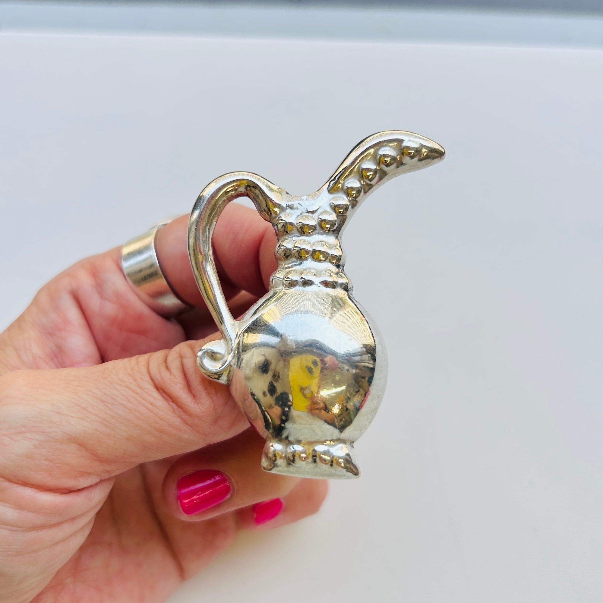 縦長のピッチャーブローチ。大きな注ぎ口とハンドルの外国っぽいユニークなカタチが魅力。映えるブローチです。粒々装飾も立体感が出て効果的です。シンプルニットやスウェット、ブレザーに着けて、大人っぽくカッコよい着こなしに!ブローチ上部に穴があり中は空洞の作りです。下から上向きに刺す縦型の針は扱いやすいです。金具の動きに問題ありません。「STERLING」と金具の下で見えない刻印。メキシカンシルバーだと思います。