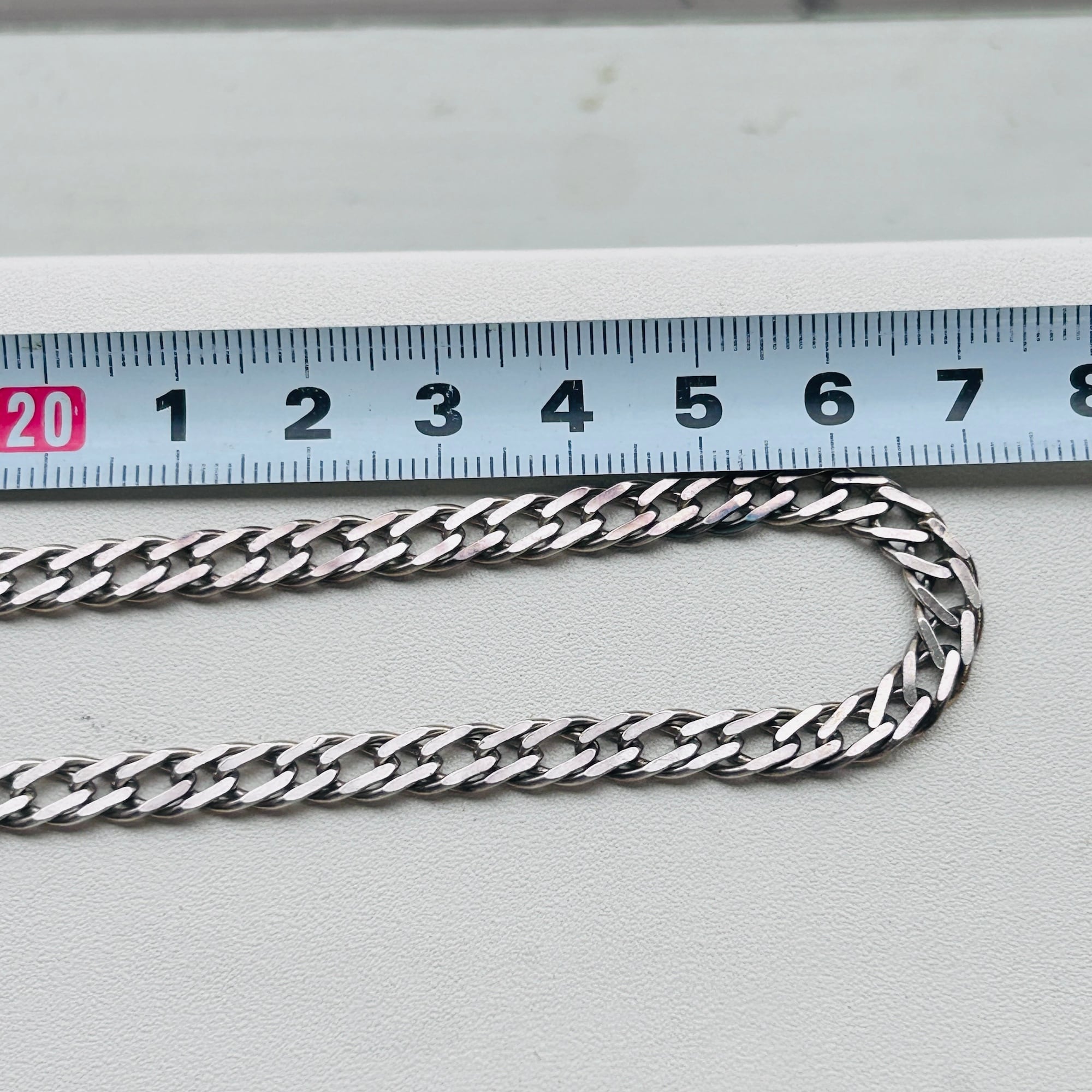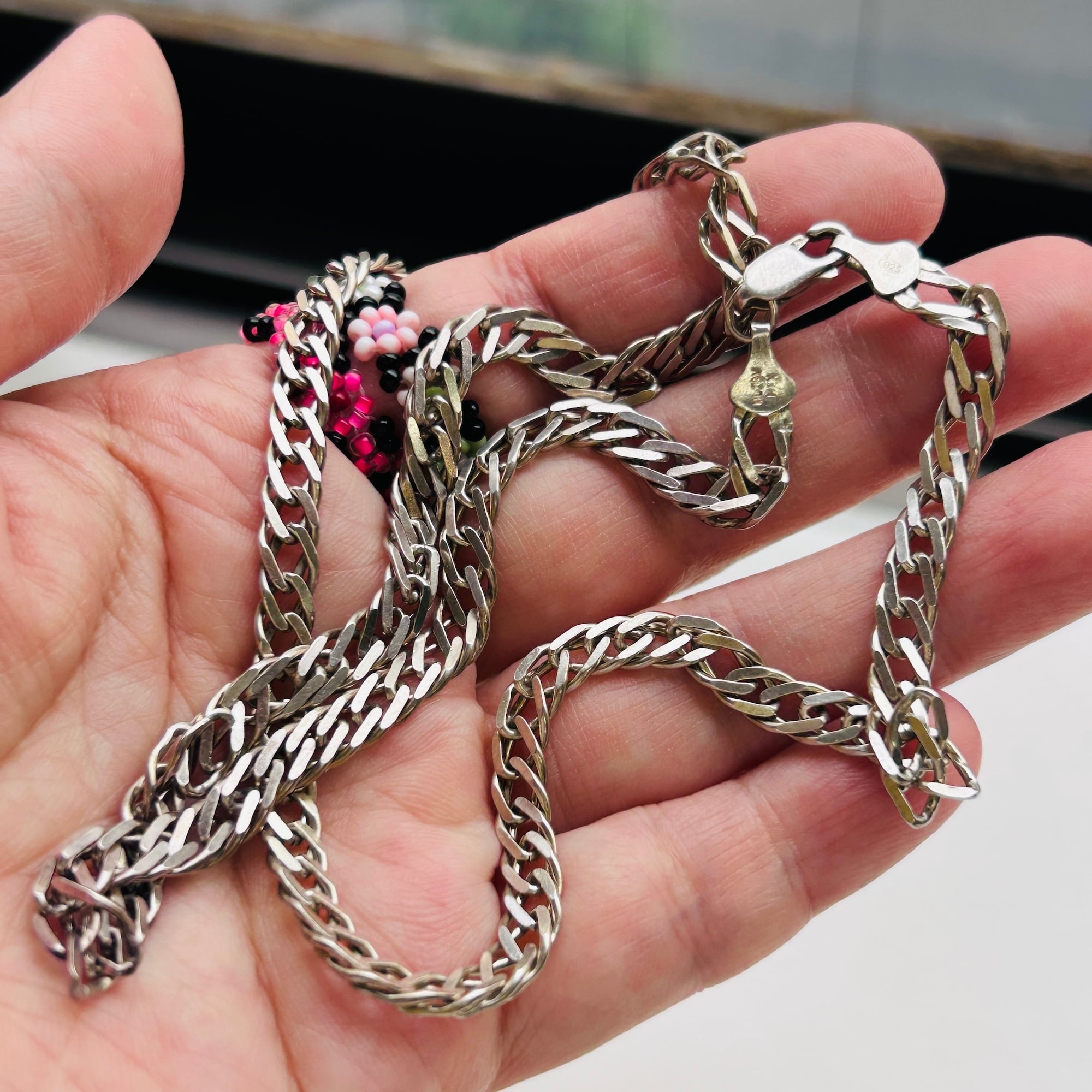 細かくて滑らかなキヘイチェーンネックレス。コマが多く通常の2〜3倍程のコマが使われているように思います。細かいので柔らかく自在に動きます。幅広でメンズライクな作りにエレガントな雰囲気。重量もそこそこありますので厚地のトップスにも落ち着いてくれます。シンプルコーデを格上げしてくれる大人なチェーン。「MEX925」刻印。