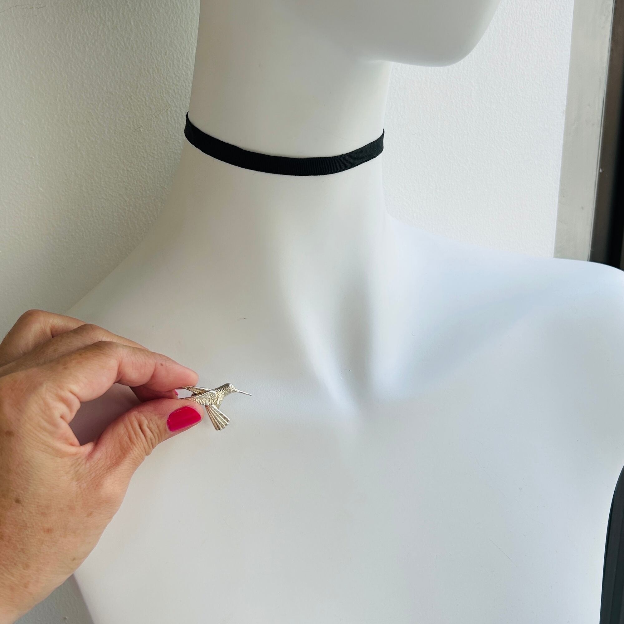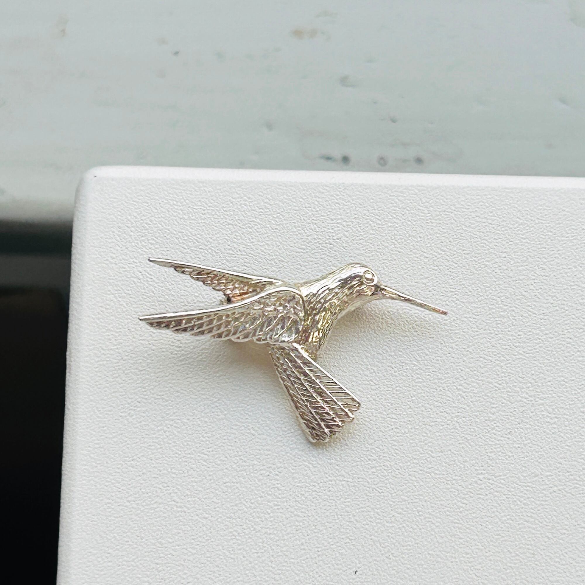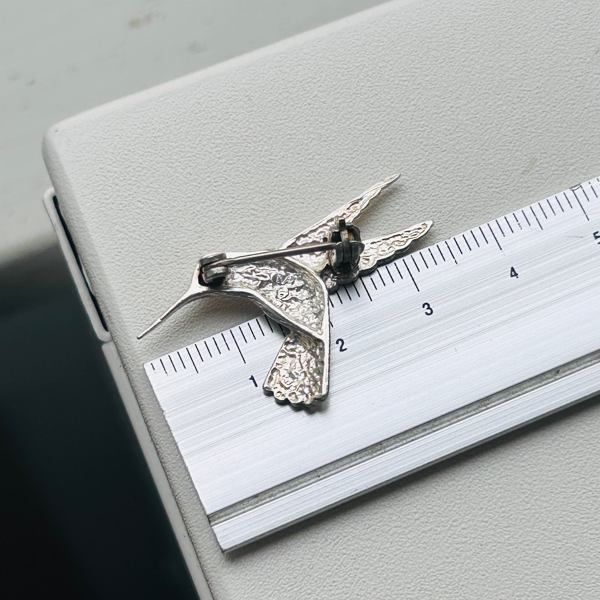 小さなバードブローチ。ハチドリ(英:Humming Bird)モチーフです。小ぶりですがリアルなカタチと模様で映えるデザインです。針は1.2cm程度と短いです。風車が右側にあります。裏に「925」と©︎マーク・メーカーマーク刻印。品のある良いお品です。Good Price:)