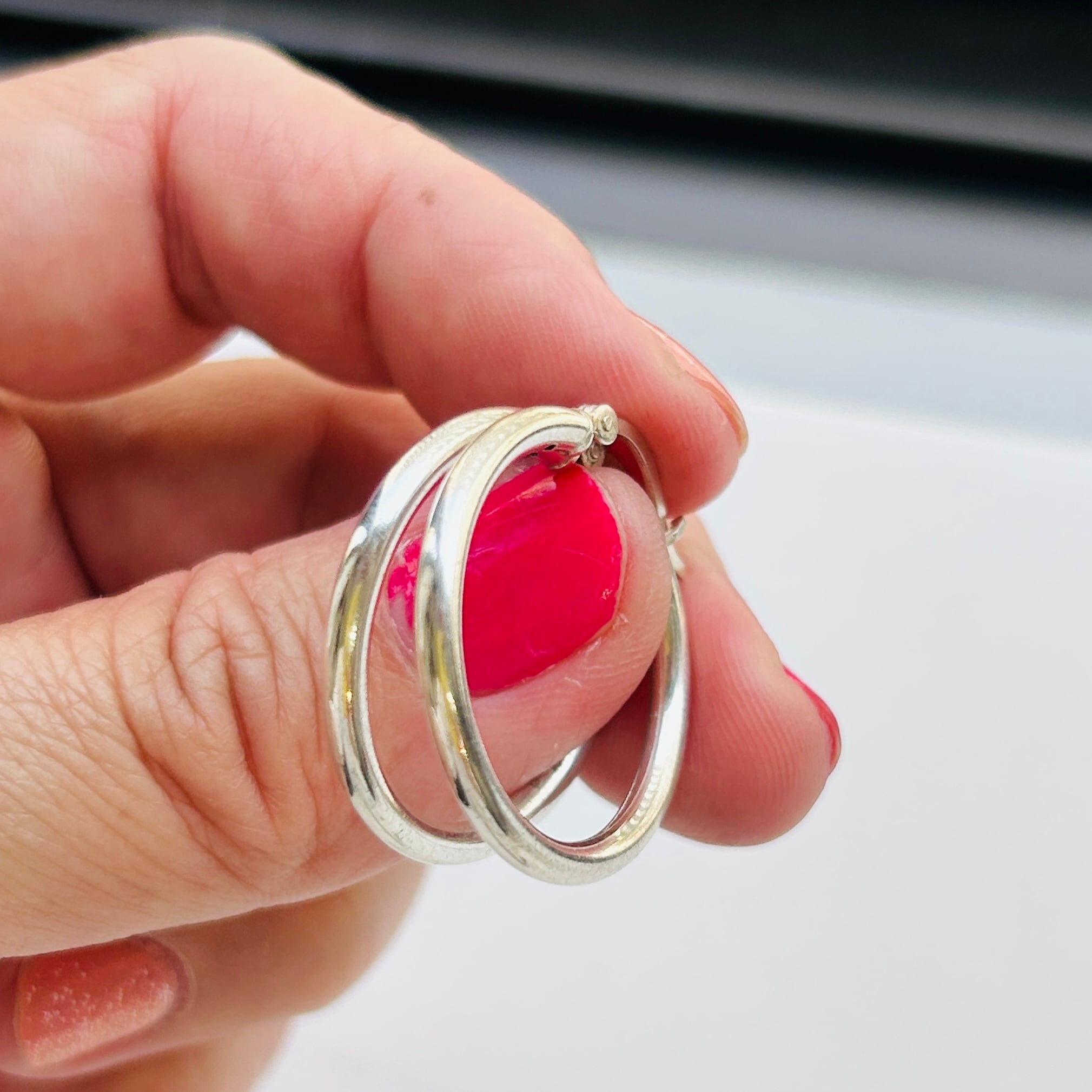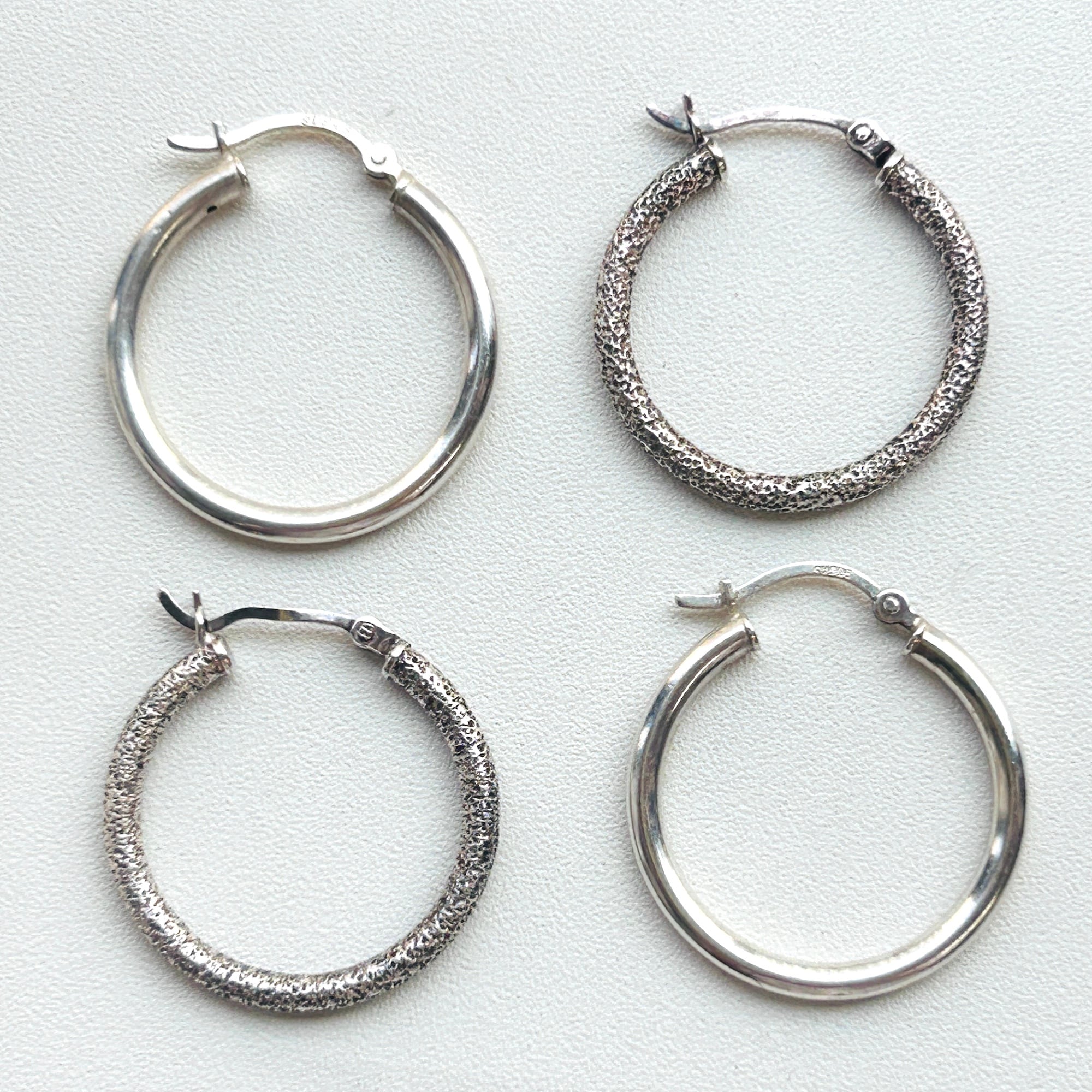 シンプルなフープピアス。直径2.5cm、チューブ径2.5mm。シンプル is ベストです。針に「925」刻印。針を取り外す際はフープ本体をしっかり抑えながら針を持ち上げると金具に負担がかかりません。