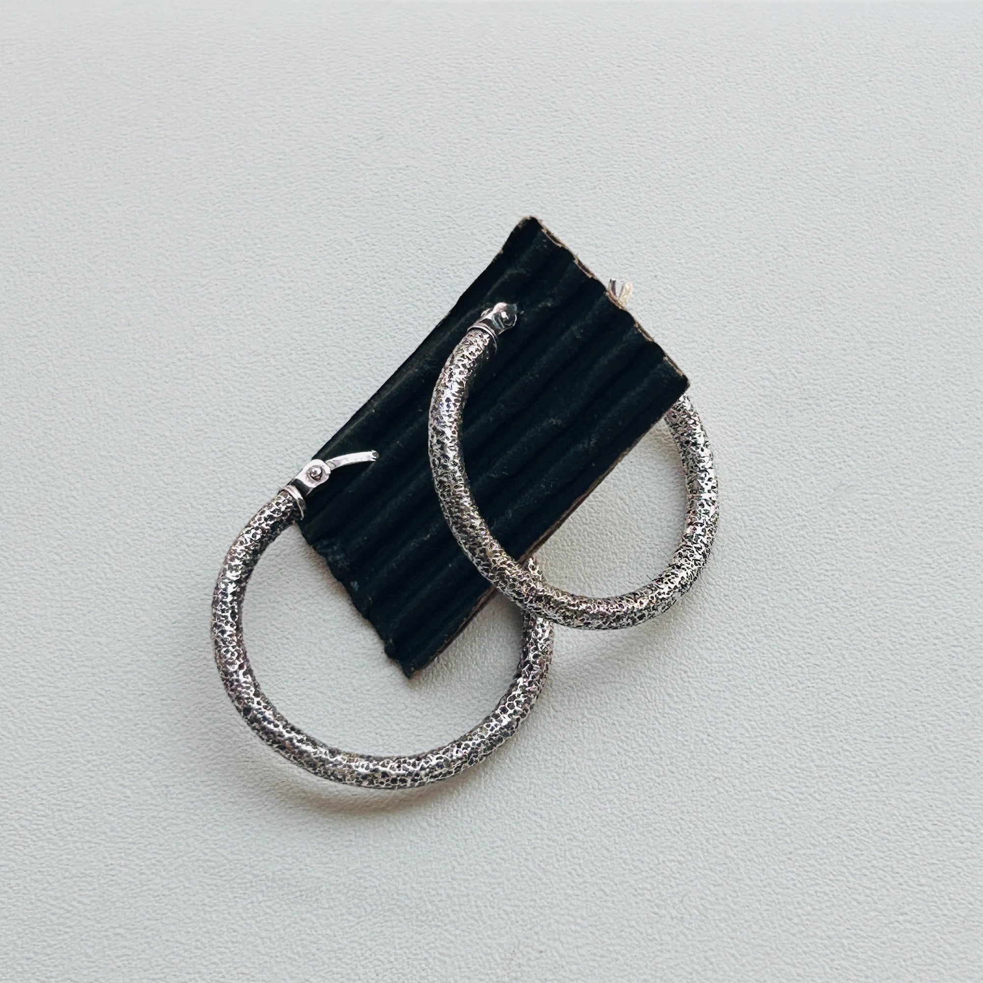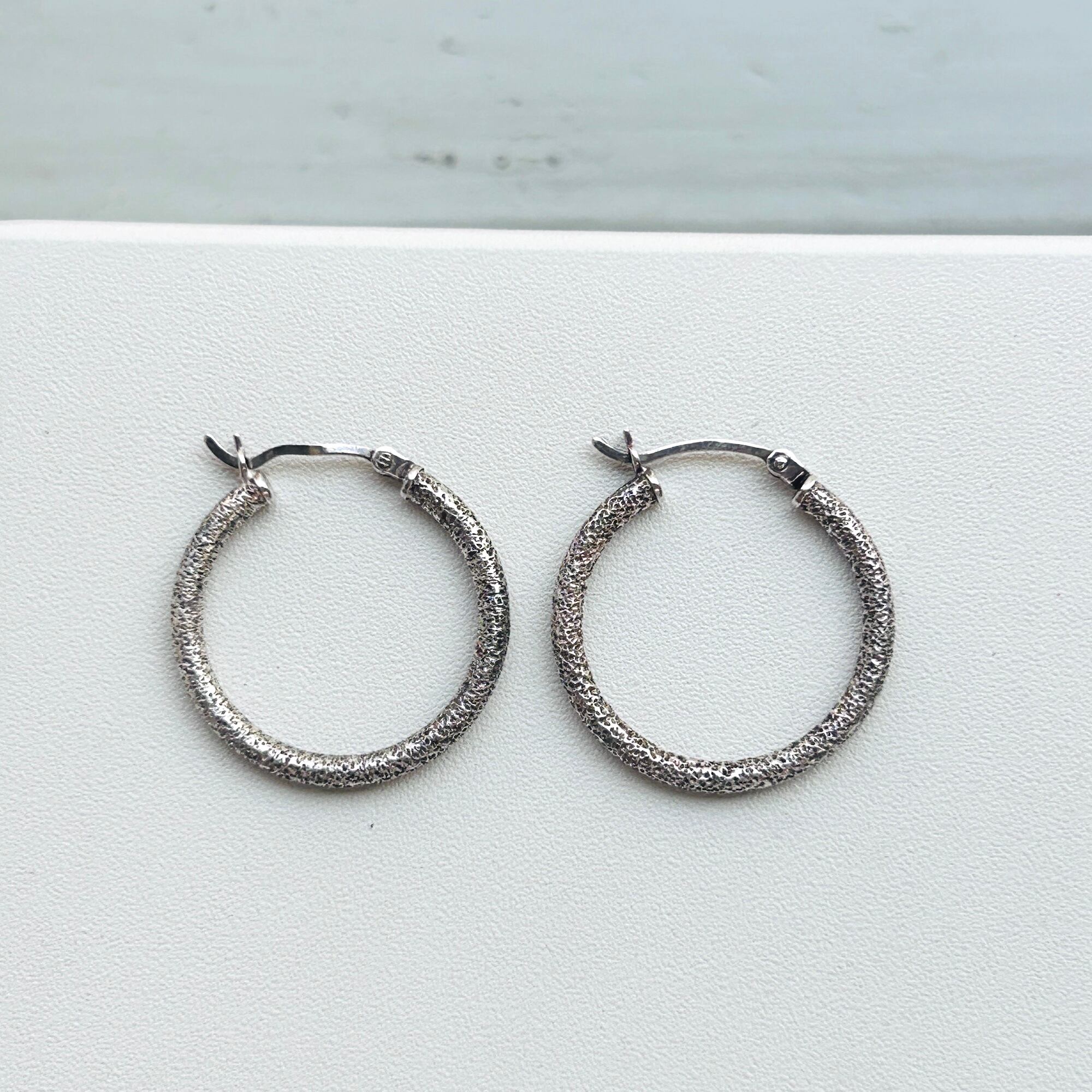 ラメのように細かいキラキラに見えるフープピアス。表面にとても細かい凹凸加工が施されている為、ギラギラ・ラメに見えます。メタリックグレーが小悪魔的にキュートなとても軽い着け心地のフープです。片方の針が少し歪んでいますが使用に問題ありません。針に「925」刻印。