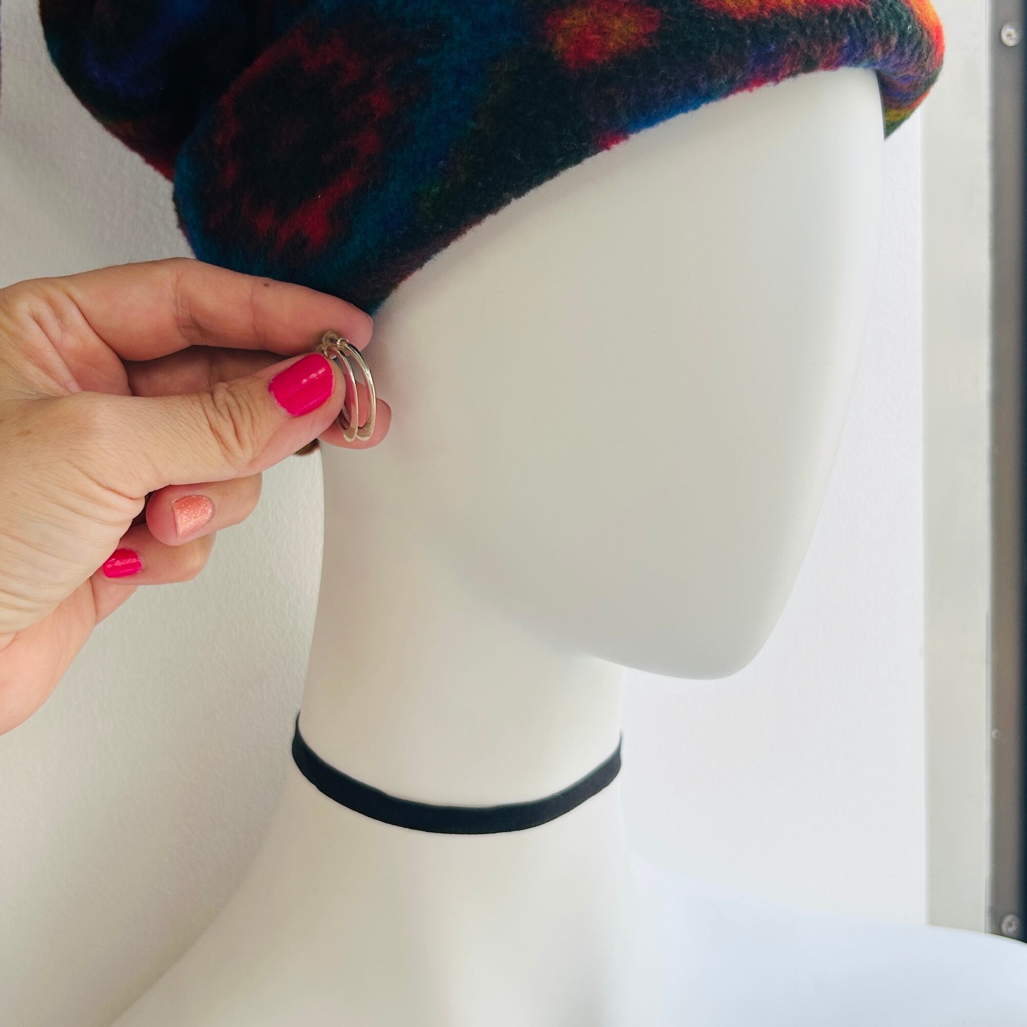フラットなミニピアス。フープではなく針を刺して留めるタイプ。正面から見ると薄いですがサイドから見るとフラット面がキラリと光ります。James Arveyというアメリカドメスティックブランド(創業1954年・テキサス州)のピアスです。現在もメイドイン・テキサス USA。アメリカ国内での評価の高いブランドです。フープ内側に「ARVEY STER」刻印、針に「Ag/Pd90」。