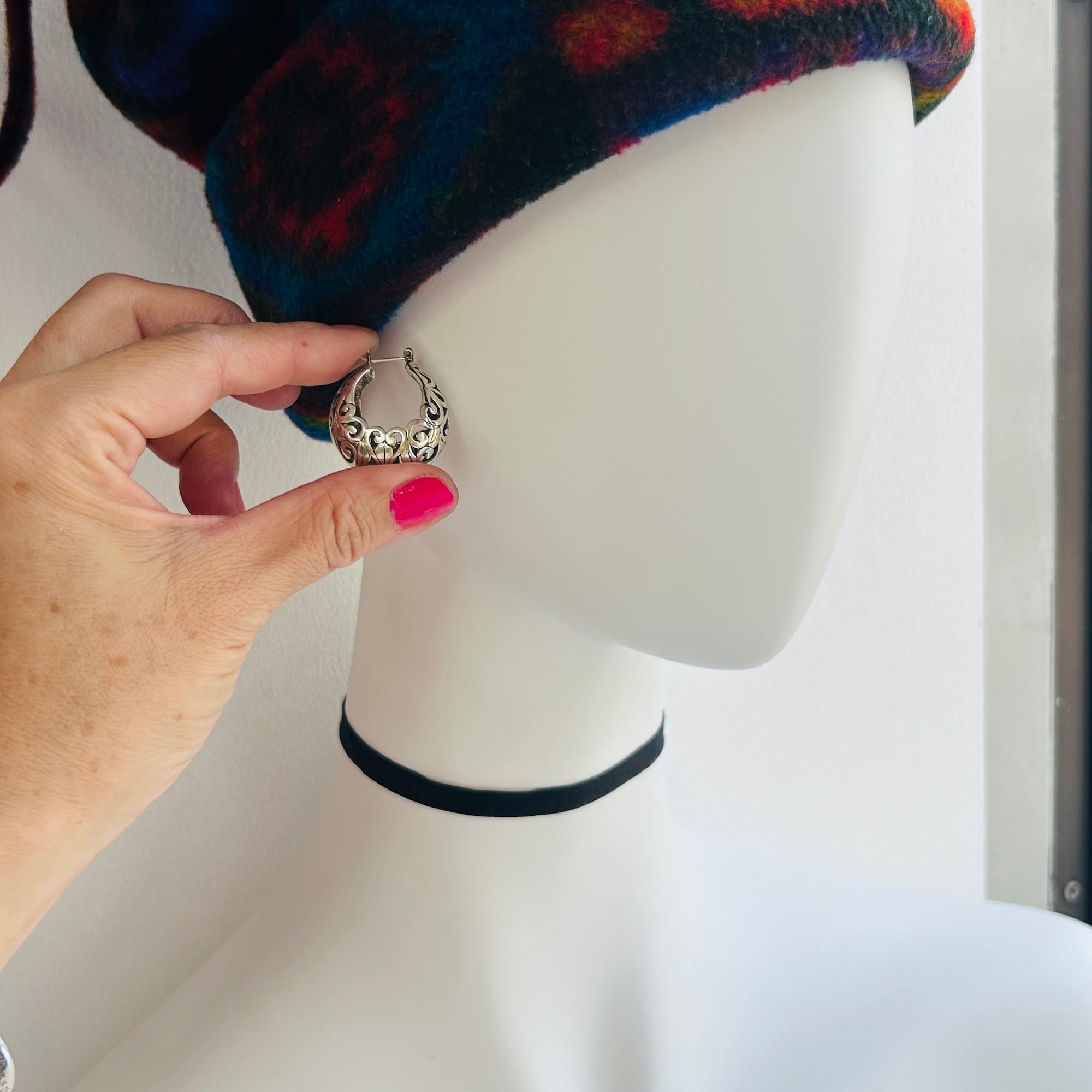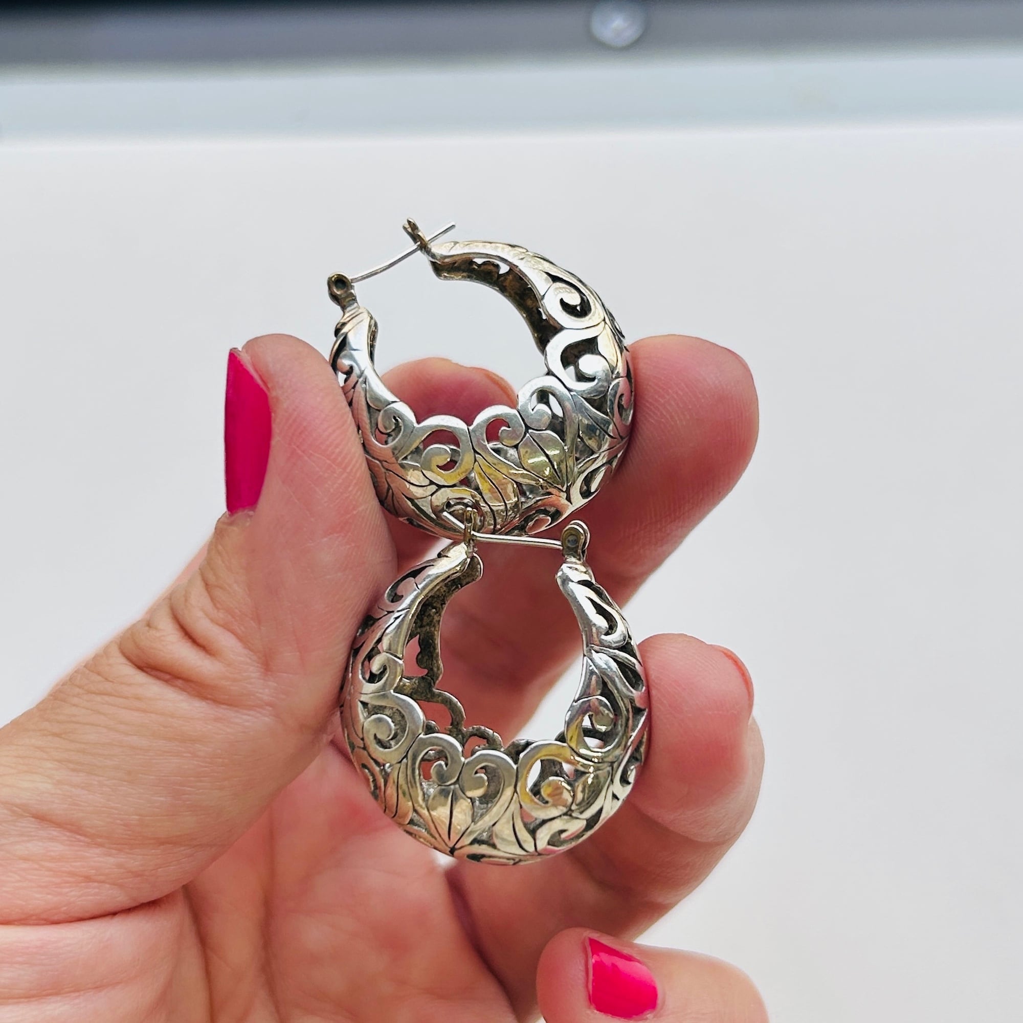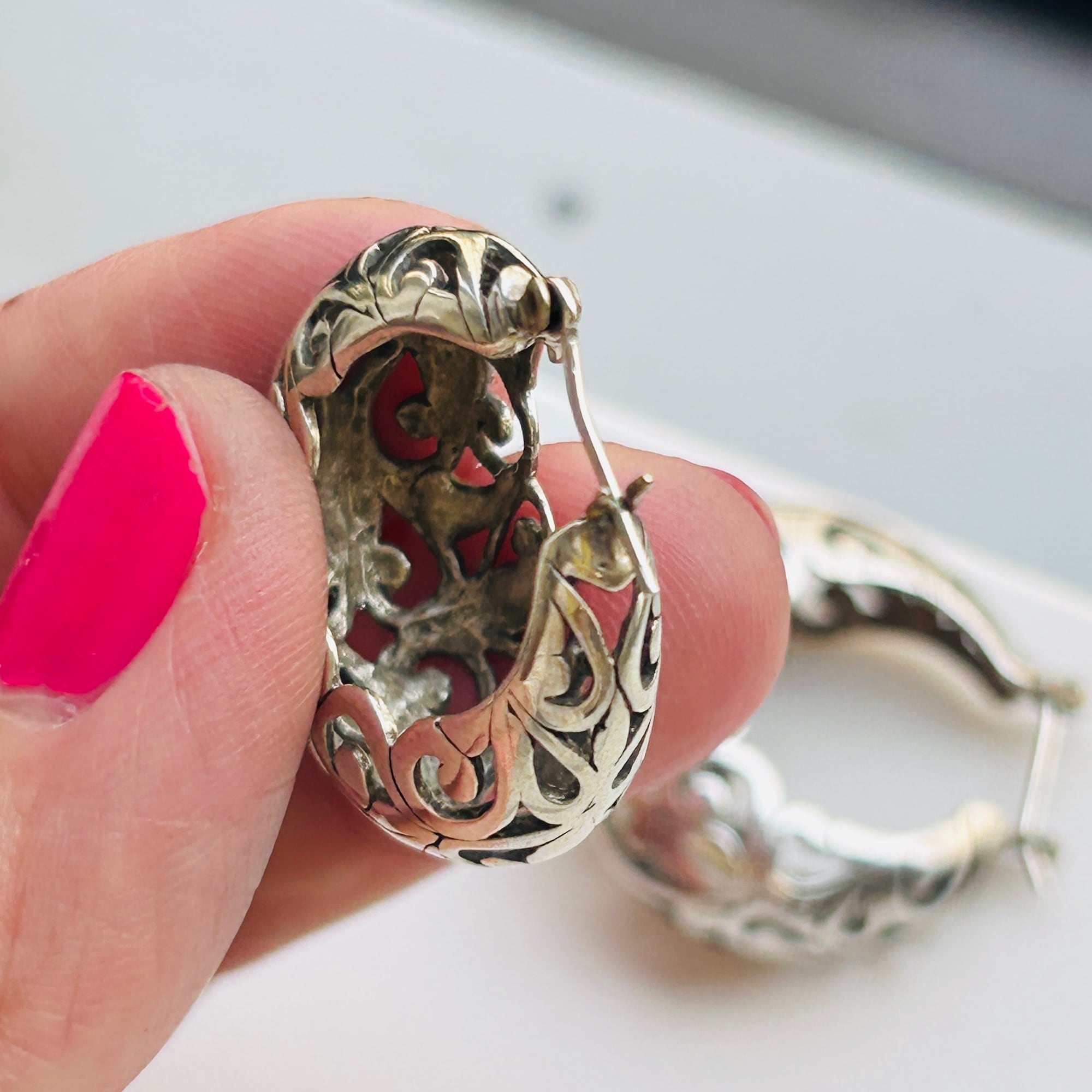 三日月型で大きく膨らんだ形にエスニックな透かし模様のシルバーピアス。凝ったデザインが目を惹く優雅で大人な雰囲気のピアスです。カリっとしたシャープなシルバーで上質さを感じます。内側に「STERLING」と「©︎Jalaine」。