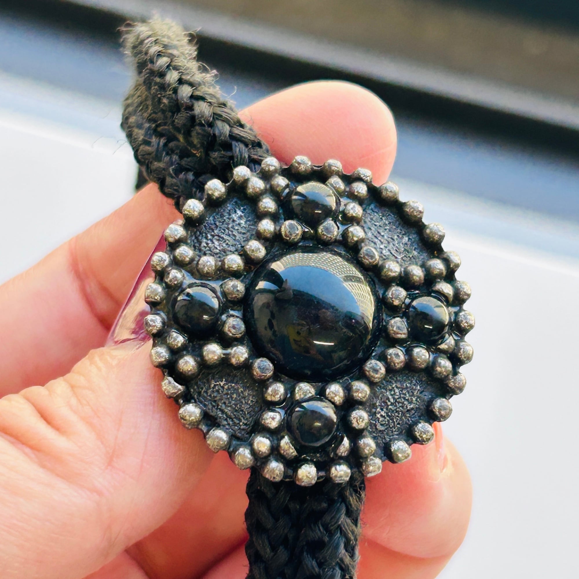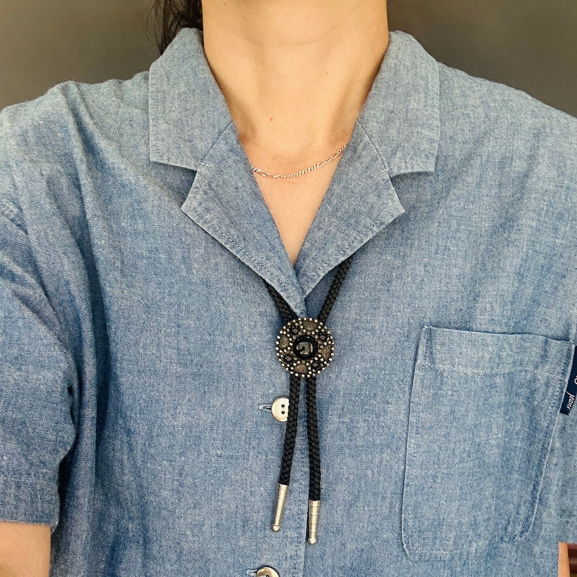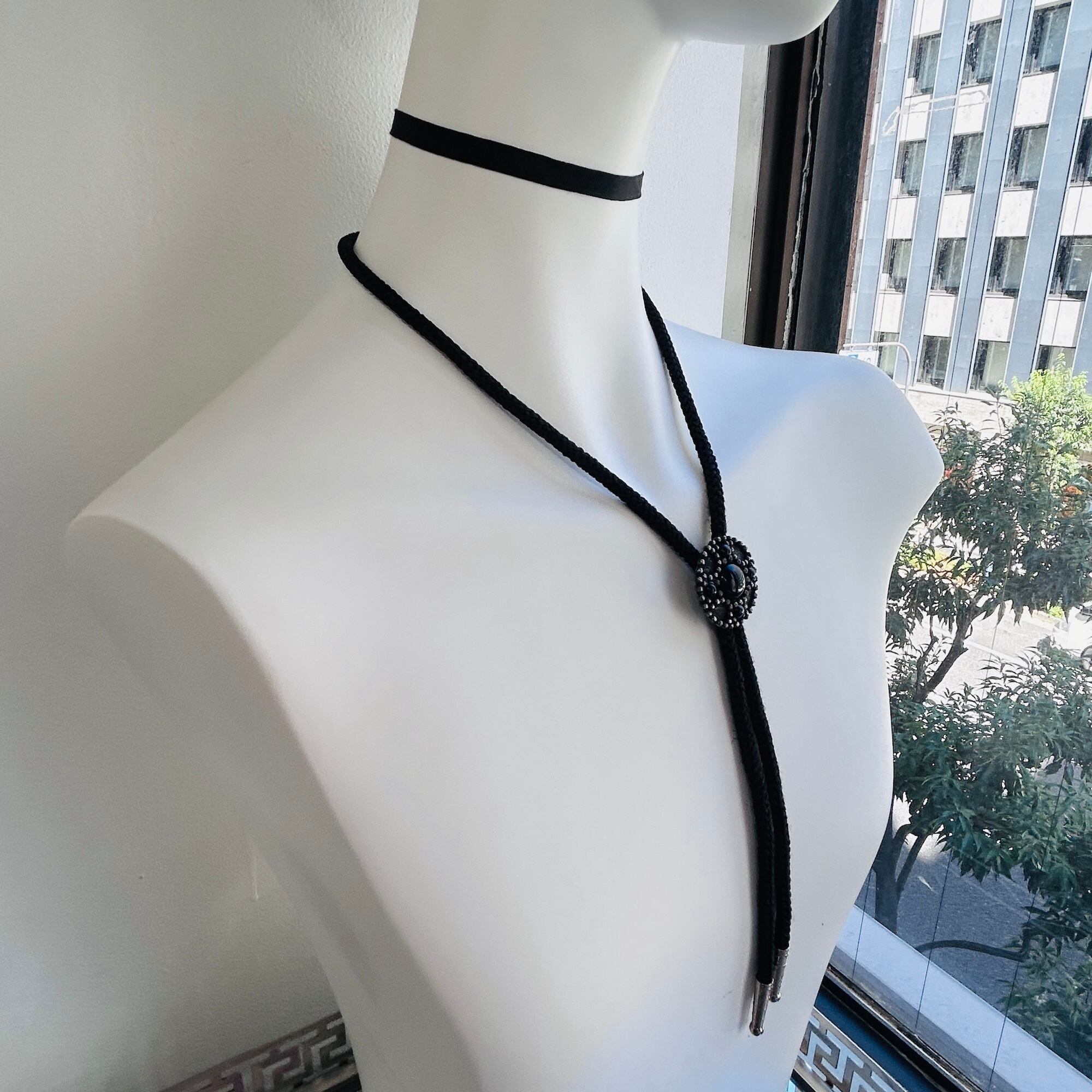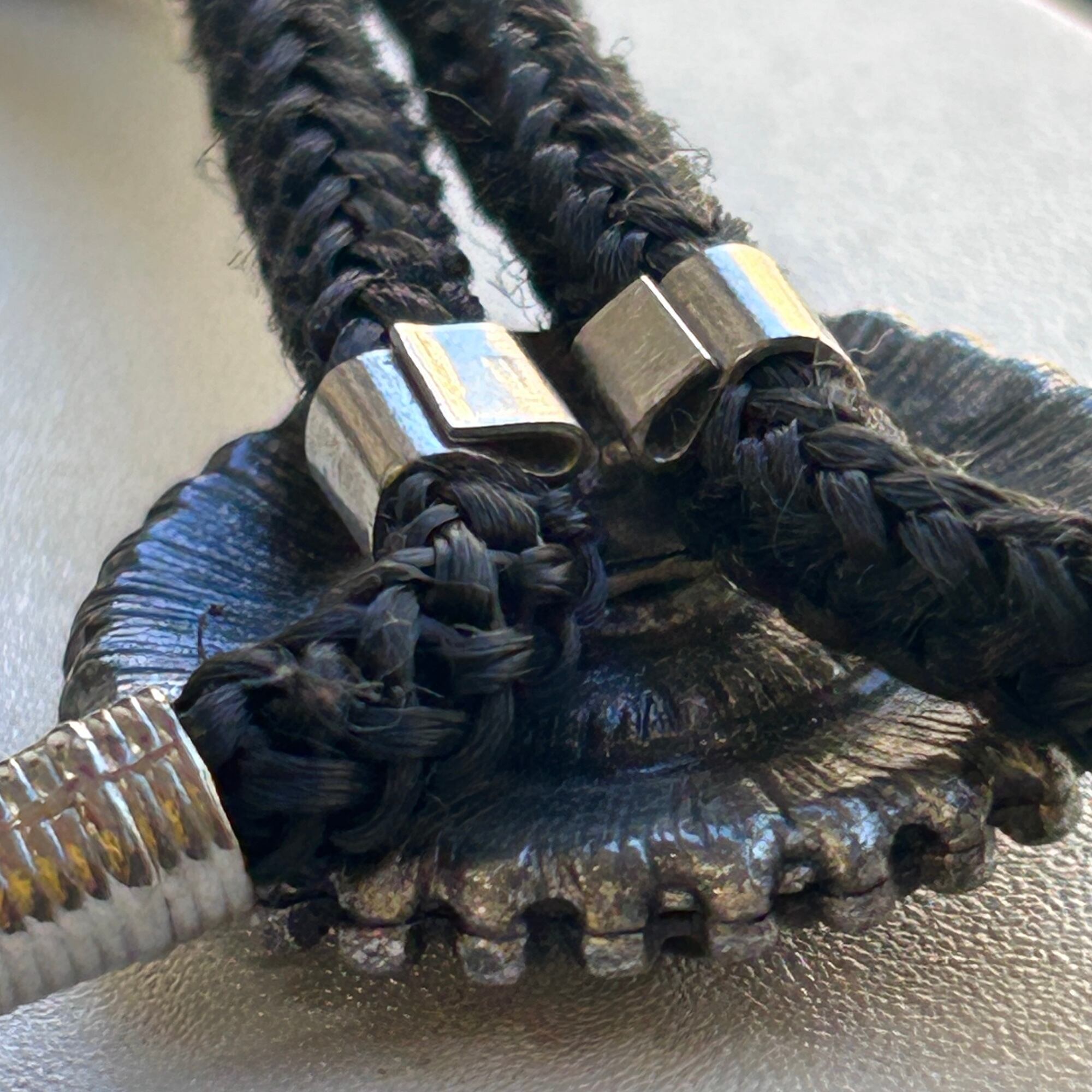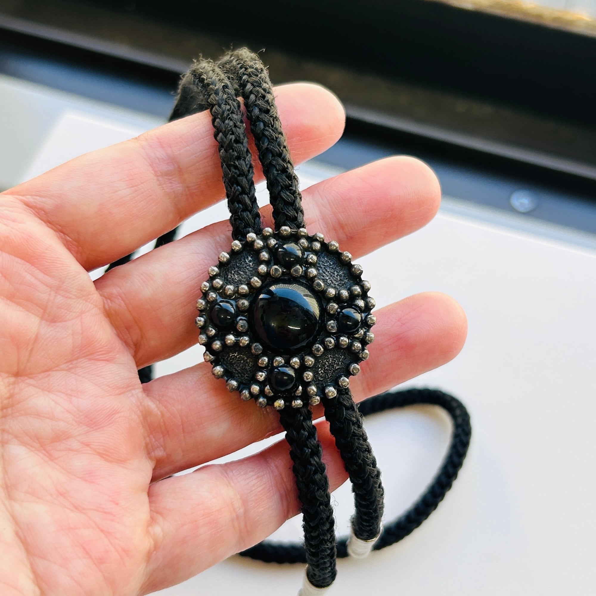 ブラックトーンで統一されたループタイ。ダークグレイ、銀古美カラーのシルバーメタルに黒いカボションがついた丸いモチーフはコスチュームジュエリーのようです。普通の黒いヒモが通っています。ヒモをスライドさせて着け外しをして下さい。紐を痛めないよう丁寧な金具の上げ下げが長く使って頂けるポイントです。ループタイ専用金具はメタルパーツに留められていて回転します。紐と金具の仕組みは写真13をご参照ください。