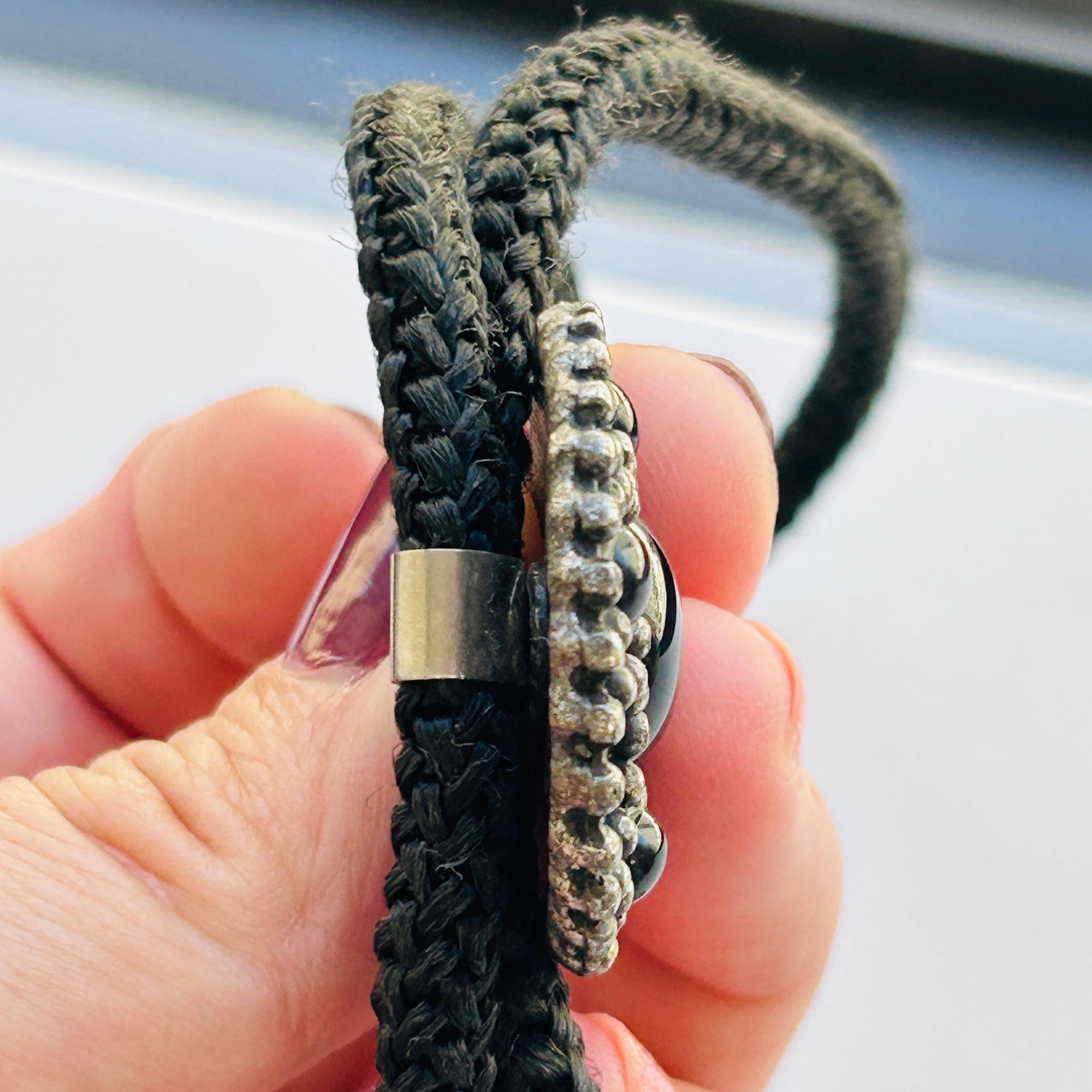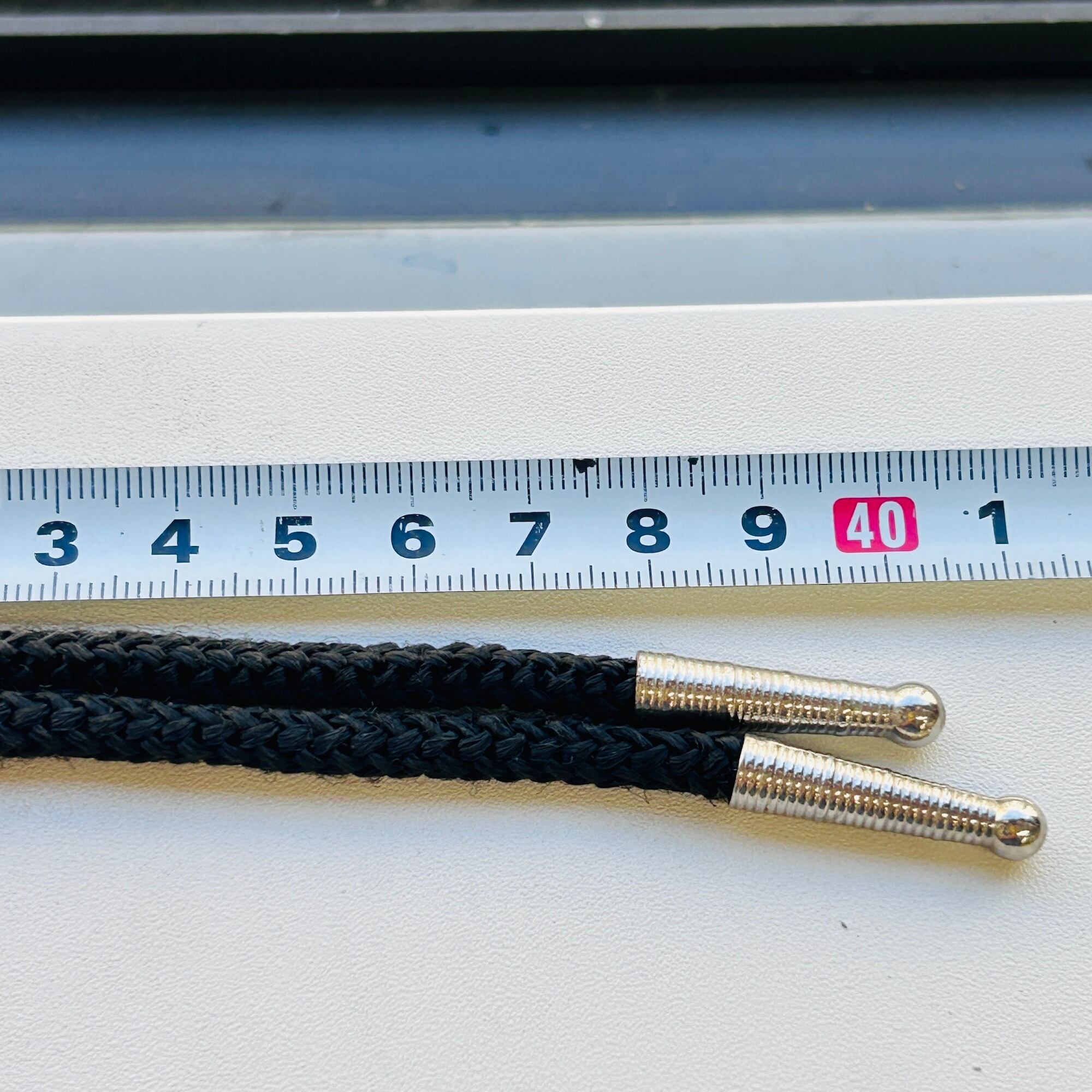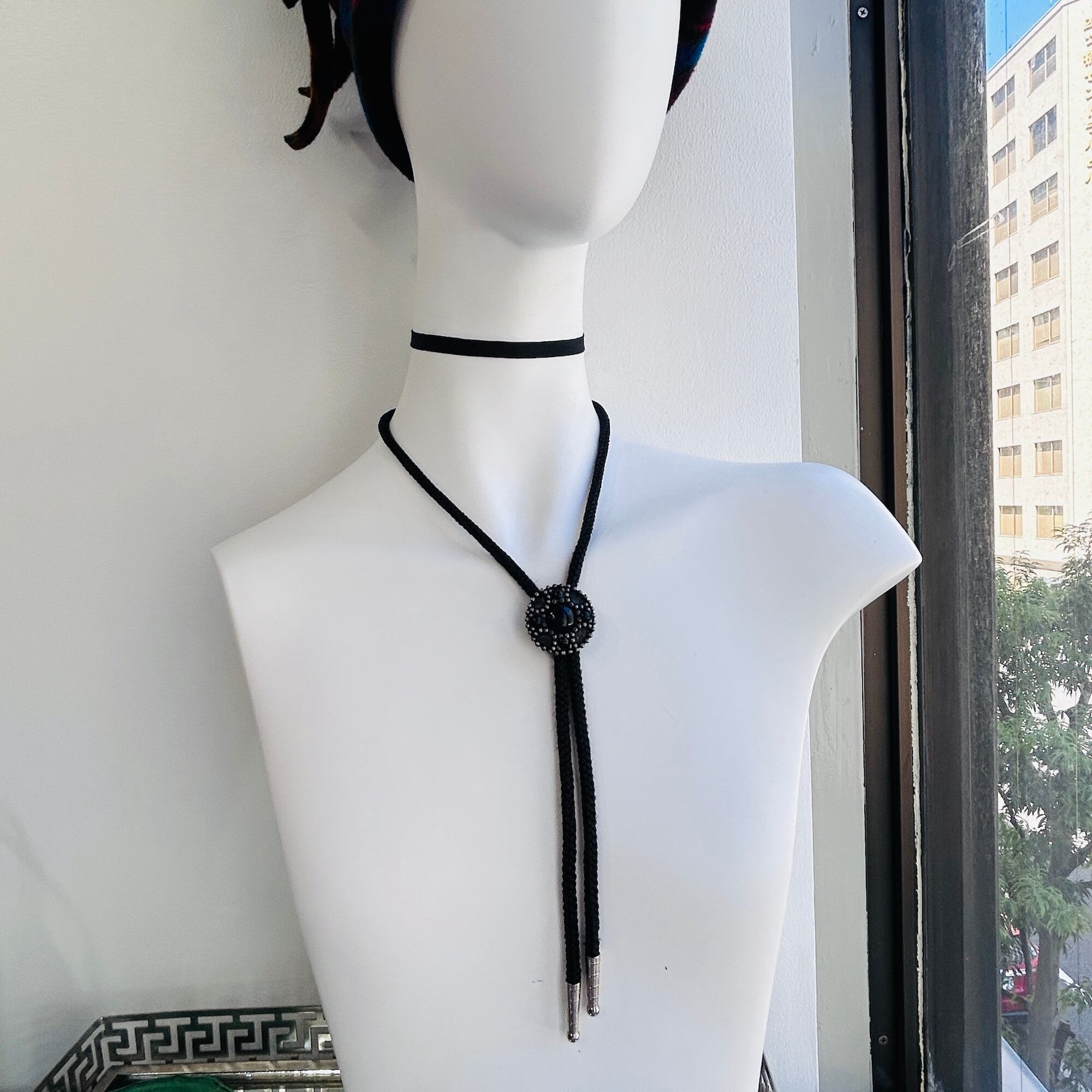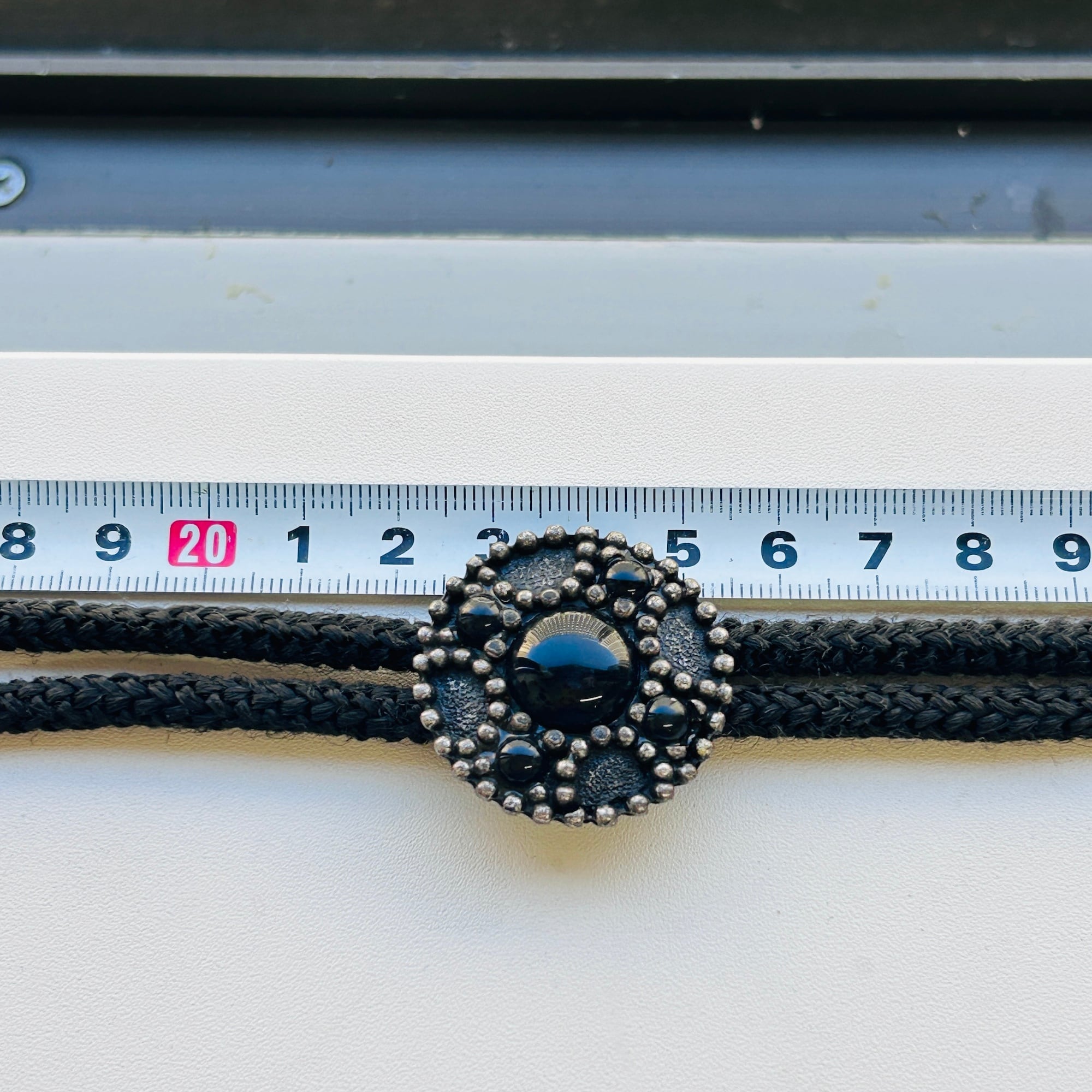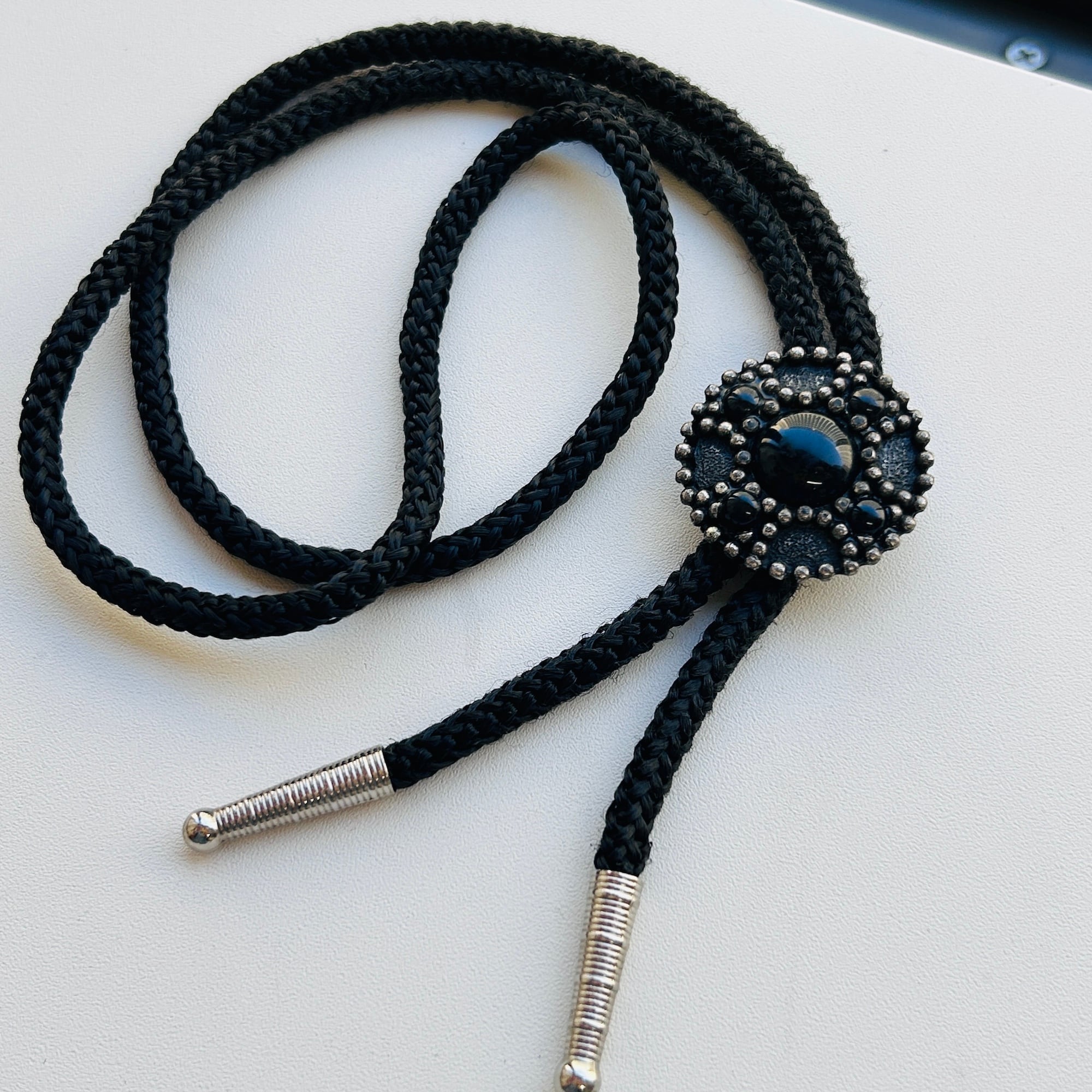 ブラックトーンで統一されたループタイ。ダークグレイ、銀古美カラーのシルバーメタルに黒いカボションがついた丸いモチーフはコスチュームジュエリーのようです。普通の黒いヒモが通っています。ヒモをスライドさせて着け外しをして下さい。紐を痛めないよう丁寧な金具の上げ下げが長く使って頂けるポイントです。ループタイ専用金具はメタルパーツに留められていて回転します。紐と金具の仕組みは写真13をご参照ください。