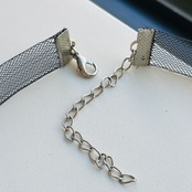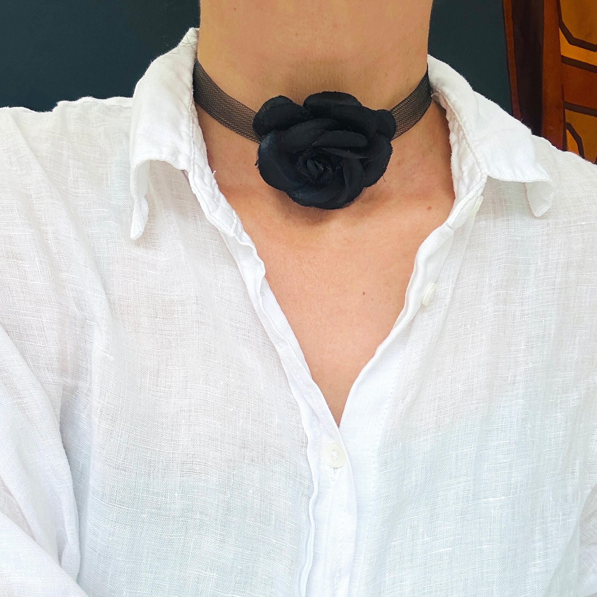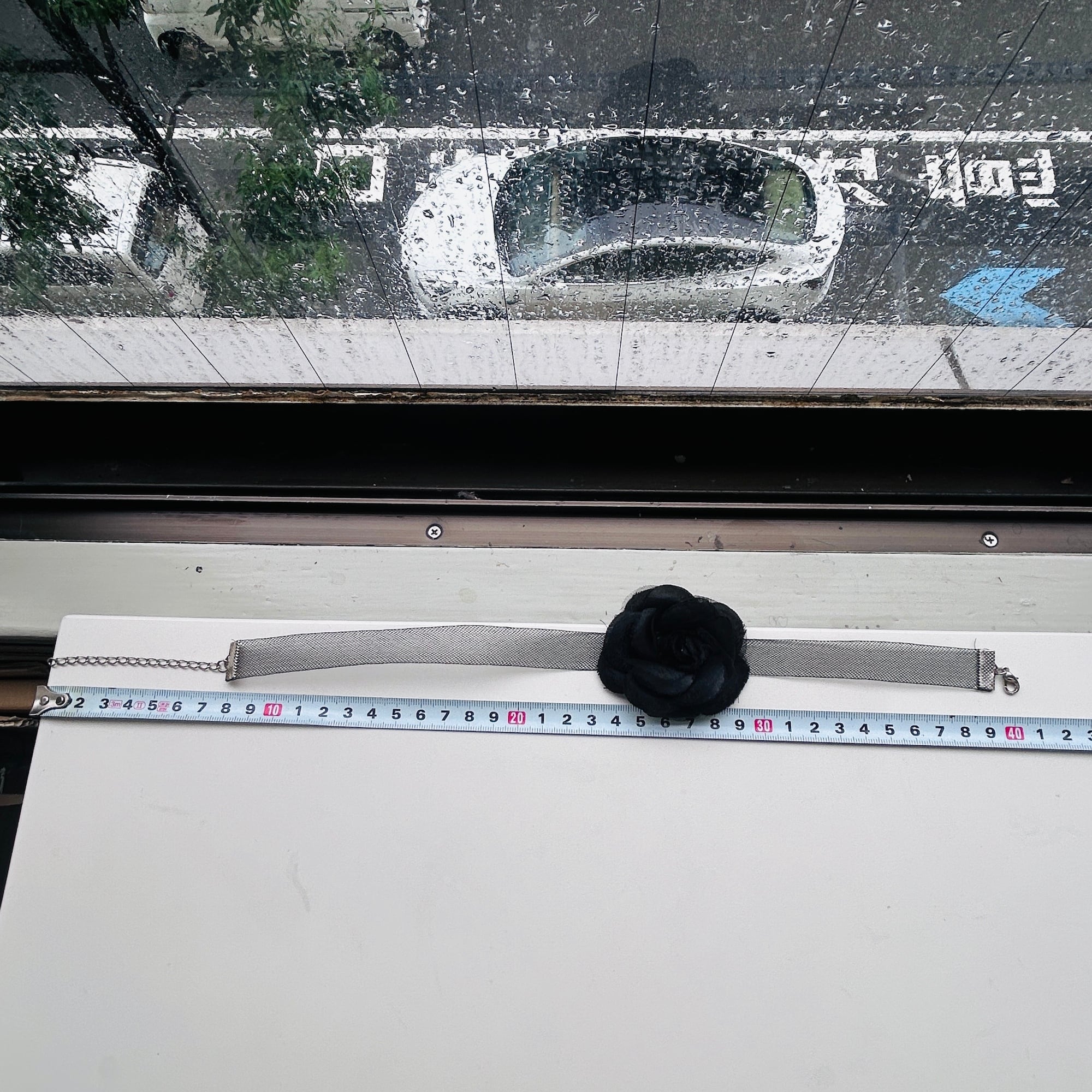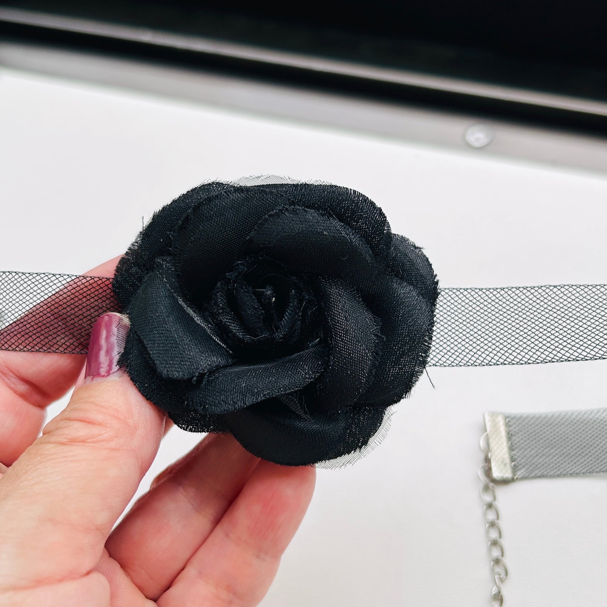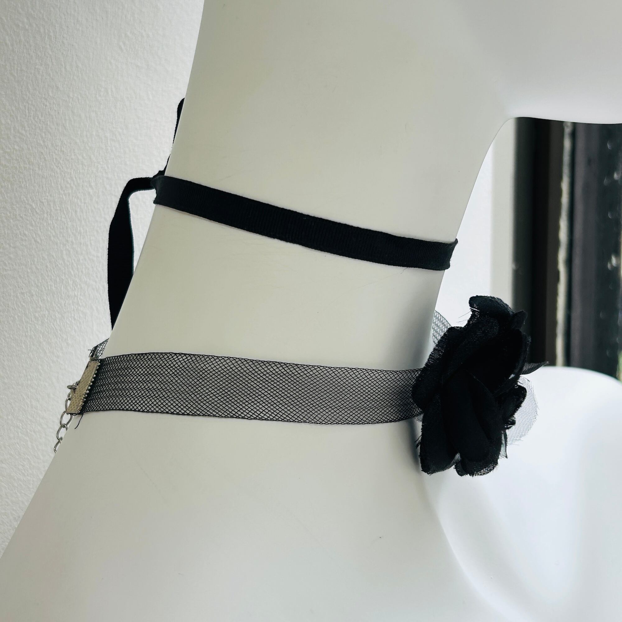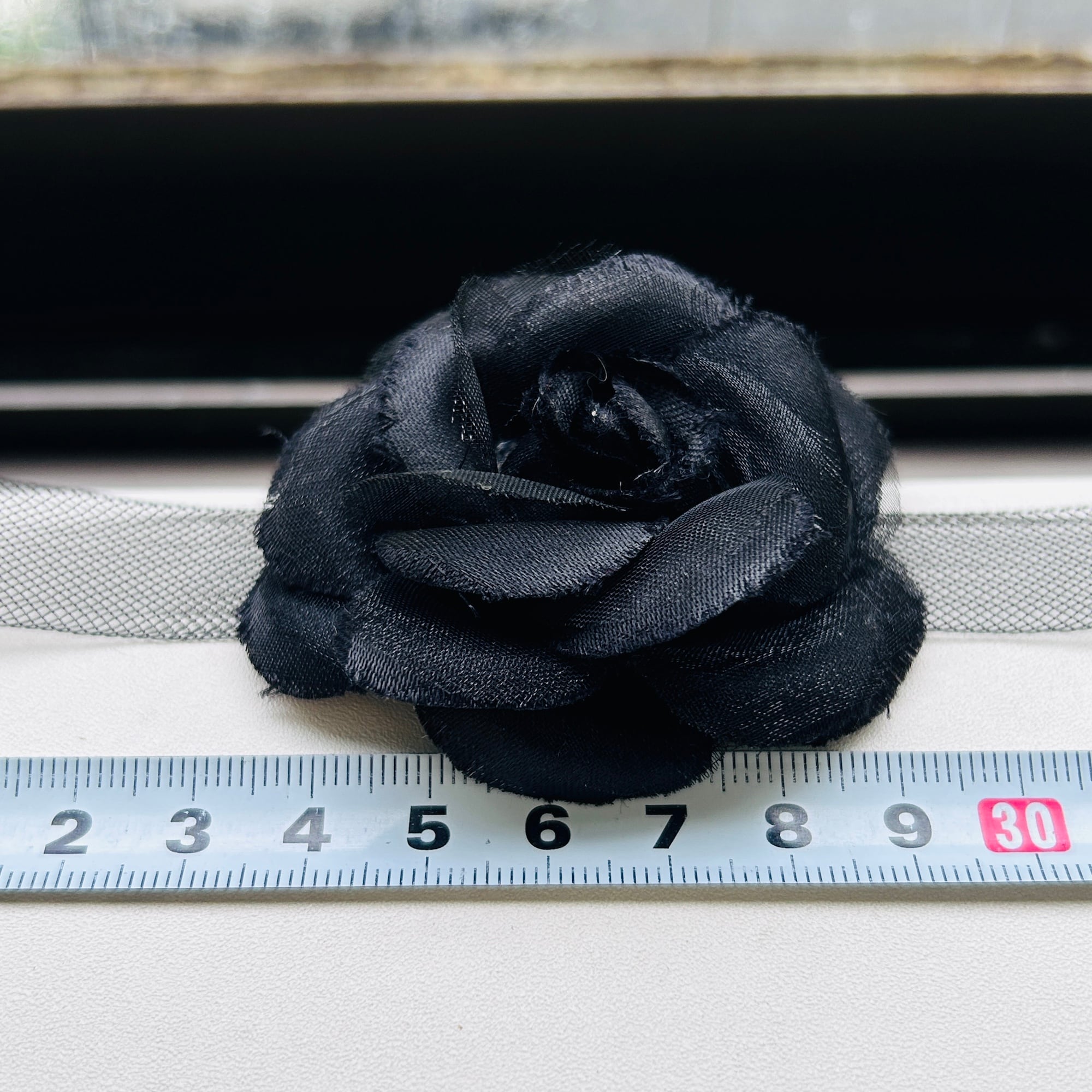 フランスから届いた黒いバラのファブリックチョーカー。シースルーのメッシュリボンが可愛いです。ハンドメイドのようなシンプルな作り。一番短く着けても少しゆとりある長さで首の付け根当たりに落ち着きます。試着で確認しましたが、これくらいゆとりがある方がアゴとの接触が少なく着けやすいと思います。シャツやタートルネックの上から着けても可愛いです。