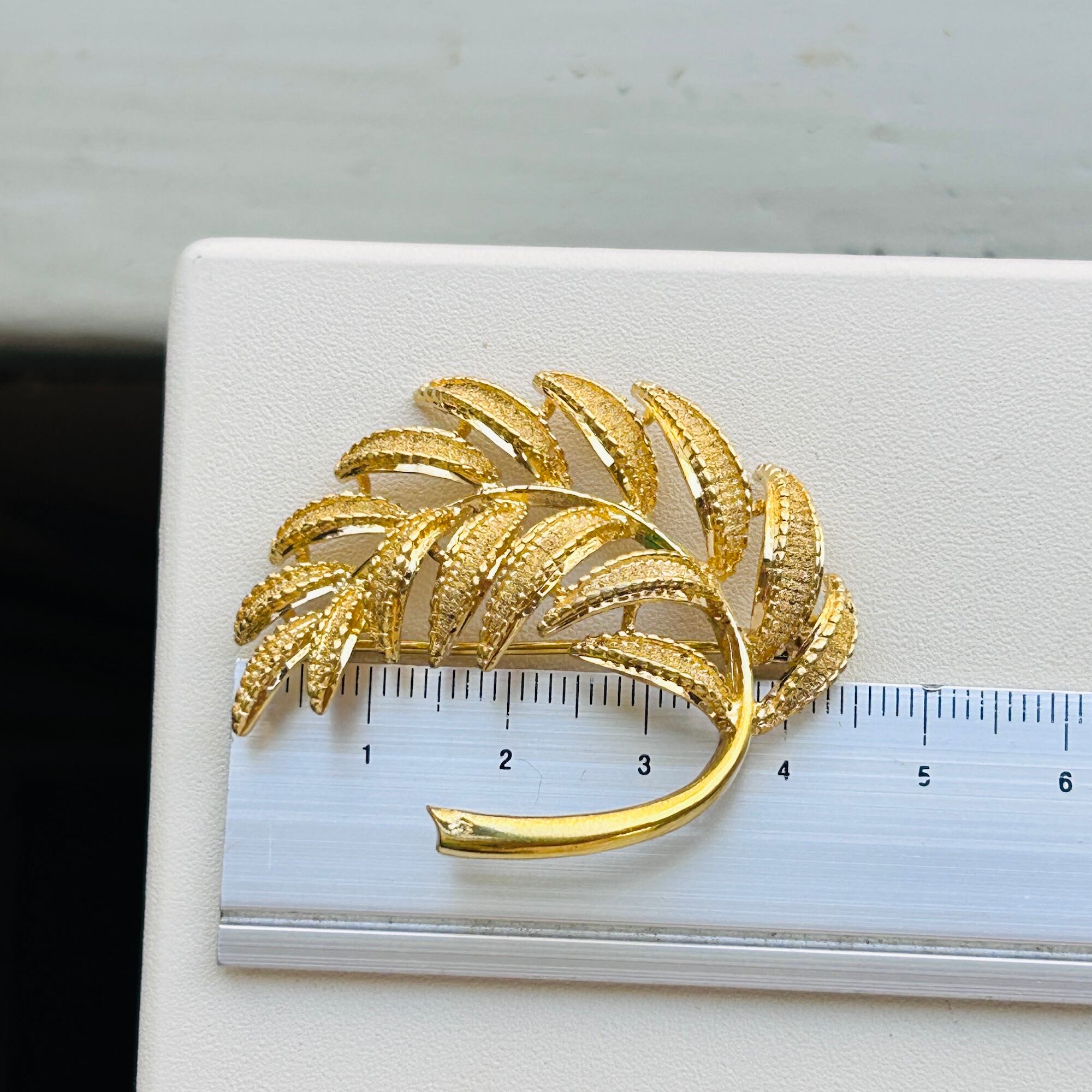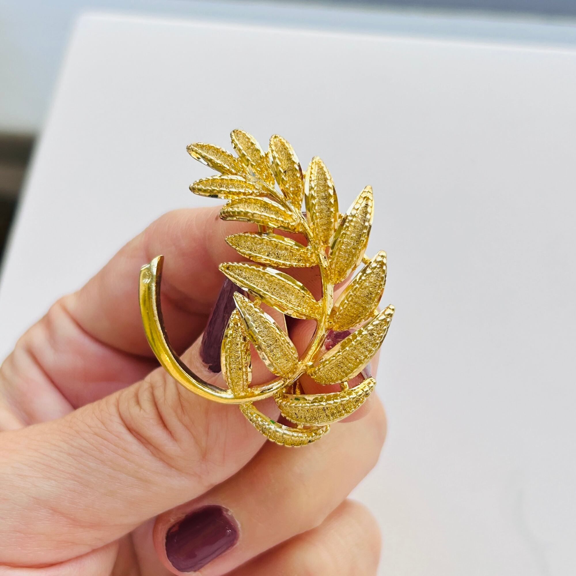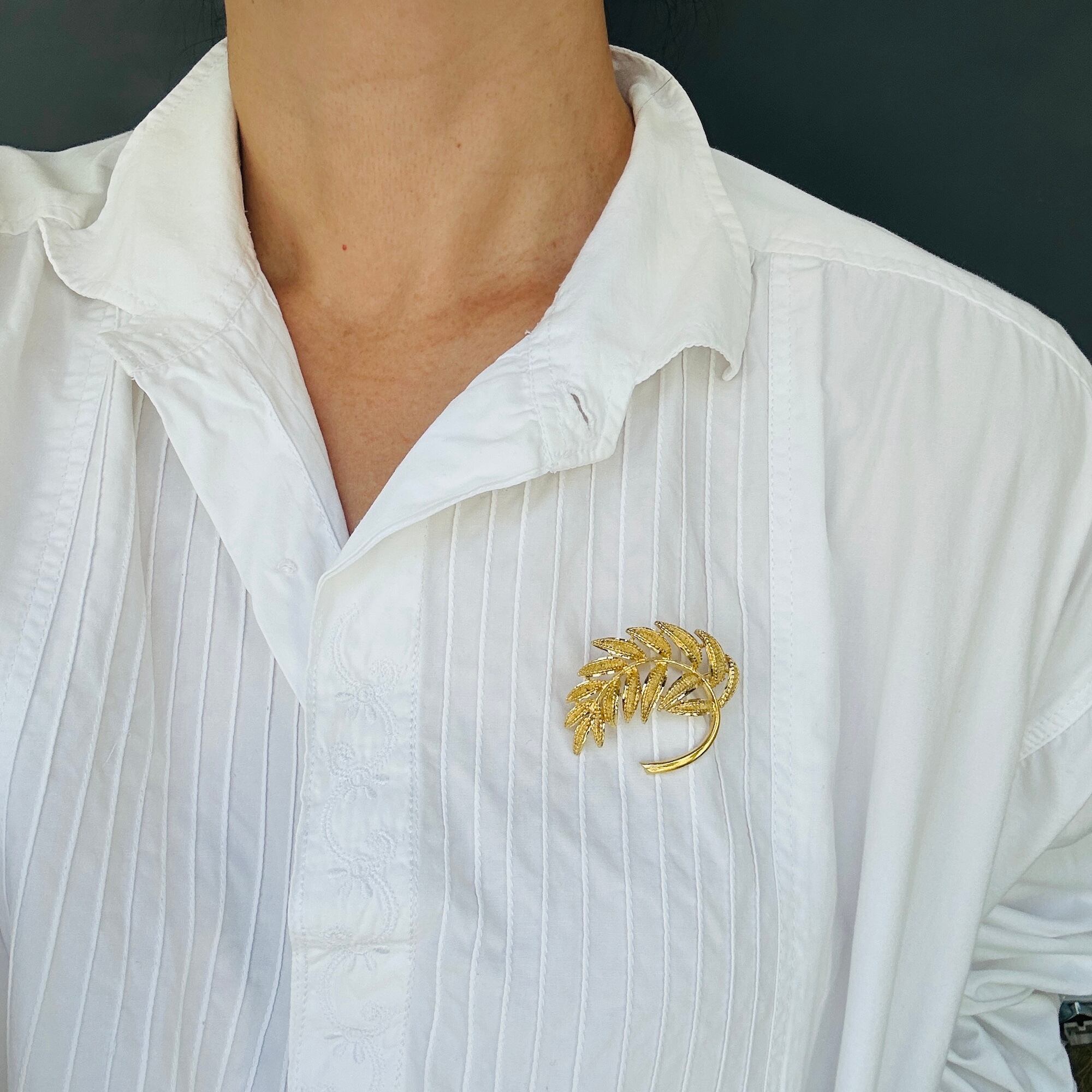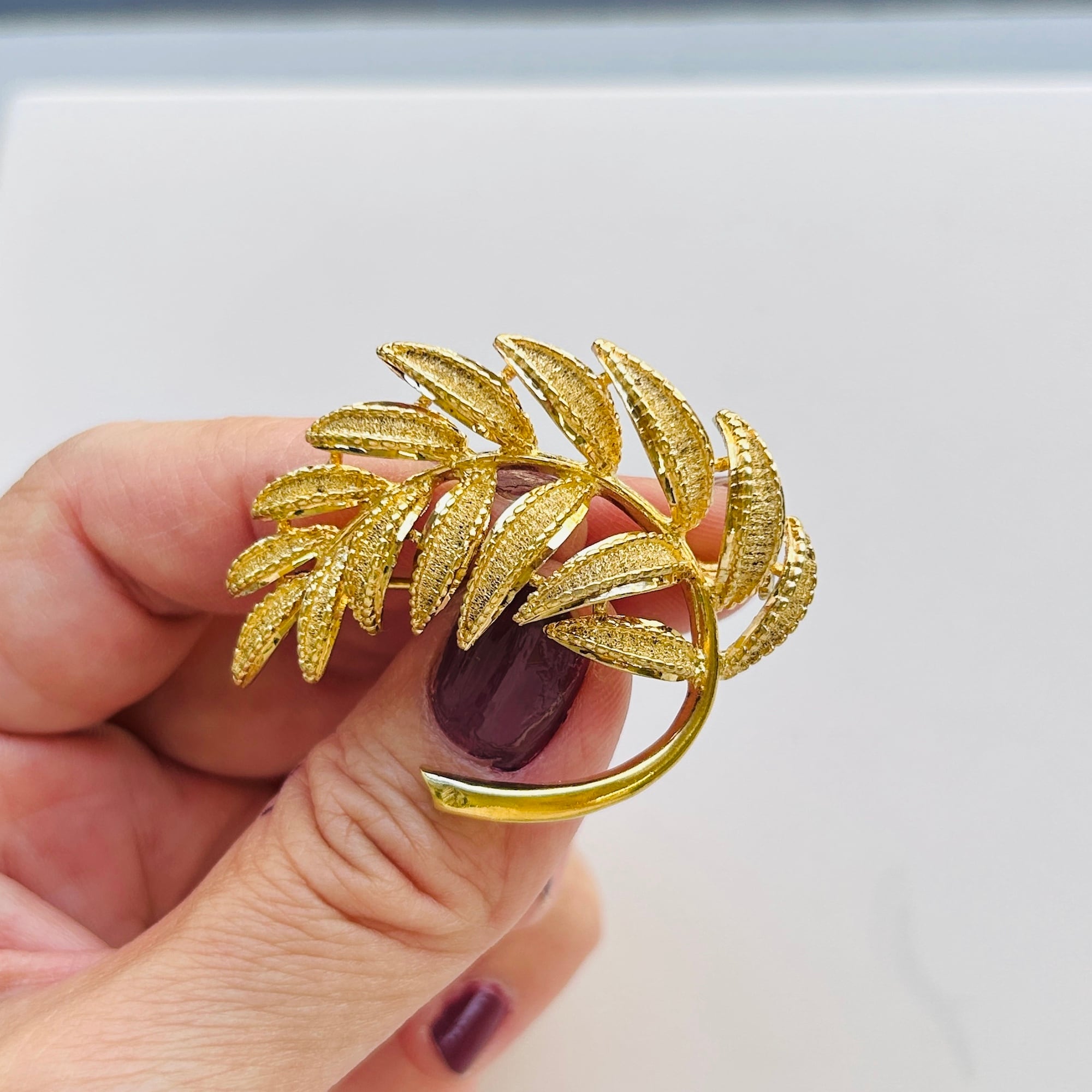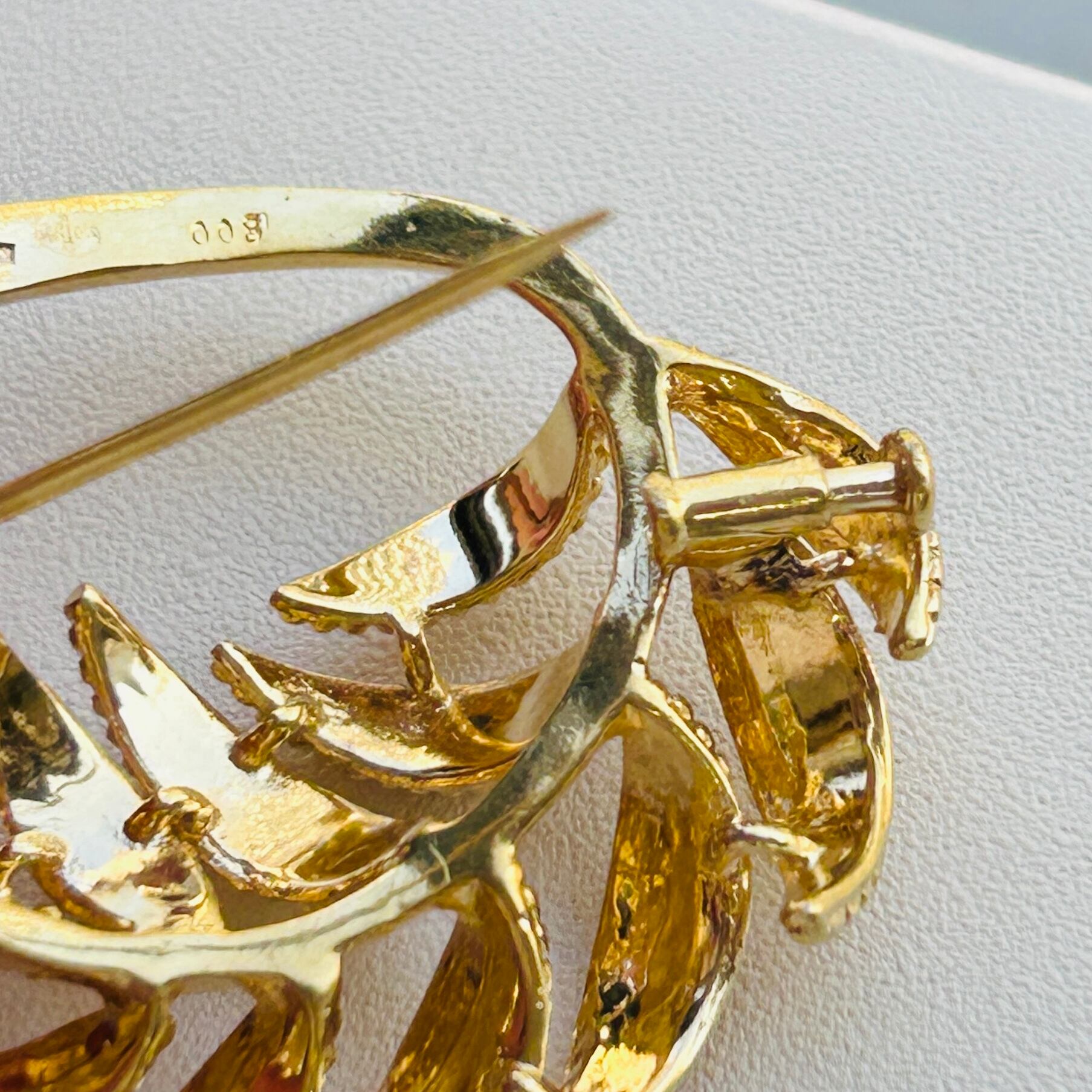 キラキラ輝くゴールドリーフブローチ。葉のフチに粒々フレーム、葉の表面は細かい凹凸プレスが施されて眩く輝いています。立体的でお洋服に映えるエレガントなデザインです。刻印は「Weevil」(フランスへのインポートマーク・1893-1984)、「800」(シルバー800)、「V」。「V」はシルバー800にゴールドヴェルメイユ(Gold Vermeil)であることを示す刻印です。表側にも小さな刻印が1つ。針は鉄砲式金具です。丸筒シリンダーを引いて針先を入れてシリンダーを押して閉じて下さい。どの向きでも楽しめそうですが金具のシリンダーが左側又は下向きが着けやすいです。