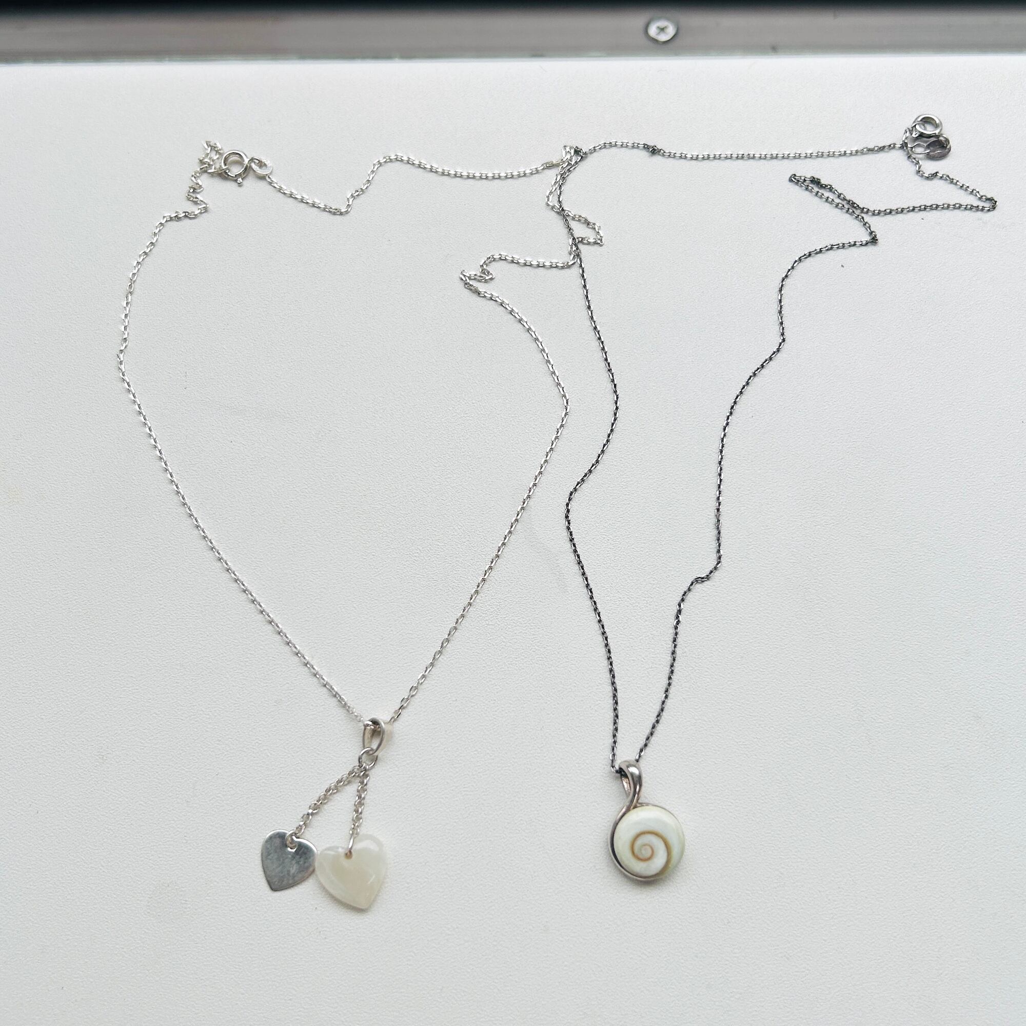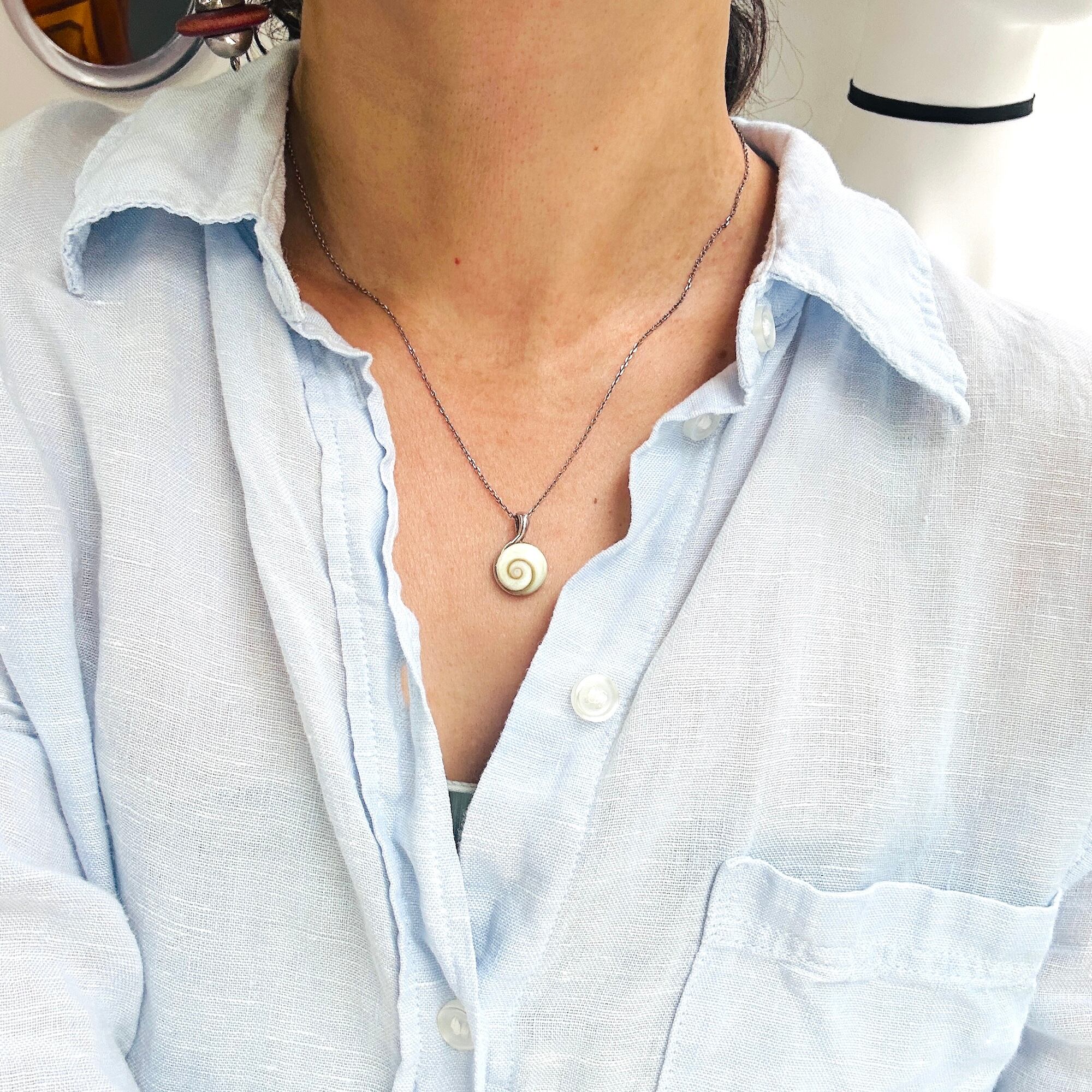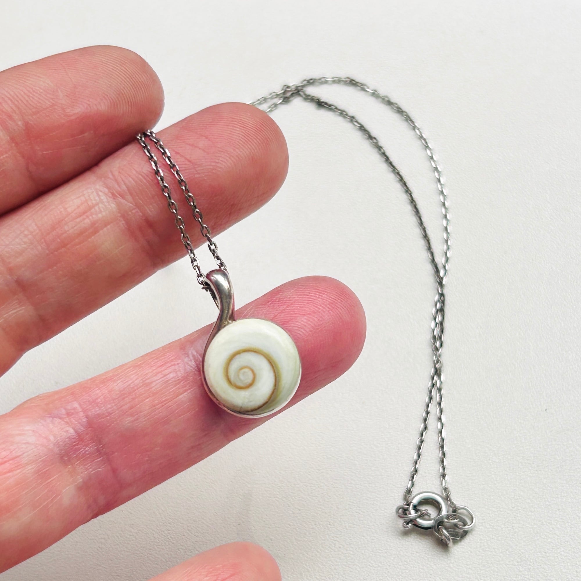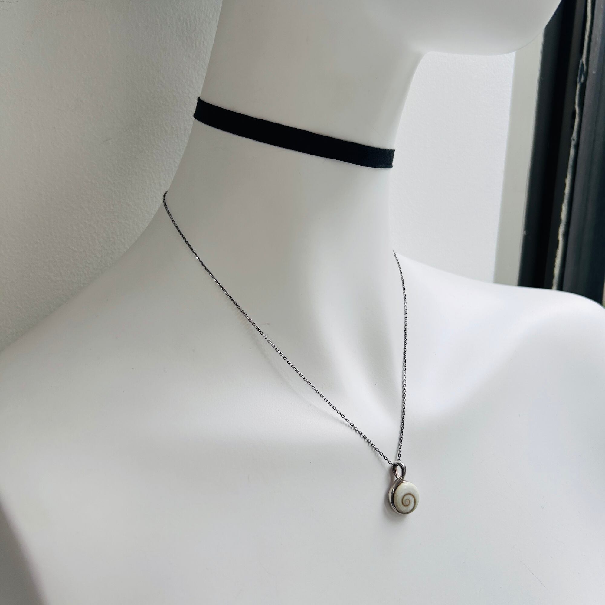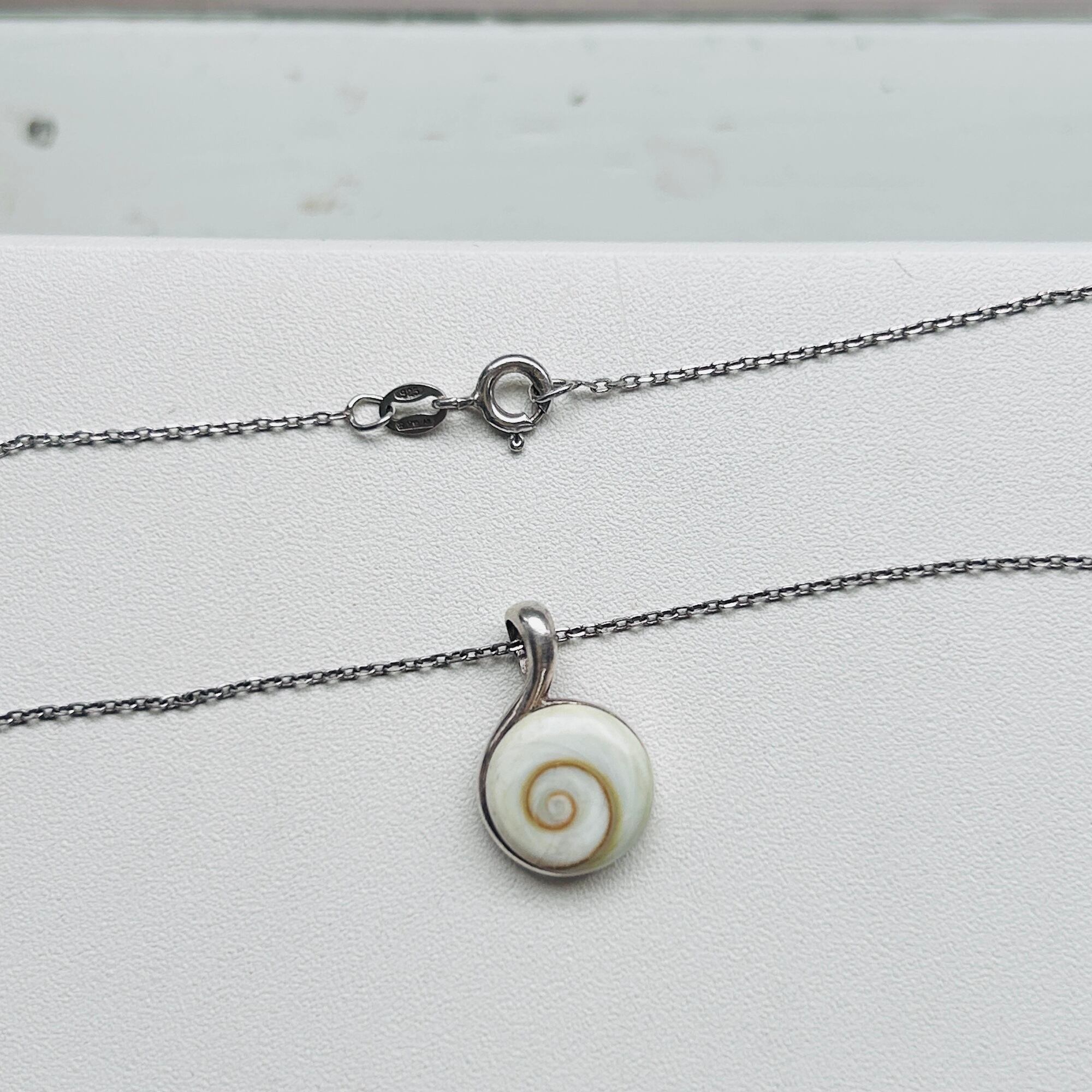 神秘的なシェルチャームのネックレス。シェルは「St.Lucy's eye」「シヴァアイ」などと呼ばれる巻き貝です。白にベージュが混じり合った自然色が素敵です。シェルを囲むシルバーフレームから少しねじれて出ているベイルも素敵です。ベイル内径は4mm x 3mm。結構大きいのでフィガロやキヘイと合わせてもカッコいいですし、お手持ちのネックレスと重ねてジャラジャラ着けるのも海外っぽくて素敵だと思います。チャームに「925」、チェーンに「925」とイタリアンシルバーマーク。