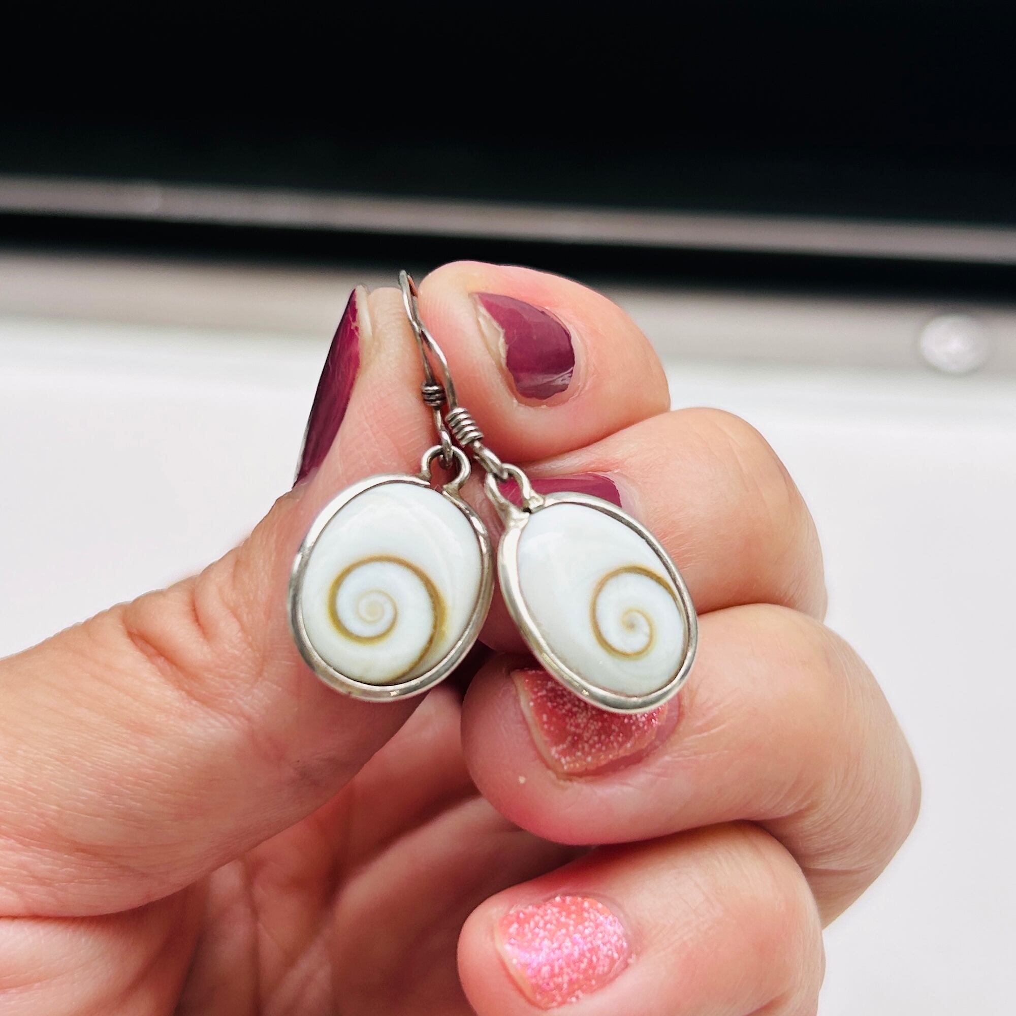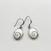 「St.Lucy's eye」「シヴァアイ」などと呼ばれる巻き貝のフックピアス。爽やかなホワイトカラーのシェルです。裏側もナチュラルな模様です。カタホウノフックは少し歪んでいますが使用に問題ありません。フックに「925」。
