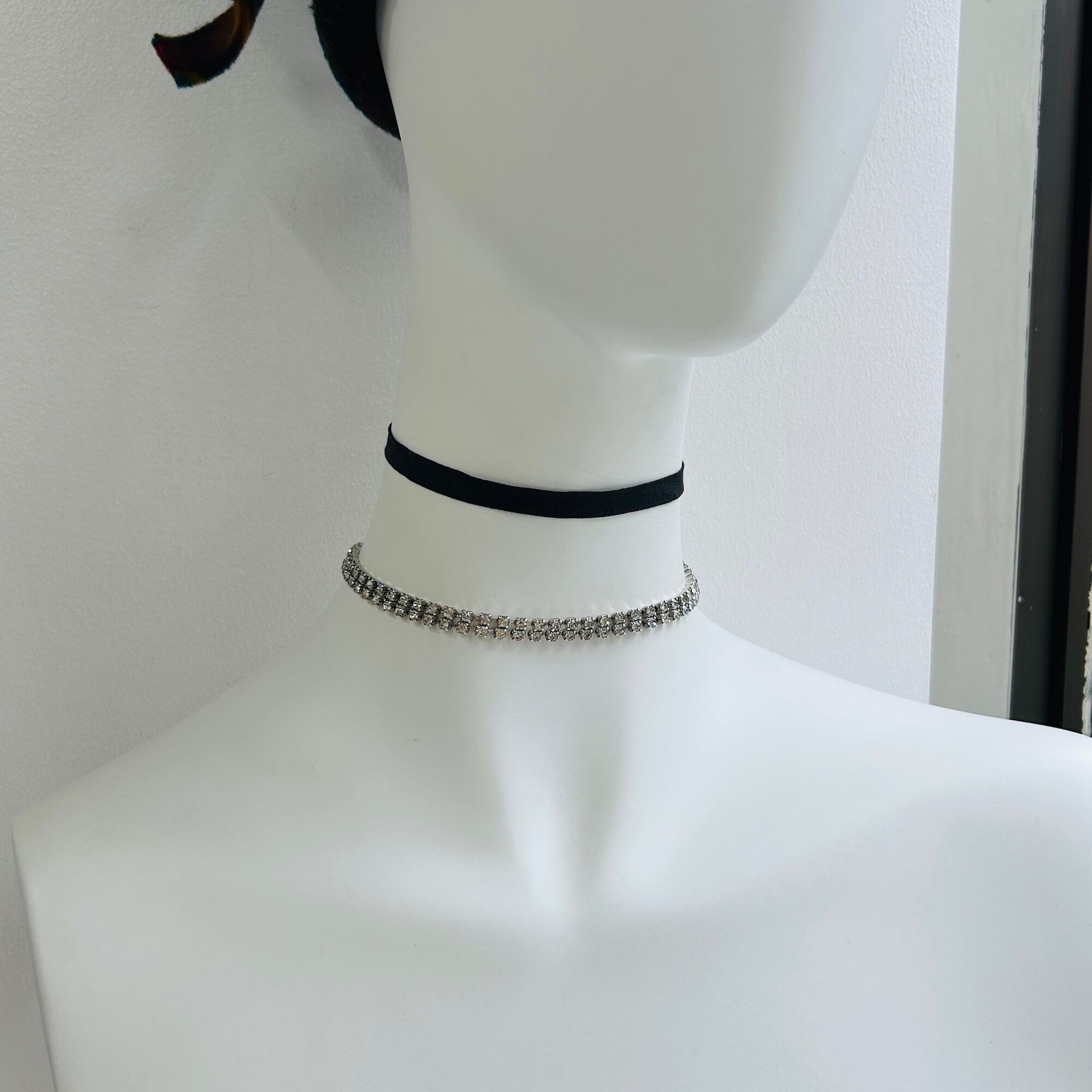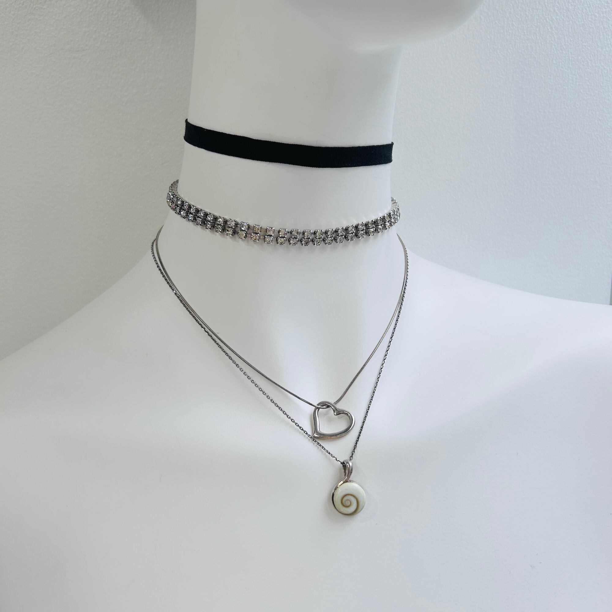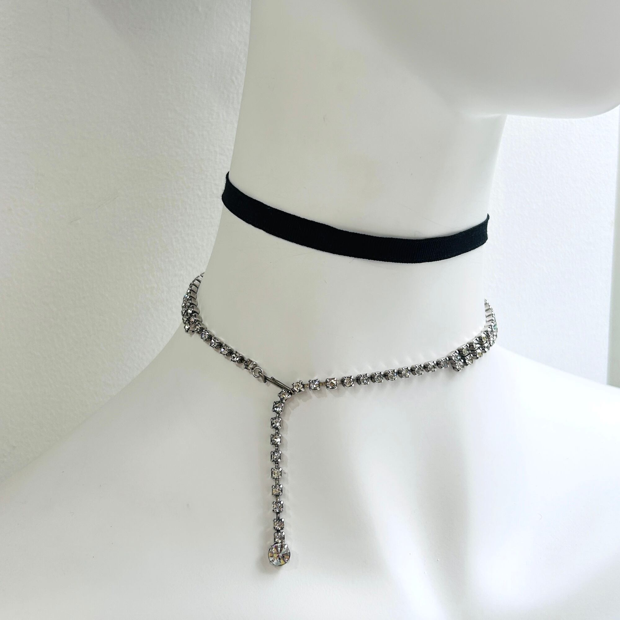 シンプルなラインストーンチョーカー。前面は2列になっていて2箇所接着されています。引っ掛けるだけのJフックはラインストーンが垂れ下がって後ろ姿もキレイに見えます。シャツだと見えないですが、、クルーネックやタートルネックは是非アップスタイルで:):)フックはストーンとストーンの間に背面から引っ掛けて下さい(写真5)。使用感のないキレイなお品です。シルバーネックレスとの重ね着けもオススメです。